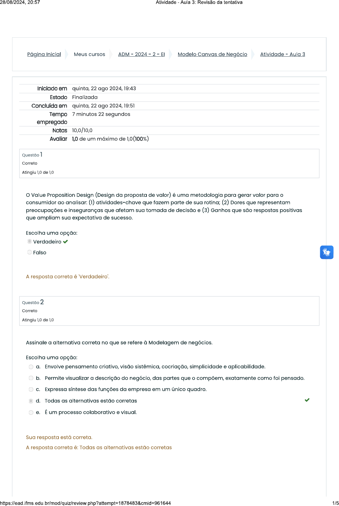 <p>28/08/2024, 20:57 Atividade - Aula 3: Revisão da tentativa Página Inicial Meus cursos ADM - - Modelo Canvas de Negócio Atividade - Aula 3 Iniciado em quinta, 22 ago 2024, 19:43 Estado Finalizada Concluída em quinta, 22 ago 2024, 19:51 Tempo 7 minutos 22 segundos empregado Notas 10,0/10,0 1,0 de um máximo de 1,0(100%) Questão 1 Correto Atingiu 1,0 de 1,0 Value Proposition Design (Design da proposta de valor) é uma metodologia para gerar valor para o consumidor ao analisar: (1) atividades-chave que fazem parte de sua rotina; (2) Dores que representam preocupações e inseguranças que afetam sua tomada de decisão e (3) Ganhos que são respostas positivas que ampliam sua expectativa de sucesso. Escolha uma opção: Verdadeiro Falso A resposta correta é Questão 2 Correto Atingiu 1,0 de 1,0 Assinale a alternativa correta no que se refere à Modelagem de negócios. Escolha uma opção: a. Envolve pensamento criativo, visão sistêmica, cocriação, simplicidade e aplicabilidade. b. Permite visualizar a descrição do negócio, das partes que o compõem, exatamente como foi pensado. C. Expressa síntese das funções da empresa em um único quadro. d. Todas as alternativas estão corretas e. É um processo colaborativo e visual. Sua resposta está correta. A resposta correta é: Todas as alternativas estão corretas https://ead.ifms.edu.br/mod/quiz/review.php?attempt=1878483&cmid=961644 1/5</p><p>28/08/2024, 20:57 Atividade Aula 3: Revisão da tentativa Questão 3 Correto Atingiu 1,0 de 1,0 modelo de negócios ou plano empresarial é um documento elaborado pelo empreendedor que deseja criar, expandir ou reformular seu negócio. Nele, é possível demonstrar a viabilidade do empreendimento sob diversos pontos de vista. De modo geral, o modelo de negócios pode ser comparado com: Escolha uma opção: a. Mapa estratégico. b. Questionário de viabilidade econômica. C. Plano de ações operacionais. d. Plataforma de dados financeiros. e. Roteiro de ações de marketing. Sua resposta está correta. A resposta correta é: Mapa estratégico. Questão 4 Correto Atingiu 1,0 de 1,0 Analisando os 9 blocos de elementos que compõem o Business Model Canvas, avalie a interpretação e assinale a resposta correta. I. As dores do cliente estão expressas nas atividades-chave que a empresa precisará focar. II. bloco que inclui "parceiros, atividades e recursos-chave" representam os processos de avaliação da viabilidade técnica do negócio. III. Canais são mecanismos de entrega e captura de valor e incluem: logística, plataformas digitais e aplicações para pagamento via cartão de crédito, por exemplo. IV. A saúde financeira da empresa é planejada através dos custos previstos e fontes de receita. Nesta fase, vale à pena avaliar possibilidades de fontes alternativas de financiamento que favoreçam a escalabilidade do novo negócio. V. A proposta de valor inclui analgésicos e criadores de ganho que visam solucionar problemas do público-alvo do empreendimento. Está correto o que foi colocado nas afirmações: a. I, II, III. b. II, III, IV. C. I, III, IV. d. I, II, III, IV, V. e. II, III, V. Sua resposta está correta. A resposta correta é: II, III, IV. https://ead.ifms.edu.br/mod/quiz/review.php?attempt=1878483&cmid=961644 2/5</p><p>28/08/2024, 20:57 Atividade - Aula 3: Revisão da tentativa Questão 5 Correto Atingiu 1,0 de 1,0 empreendedorismo é um tema muito discutido atualmente. Algumas competências e características são imprescindíveis a serem desenvolvidas pelo empreendedor ao elaborar o modelo de negócios mais adequado a sua empresa. Quais são essas características? a. Pensar sozinho, ter múltiplas ideias de forma desordenada. b. Capacidade analítica, pesquisa e projeção da realidade. C. Evitar os riscos e incertezas. d. Abrir mão de um processo de marketing eficaz. e. Omitir avaliação de riscos e investimentos do plano. Sua resposta está correta. A resposta correta é: Capacidade analítica, pesquisa e projeção da realidade. Questão 6 Correto Atingiu 1,0 de 1,0 Segundo Osterwalder e Pigneur (2011), autores da metodologia Business Model Canvas, destacam nove componentes que formam esse quadro de modelo de negócios. Segundo a teoria, existem dois elementos que estão localizados na parte de baixo desse quadro. São eles: a. recursos-chave e canais de vendas. b. parceiros-chave e canais de vendas. C. fontes de custos e fontes de receitas. d. oferta de valor e relacionamento com o cliente. e. segmentos de clientes e parceiros-chave. Sua resposta está correta. A resposta correta é: fontes de custos e fontes de receitas. https://ead.ifms.edu.br/mod/quiz/review.php?attempt=1878483&cmid=961644 3/5</p><p>28/08/2024, 20:57 Atividade - Aula 3: Revisão da tentativa Questão 7 Correto Atingiu 1,0 de 1,0 É uma das ferramentas mais utilizadas para modelagem de negócios por sua capacidade de desenvolver estratégias e de criação de valor sob as perspectivas de todas as faces de um modelo de negócios. Recomenda-se que ela seja impressa em uma grande superfície para que as pessoas possam opinar, rascunhar e discutir. Que ferramenta é essa? Escolha uma opção: a. Brainstorming. b. 5W2H (Plano de Ação). C. Business Model Canvas. d. Mapa de Empatia. e. Golden Circle. Sua resposta está correta. A resposta correto é: Business Model Canvas. Questão 8 Correto Atingiu 1,0 de 1,0 modelo Business Model Canvas compreende uma visão mais simplificada do negócio se comparado ao Plano de Negócios, no entanto, alcança o negócio como um todo. Compreendem áreas do Canvas as alternativas abaixo, EXCETO: a. Canais de distribuição. b. Segmento de clientes. C. Análise do Mercado. d. Estrutura de Custos. e. Parcerias principais ou parcerias-chave. Sua resposta está correta. A resposta correta é: Análise do Mercado. https://ead.ifms.edu.br/mod/quiz/review.php?attempt=1878483&cmid=961644 4/5</p><p>28/08/2024, 20:57 Atividade - Aula 3: Revisão da tentativa Questão 9 Corr