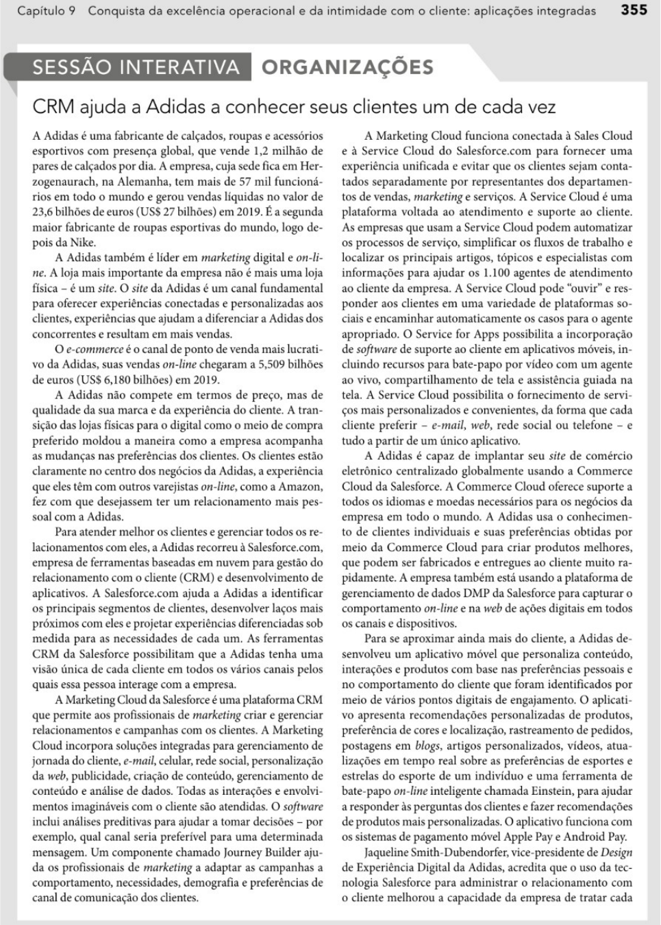 <p>Capítulo 9 Conquista da excelência operacional e da intimidade com cliente: aplicações integradas 355 SESSÃO INTERATIVA ORGANIZAÇÕES CRM ajuda a Adidas a conhecer seus clientes um de cada vez A Adidas é uma fabricante de calçados, roupas e acessórios A Marketing Cloud funciona conectada à Sales Cloud esportivos com presença global, que vende 1,2 milhão de e à Service Cloud do Salesforce.com para fornecer uma pares de calçados por dia. A empresa, cuja sede fica em Her- experiência unificada e evitar que os clientes sejam conta- zogenaurach, na Alemanha, tem mais de 57 mil funcioná- tados separadamente por representantes dos departamen- rios em todo o mundo e gerou vendas líquidas no valor de tos de vendas, marketing e serviços. A Service Cloud é uma 23,6 bilhões de euros (US$ 27 bilhões) em 2019. É a segunda plataforma voltada ao atendimento e suporte ao cliente. maior fabricante de roupas esportivas do mundo, logo de- As empresas que usam a Service Cloud podem automatizar pois da Nike. os processos de serviço, simplificar os fluxos de trabalho e A Adidas também é líder em marketing digital e on-li- localizar os principais artigos, tópicos e especialistas com ne. A loja mais importante da empresa não é mais uma loja informações para ajudar os 1.100 agentes de atendimento física é um site. o site da Adidas é um canal fundamental ao cliente da empresa. A Service Cloud pode "ouvir" e res- para oferecer experiências conectadas e personalizadas aos ponder aos clientes em uma variedade de plataformas so- clientes, experiências que ajudam a diferenciar a Adidas dos ciais e encaminhar automaticamente os casos para agente concorrentes e resultam em mais vendas. apropriado. o Service for Apps possibilita a incorporação e-commerce é o canal de ponto de venda mais lucrati- de software de suporte ao cliente em aplicativos móveis, in- da Adidas, suas vendas on-line chegaram a 5,509 bilhões cluindo recursos para bate-papo por vídeo com um agente de euros (US$ 6,180 bilhões) em 2019. ao vivo, compartilhamento de tela e assistência guiada na A Adidas não compete em termos de preço, mas de tela. A Service Cloud possibilita fornecimento de servi- qualidade da sua marca e da experiência do cliente. A tran- mais personalizados e convenientes, da forma que cada sição das lojas físicas para digital como o meio de compra cliente preferir e-mail, web, rede social ou telefone e preferido moldou a maneira como a empresa acompanha tudo a partir de um único aplicativo. as mudanças nas preferências dos clientes. Os clientes estão A Adidas é capaz de implantar seu site de comércio claramente no centro dos negócios da Adidas, a experiência eletrônico centralizado globalmente usando a Commerce que eles têm com outros varejistas on-line, como a Amazon, Cloud da Salesforce. A Commerce Cloud oferece suporte a fez com que desejassem ter um relacionamento mais pes- todos os idiomas e moedas necessários para os negócios da soal com a Adidas. empresa em todo mundo. A Adidas usa conhecimen- Para atender melhor os clientes e gerenciar todos os re- to de clientes individuais e suas preferências obtidas por lacionamentos com eles, a Adidas recorreu à meio da Commerce Cloud para criar produtos melhores, empresa de ferramentas baseadas em nuvem para gestão do que podem ser fabricados e entregues ao cliente muito ra- relacionamento com o cliente (CRM) e desenvolvimento de pidamente. A empresa também está usando a plataforma de aplicativos. A Salesforce.com ajuda a Adidas a identificar gerenciamento de dados DMP da Salesforce para capturar o os principais segmentos de clientes, desenvolver laços mais comportamento on-line e na web de ações digitais em todos próximos com eles e projetar experiências diferenciadas sob os canais e dispositivos. medida para as necessidades de cada um. As ferramentas Para se aproximar ainda mais do cliente, a Adidas de- CRM da Salesforce possibilitam que a Adidas tenha uma senvolveu um aplicativo móvel que personaliza conteúdo, visão única de cada cliente em todos os vários canais pelos interações e produtos com base nas preferências pessoais e quais essa pessoa interage com a empresa. no comportamento do cliente que foram identificados por A Marketing Cloud da Salesforce é uma plataforma CRM meio de vários pontos digitais de engajamento. aplicati- que permite aos profissionais de marketing criar e gerenciar apresenta recomendações personalizadas de produtos, relacionamentos e campanhas com os clientes. A Marketing preferência de cores e localização, rastreamento de pedidos, Cloud incorpora soluções integradas para gerenciamento de postagens em blogs, artigos personalizados, vídeos, atua- jornada do cliente, e-mail, celular, rede social, personalização lizações em tempo real sobre as preferências de esportes e da web, publicidade, criação de conteúdo, gerenciamento de estrelas do esporte de um indivíduo e uma ferramenta de conteúdo e análise de dados. Todas as interações e envolvi- bate-papo on-line inteligente chamada Einstein, para ajudar mentos imagináveis com cliente são atendidas. o software a responder às perguntas dos clientes e fazer recomendações inclui análises preditivas para ajudar a tomar decisões por de produtos mais personalizadas. aplicativo funciona com exemplo, qual canal seria preferível para uma determinada os sistemas de pagamento móvel Apple Pay e Android Pay. mensagem. Um componente chamado Journey Builder aju- Jaqueline Smith-Dubendorfer, vice-presidente de Design da os profissionais de marketing a adaptar as campanhas a de Experiência Digital da Adidas, acredita que uso da tec- comportamento, necessidades, demografia e preferências de nologia Salesforce para administrar o relacionamento com canal de comunicação dos clientes. cliente melhorou a capacidade da empresa de tratar cada</p><p>356 PARTE III Principais aplicações de sistemas para a era digital consumidor 