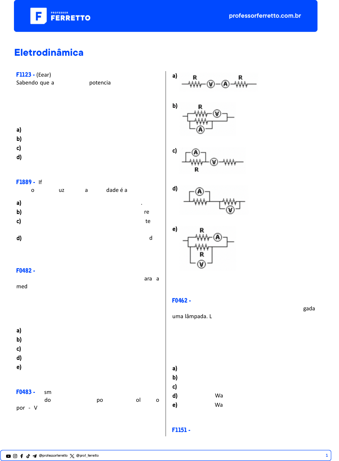 <p>1@professorferretto @prof_ferretto</p><p>Eletrodinâmica</p><p>F1123 - (Eear)</p><p>Sabendo que a diferença de potencial entre uma nuvem</p><p>e a Terra, para que aconteça a descarga elétrica de um</p><p>raio, é em torno de 3 · 108 V e que a corrente elétrica</p><p>produzida neste caso é aproximadamente de 1 · 105 A,</p><p>qual a resistência média do ar, em ohms (Ω)?</p><p>a) 1.000</p><p>b) 2.000</p><p>c) 3.000</p><p>d) 4.000</p><p>F1889 - (Ifmg)</p><p>O meio que conduz melhor a eletricidade é a(o)</p><p>a) ar, devido à facilidade de propagar o relâmpago.</p><p>b) metal, porque possui maior número de cargas livres.</p><p>c) plás�co, pois deriva-se do petróleo, grande fonte de</p><p>energia.</p><p>d) madeira, uma vez que as árvores atraem raios em dias</p><p>de tempestade.</p><p>F0482 - (Espcex)</p><p>O amperímetro é um instrumento u�lizado para a</p><p>medida de intensidade de corrente elétrica em um</p><p>circuito cons�tuído por geradores, receptores, resistores,</p><p>etc. A maneira correta de conectar um amperímetro a</p><p>um trecho do circuito no qual queremos determinar a</p><p>intensidade da corrente é</p><p>a) em série</p><p>b) em paralelo</p><p>c) na perpendicular</p><p>d) em equivalente</p><p>e) mista</p><p>F0483 - (Ufsm)</p><p>Representado um amperímetro por - A - e um vol�metro</p><p>por - V -, o esquema onde aparecem corretamente</p><p>ligados à respec�va malha é o</p><p>a)</p><p>b)</p><p>c)</p><p>d)</p><p>e)</p><p>F0462 - (Imed)</p><p>Considere uma bateria ideal de 12 V, na qual é ligada</p><p>uma lâmpada. Logo após ser ligada, a lâmpada a�nge um</p><p>brilho que não varia ao longo do tempo. Nesse estado, a</p><p>corrente elétrica que percorre a lâmpada é igual a 0,5 A.</p><p>Desprezando efeitos de dissipação nos fios condutores,</p><p>determine, respec�vamente, a resistência elétrica da</p><p>lâmpada e a potência dissipada por ela.</p><p>a) 32 Ohms e 12 Wa�s.</p><p>b) 12 Ohms e 12 Wa�s.</p><p>c) 24 Ohms e 6Wa�s.</p><p>d) 24 Ohms e 12 Wa�s.</p><p>e) 32 Ohms e 24 Wa�s.</p><p>F1151 - (Ifsul)</p><p>2@professorferretto @prof_ferretto</p><p>Os instrumentos de medidas elétricas que medem</p><p>corrente elétrica, diferença de potencial elétrico e</p><p>resistência elétrica são denominados, respec�vamente,</p><p>amperímetros, vol�metros e ohmímetros. Muitas vezes,</p><p>eles são reunidos em um único aparelho, denominado</p><p>mul�metro, o qual tem uma chave que permite</p><p>selecionar a função desejada.</p><p>Em relação à forma correta que esses medidores devem</p><p>ser associados com um resistor em um circuito elétrico,</p><p>um amperímetro ideal, quando associado</p><p>a) em série, mede a corrente elétrica que circula nesse</p><p>resistor.</p><p>b) em paralelo, mede a corrente elétrica que circula</p><p>nesse resistor.</p><p>c) em série, mede a diferença de potencial elétrico a que</p><p>o resistor está subme�do.</p><p>d) em paralelo, mede a diferença de potencial elétrico a</p><p>que o resistor está subme�do.</p><p>F1383 - (Unicamp)</p><p>Lâmpadas de luz ultravioleta (UV) são indicadas para</p><p>higienização e esterilização de objetos e ambientes em</p><p>razão do seu potencial germicida.</p><p>Em outro processo de esterilização, uma lâmpada UV de</p><p>potência P = 60 W funciona sob uma diferença de</p><p>potencial elétrico U = 100 V. A potência elétrica pode ser</p><p>expressa também em kVA, sendo 1 kVA = 1000 V x 1 A =</p><p>1000 W. A corrente elétrica i do circuito que alimenta a</p><p>lâmpada é igual a</p><p>a) 0,36 A.</p><p>b) 0,60 A.</p><p>c) 1,6 A.</p><p>d) 3,6 A.</p><p>F1931 - (Ifsc)</p><p>Na figura abaixo, são apresentados três circuitos com</p><p>resistores de 1,0 Ω cada e bateria de 3,0 V. Com base nos</p><p>seus conhecimentos sobre associação de resistores,</p><p>assinale a proposição CORRETA.</p><p>a) O resistor equivalente do circuito I é 1,5 Ω, no circuito</p><p>II é 3,0 Ω e no circuito III é 0,33 Ω.</p><p>b) O circuito I apresenta uma associação mista, enquanto</p><p>o circuito II apresenta uma associação em série e o</p><p>circuito III apresenta uma associação em paralelo.</p><p>c) O circuito I apresenta uma associação em série,</p><p>enquanto o circuito II apresenta uma associação em</p><p>paralelo e o circuito III apresenta uma associação</p><p>mista.</p><p>d) Os três circuitos, por possuírem os mesmos resistores</p><p>e a mesma d.d.p., dissipam a mesma potência.</p><p>e) O circuito I apresenta uma associação mista, enquanto</p><p>o circuito II apresenta uma associação em paralelo e o</p><p>circuito III apresenta uma associação em série.</p><p>F1907 - (Ifmg)</p><p>No circuito elétrico das residências, há algumas chaves</p><p>disjuntoras de segurança que se desligam</p><p>automa�camente em caso de sobrecarga. Na cozinha de</p><p>uma casa pode ocorrer de funcionarem, ao mesmo</p><p>tempo, uma geladeira de 1.000 W, um forno de 2.100 W,</p><p>uma lâmpada de 50 W e um liquidificador de 150 W. Se</p><p>essa casa possui uma rede elétrica de 110 V, o disjuntor</p><p>da cozinha deve ser capaz de suportar uma corrente, em</p><p>amperes, de, no mínimo,</p><p>a) 15.</p><p>b) 30.</p><p>c) 45.</p><p>d) 60.</p><p>F0533 - (Enem)</p><p>Alguns peixes, como o poraquê, a enguia-elétrica da</p><p>Amazônia, podem produzir uma corrente elétrica quando</p><p>se encontram em perigo. Um poraquê de 1 metro de</p><p>comprimento, em perigo, produz uma corrente em torno</p><p>de 2 ampères e uma voltagem de 600 volts.</p><p>O quadro apresenta a potência aproximada de</p><p>equipamentos elétricos.</p><p>3@professorferretto @prof_ferretto</p><p>O equipamento elétrico que tem potência similar àquela</p><p>produzida por esse peixe em perigo é o(a):</p><p>a) exaustor.</p><p>b) computador.</p><p>c) aspirador de pó.</p><p>d) churrasqueira elétrica.</p><p>e) secadora de roupas.</p><p>F1897 - (Ufop)</p><p>Em uma 