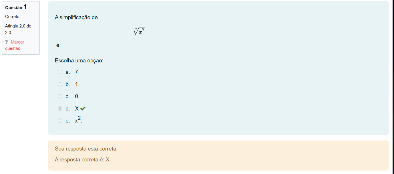 <p>Questão 1 Correto A simplificação de Atingiu 2,0 de 2,0 Vx7 P Marcar é: questão Escolha uma opção: a. 7 b. 1. C. 0 d. X 2 e. X Sua resposta está correta. A resposta correta é: X</p>