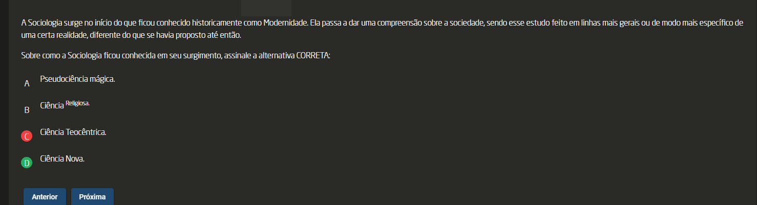 <p>A Sociologia surge no início do que ficou conhecido historicamente como Modernidade Ela passa a dar uma compreensão sobre a sociedade, sendo esse estudo feito em linhas mais gerais ou de modo mais específico de uma certa realidade, diferente do que se havia proposto até então. Sobre como a Sociologia ficou conhecida em seu surgimento, assinale a alternativa A Pseudociência mágica. Ciência Religiosa B Ciência Teocêntrica. Ciência Nova. D Anterior Próxima</p>