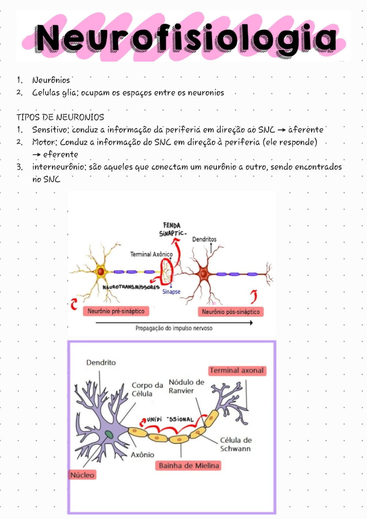 <p>1. Neurônios 2. Celulas glia: ocupam entre neuronios TIPOS DE NEURONIOS 1. Sensitivo: conduz a informação da periferia em direção ao SNC aferente 2. Motor: Conduz a informação do SNC em direção a periferia (ele responde) eferente 3. interneurônio: são aqueles que conectam um neurônio a outro, sendo encontrados no SNC FENDA Dendritos Terminal Axônico Sinapse Neurônio pré-sináptico Neurônio pós-sináptico Propagação do impulso nervoso Dendrito Terminal axonal Corpo da Nódulo de Célula Ranvier Célula de Schwann Axônio Bainha de Mielina Núcleo</p><p>DESPOLARIZAÇÃO inversão de polos é assim que canais funcionam, canais abrem a partir da despolarização REPOLARIZAÇÃO Alteração pro estado original SINAPSE QUIMICA É uma sinapse mais lenta pois precisa liberar neurotransmissores com neurotransmissores fazem a exocitose e liberam neurotransmissores nas fendas É lenta SINAPSE ELETRICA É através de impulsos. elétricos. É mais rápida Tem gap junctions que é a forma pela qual neurônios se ligam ou seja, não tem entre um neurônio e outro, assim como ocorre na sinapse</p><p>Inativadores da Acetilcolinesterase: inativam Substâncias que inativam a Acetilcolinesterase Acetilcolina no espago sinaptico= reexcitação contínua do músculo; Pode levar a morte rapidamente por laringo espasmo É utilizada para reverter relaxamento muscular da anestesia geral. Ex: Intoxicação por carbamato, succinilcolina OBS: usada em casos de intoxicação por chumbinho DIVISÃO SISTEMA NERVOSO SNC é a partir desse sistema que animal vai fugir de algum predador SNP Receptores sensoriais Pega as sensações externas Divisões: somático; autonomo; simpatico e parassimpático transmite sinais sensoriais sobre ambiente interino e externo do corpo para SNC sinais motores do SNC para efeitos periféricos. Ex: musculo esquelético e musculo cardiaco CARACTERÍSTICAS SNP controle involuntário transporte de pulsos do SNC Ação controlada pelo hipotálamo ( estrutura que manda em tudo tem a resposta pl todas as in formações do Glândulas e musculo liso</p><p>DIVISÃO ANATÔMICA SNC Medula espinhal: reflexo de dor. e nervos. motores inervações da medula saem pelo processo transverso da coluna vertebral Medula ablonga: neurónios de controle respiratório e cardiaco forame jugular Ponte: liga a medula alonga as outras estruturas do cérebro por ela passam nervos (mastigação) Mesencéfalo: sensores oculares e auditivos Diencéfalo: possui hipotálamo, controle de temperatura, osmeregulação e pressão telencéfalo: aprendizado e memoria. Cortex: sinais conscientes e movimentos voluntários. hipocampo: memória e aprendizado espacial Telencephalon (cerebral hemispheres) Diencephalon Midbrain Pons Medulla Brainstem Spinal cord FIGURE 3-2 Central nervous system (CNS) has longitudinal organization in which the phylogenetically oldest parts are caudal and the newest parts are rostral. The CNS can be divided into six major regions: the spinal cord, medulla, pons, midbrain, diencephalon, and telencephalon (cerebral hemispheres). DIVISÃO ENTRE OS NEURONIOS Neuronios de primeira ordem Neuronios de segunda ordem pegam estímulos da periferia.e fazem sinapse com neurônio de primeira ordem se localizam na medula Reflexos-neurónios motores pre progarmados. aprendidos</p><p>Estimulo Transdução Neurônio de Segunda Ordem (corno dorsal da medula espinhal) Receptor Neurônio de Terceira Ordem (no tálamo) Fibra sensória ou neurônio de Primeira Ordem Propagação somatossensório Integração Percepção SISTEMA Ações coordenadas Contração e relaxamento do musculo liso sensação dolorosa BARREIRAS DO SNC Hematocefálicas selecionam oque vai entrar no cérebro hematonervosa (a) A Blood-brain barrier B Blood-CSF barrier To brain From brain ventricle ASCENDING pericyte astrocyte CSF apical surface (b) DESCENDING TRACT OF AXONS TRACT OF AXONS neuron Direction junction cell basolateral surface choroid plexus microglia VENTRAL ROOT choroid plexus NERVE MUSCLE DORSAL third ventricle ROOT BACK DORSAL SURFACE ROOT Blood-retinal barrier GANGLION SEGMENT Sensation SPINAL CORD capillary (tight, inner BRB) (c) retina pigment epithelia cell (outer BRB) choriocapillary (leaky) Blood-spinal cord barrier gray matter pericyte astrocyte Endoneurium basal laminar white Vasculature Schwan Cell endothelial cell blood</p><p>ATP é transformado em energia celular (contração muscular) com isso a celula gasta água e precisa repor através do meio extracelular plasma tem grande quantidade de água por isso a água sai dele para intersticio para poder repor ou gerara sede no animal ou a preposição será atraves dos rins se todo liquido do plasma passar para intersticio gerara uma deficiência, então a proteina tem a função de segurar a para que ela não se desloque toda para intertício um edema pode ser causado pela falta de proteínas que faz com que a água vá para Pressão quando sangue faz pressão nas "paredes" e invadindo EQUILÍBRIO HÍDRICO CORPORAL Quantidade de água perdida que precisa ser reposta; Agua transita entre meios para tentar manter NECESSIDADE DE AGUA Necessidade Basal de água (manter hídrico) têm mais água no corpo pois tem mais células no DESIDRATAÇÃO E SEDE Princípio fundamental: animal perde mais do que absorve Diminuição do liquido extracelular perda de eletrólitos sistema renal se encarrega de excretar esses eletrólitos portanto, a urina vai sair mais concentrada (para excretar eletrólitos) eletrólitos esses que foram aumentados no meio extracelular animal quando perde água precisa ter um de sede feito pelo organismo 0 rim manda um sinal pro cerebro ativando uma area que faz controle de água e sal no organismo vasculoso da lâmina terminal) regula hidrico Feedback negativo</p><p>Perda de - ingestão fluido terapia, pois precisa repor eletrólitos também Feedback negativo previne a ingestão execiva de Redução da osmoconcentração das células; Aumentar a 