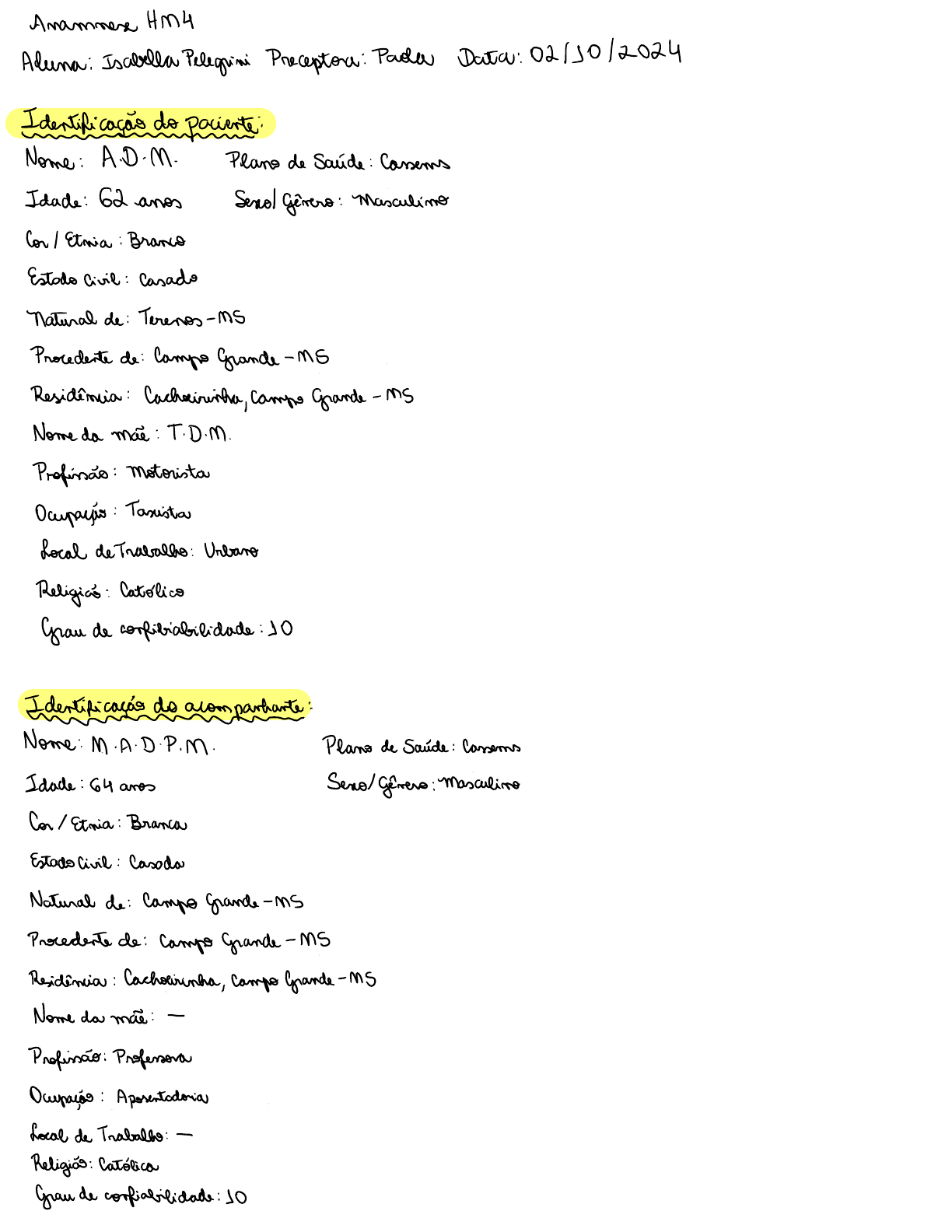 <p>Anamnese HM4</p><p>Aluna : IsabellaPelegrini Preceptora : Paola Data : 02/10/2014</p><p>Identificação do paciente:mu</p><p>Nome : A .D.M .</p><p>Idade : 62 anos</p><p>Cor/Etnia : Branco</p><p>Estado Civil : Casado</p><p>Natural de : Teremos-MS</p><p>Procedente de: Campo Grande-MS</p><p>S</p><p>Residência : Cachoeirinha, Campo Grande - MS</p><p>Nomeda Mãe : T.D . M.</p><p>Profissão : Motorista·Ocupação : Taxista</p><p>Local deTrabalho : Urbano</p><p>Religião : Católico</p><p>Grau de confibiabilidade : 10</p><p>Plano de Saúde : Consens</p><p>Idade : 64 and Sero/Gênero :Masculino</p><p>Cor/Etria : Branca</p><p>EstadoCivil : Casada</p><p>Natural de: Campo Grande-MS</p><p>·viditilampoGrandes-ms</p><p>Profissão : Professora</p><p>Ocupação Aposentadore a</p><p>Religião : Católica</p><p>Grau de confiabilidade : 10</p><p>Queixa Principal da Doença (QPD) :</p><p>-</p><p>Alteração da fala, Lá2dias</p><p>~mitóriada Doença Atual (HDA) :</p><p>O paciente, sero masculino, idade de 62ans, apresenta Listórico de LAVC oconidos em</p><p>-maio desteino</p><p>, quando foi sulvetidoà colocação de um stent na artéria cantida esquerda</p><p>Desde então</p><p>,</p><p>vinha evoluindo de forma estável atéque,</p><p>há sdias, começou a imanifestar sintomas</p><p>indicativos de um novo episódio de AVC.Os sinais iniciais induiram heniparsia direita, disctria,</p><p>ofalia intensa e abruptivna região occipital, visão terra no olho direito, além de um quadro levede con</p><p>fusão mental. Após esses sintomas, o paciente foi levado ao fospital e submetido à colocação de mais 4 stentes devido</p><p>ao comprometimento de outras artérias.</p><p>Ele recebeu alta hospitalar há 4 dias em condição estável, com uso contínuo de invostatina para</p><p>control de celesterol e prevenção denovos eventos isquêmicos. Entretanto, há dias</p><p>,panoua perceber</p><p>uma fraqueza progressiva nas peras,o que tem dificultado sua nobilidade.A fraqueza correçou</p><p>demaveira graduale permanece ao longo dodia,caracterizado como uma sensação de instabilidade,</p><p>sem dos associada.A intensidade dessa fraquezaémoderada, interferindoemsuas atividades diárias,</p><p>mos sem ser incapacitante.O paciente relata que a fraquezaé localizadamos membros inferiores,</p><p>de formo bilateral, sem sinais de indição paraoutras regiões. Não identificar fatores que agravem</p><p>o quadro ,mas percebe uma leve melhora ao inclinar o corpo para frentee seapoica em superfícies .</p><p>Não hásintomas associados, como formigamento ou perda decontrole esfincteriano.</p><p>O paciente mantém o uso de sivstatina regularmente eencontra-seestável, masanova</p><p>fraqueza nas pernas sugerea secenidade de uma reavaliação clínica para investigara possível</p><p>progressão de less vasculares ou outros eventos neurológicos.</p><p>-</p><p>Interrogatório Sintomatológico :</p><p>~</p><p>></p><p>SintomasGerar da pele , cian, posteria, vitencia,são, hipocoloração, prido, ruboealocar</p><p>> Cabeça ePescoço :</p><p>·</p><p>Nega emaqueca,tortura etraumatismos. Relato Cefaléia (Vide HDA)</p><p>> Olhos :</p><p>Nega amaurse, ardência, diplopia, dos, escotomas,enoftalmia, lacrimejamento, fotofobia,mistagno,</p><p>olho seco</p><p>, presido, alteração na cuidade visual.Relata visãoterra (wide</p><p>HSA).</p><p>> Naviz e covidades paranasais :</p><p>Nega alteração deofalto,coriza, dor forial,epitane, espirose obstruçãopasal</p><p>> Cavidade Bucal e Anenos:</p><p>Nego afta, boca seca,dos de dente, doina articulação temporomandibular, halitose, próteses dentários, sangramento,</p><p>vialoses e eleraçõe</p><p>> Faringe :</p><p>Nega dos degarganta, pigaro e somos</p><p>-farige :</p><p>Nega alterações de voz edor</p><p>> Vasos e linfonodos :</p><p>Nega aderorregalias, pulsações etergência jugular</p><p>> Sistema Respiratório :</p><p>Nega sopos/frênitos,cianse,datorácica,expectoraços , henoptise,tosseedisprésa</p><p>> Sistema Cardiovascular :</p><p>Mega dispréia ao enforço , disprésa ao decúbito, ortopéia,dispéia paronística notuma, edema,</p><p>sínope, lipimia, ciane progressiva e sudovs noturna</p><p>·</p><p>Relata do precordial (videHDA)</p><p>*</p><p>-</p><p>-></p><p>g·</p><p>-</p><p>>Sistema Urinário</p><p>S</p><p>nega anasarca, anúria, disvia,coliária, hematúria, dos Combar,estrangúria, victúria, incontinência</p><p>&minária, placiária, policínia, retenção</p><p>univara, urgênciamiccional,unia com mal cheiro,oligéria e</p><p>edema</p><p>> Sistema Genital Masculino</p><p>Nega alterações de jato rivário,corrimento metral, disfunções senvais,dor testicular, finoe,</p><p>herosperia e priapisino ↑ -></p><p>-</p><p>> Sistema hemolinfopoético</p><p>-</p><p>-</p><p>Nega aenomegalias,esplenomegaliase sargamentos</p><p>~</p><p>> Sistema endócrino</p><p>Nega alterações depele e fâmeros,manismo, gigantismo,acrorregalia, fintimoetressores</p><p>-</p><p>> Sistema Osteoarticular</p><p>Nega atrofia muscular,câimbras,fraquezamuscular ,mialgia, deformidades articulares e órsas,</p><p>cala, dos</p><p>área,edema, espamosmusculares, limitações</p><p>denovimentos</p><p>, rigidez articular,</p><p>rubor articular e viais inflamatórios</p><p>> Sistema Nervoso</p><p>Negaaresterias,comoconvulsões, crise</p><p>de ausência,distúrbios daaprendizagem, lipotimia, distúrbio</p><p>daMemória,sinope , transtornosde sono etremores</p><p>Relata alterações de fala ,domarca, incoordenação de movimentoseparalisias (vide HAA)</p><p>> ExamePríquico</p><p>Nega aluinaçosvisuais eauditives , angústia,ansiedade ,atos compulsivos,daustrofobia,</p><p>/</p><p>-·</p><p>AntecedentesPessoais /Fisiológicos</p><p>-</p><p>Gestação e Nascimento</p><p>Condição de parto : Normal/hospitalar</p><p>Gestação : parto normal, sem intercorrências</p><p>Ordende nascimento : terceiro filho</p><p>S</p><p>Quantidades de irmaos: 13</p><p>Desenvolvimento pricomotor eneural :</p><p>Apro