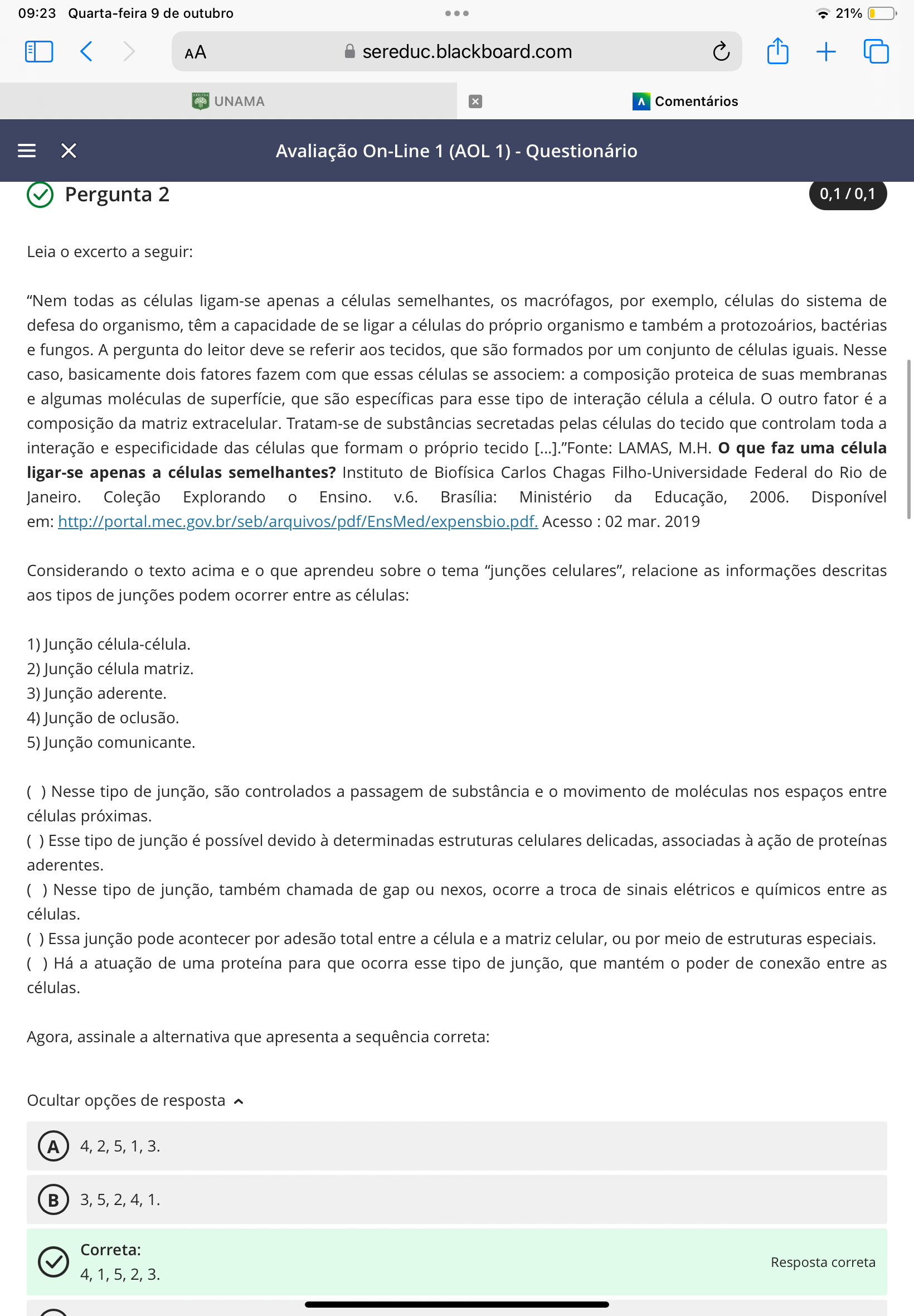 <p>09:23 Quarta-feira 9 de outubro 21% AA sereduc.blackboard.com UNAMA A Comentários X Avaliação On-Line 1 (AOL 1) Questionário Pergunta 2 Leia o excerto a seguir: "Nem todas as células ligam-se apenas a células semelhantes, os macrófagos, por exemplo, células do sistema de defesa do organismo, têm a capacidade de se ligar a células do próprio organismo e também a protozoários, bactérias e fungos. A pergunta do leitor deve se referir aos tecidos, que são formados por um conjunto de células iguais. Nesse caso, basicamente dois fatores fazem com que essas células se associem: a composição proteica de suas membranas e algumas moléculas de superfície, que são específicas para esse tipo de interação célula a célula. outro fator é a composição da matriz extracelular. Tratam-se de substâncias secretadas pelas células do tecido que controlam toda a interação e especificidade das células que formam o próprio tecido [...]."Fonte: LAMAS, M.H. o que faz uma célula ligar-se apenas a células semelhantes? Instituto de Biofísica Carlos Chagas Filho-Universidade Federal do Rio de Janeiro. Coleção Explorando o Ensino. v.6. Brasília: Ministério da Educação, 2006. Disponível em: :http://portal.mec.gov.br/seb/arquivos/pdf/EnsMed/expensbio.pdf. Acesso : 02 mar. 2019 Considerando o texto acima e o que aprendeu sobre o tema "junções celulares", relacione as informações descritas aos tipos de junções podem ocorrer entre as células: 1) Junção célula-célula. 2) Junção célula matriz. 3) Junção aderente. 4) Junção de oclusão. 5) Junção comunicante. ( Nesse tipo de junção, são controlados a passagem de substância e o movimento de moléculas nos espaços entre células próximas. ( ) Esse tipo de junção é possível devido à determinadas estruturas celulares delicadas, associadas à ação de proteínas aderentes. ( ) Nesse tipo de junção, também chamada de gap ou nexos, ocorre a troca de sinais elétricos e químicos entre as células. ( ) Essa junção pode acontecer por adesão total entre a célula e a matriz celular, ou por meio de estruturas especiais. ( ) Há a atuação de uma proteína para que ocorra esse tipo de junção, que mantém o poder de conexão entre as células. Agora, assinale a alternativa que apresenta a sequência correta: Ocultar opções de resposta A 4, 2, 5, 1, 3. B 3, 5, 2, 4, 1. Correta: Resposta correta 4, 1, 5, 2, 3.</p>