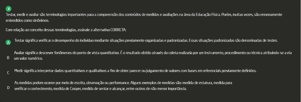 <p>4 Testar, medir e avaliar são terminologias importantes para a compreensão dos conteúdos de medidas e avaliações na área da Educação Física. Porém, muitas vezes, são erroneamente entendidos como Com relação ao conceito dessas terminologias, assinale a alternativa CORRETA: Testar significa verificar desempenho do mediante situações previamente organizadas e padronizadas. Essas situações padronizadas são denominadas de testes. Avaliar significa descrever fenômenos do ponto de vista É resultado obtido através da coleta realizada por um procedimento ou técnica atribuindo-se a ela B um valor numérico. Medir significa interpretar dados quantitativos e qualitativos a fim de obter parecer ou julgamento de valores com bases em referenciais previamente definidos. As medidas podem ocorrer por meio de escrita, observação ou performance. Alguns exemplos de medidas são medida de estatura, medida para D verificar conhecimento, medida de Cooper, medida de sentar e alcançar, entre outros de não menor importância.</p>