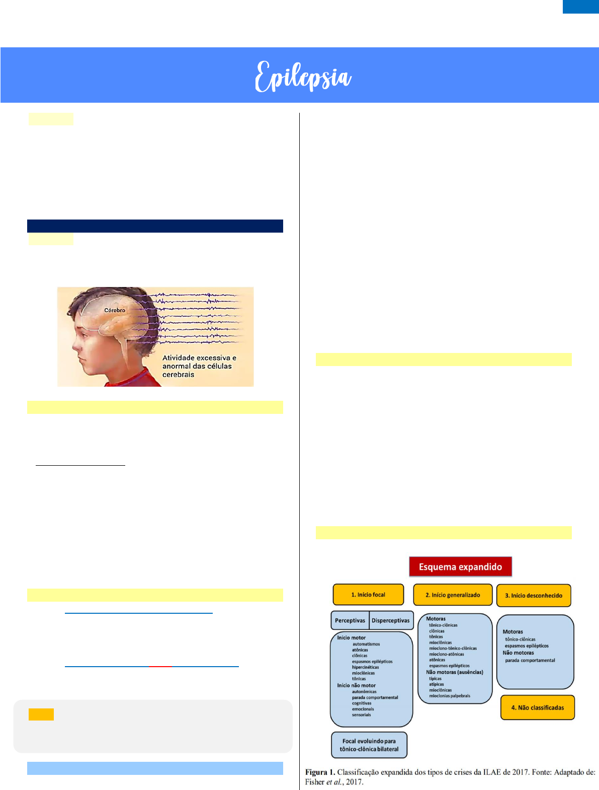 <p>1 Juliana F. M. de Camargo I Medicina I Turma IV I 2021.1</p><p>NEUROLOGIA - Eduardo Ramos – Aula 8</p><p>Conceito: É um transtorno caracterizado por 2 ou +</p><p>crises NÃO PROVOCADAS em um intervalo maior</p><p>que 24 horas</p><p> Condição crônica na qual ocorrem crises</p><p>epilépticas que se repetem na ausência de um fator</p><p>desencadeante</p><p>Ex.: febre, drogas, distúrbios metabólicos</p><p>CRISE EPILÉPTICA</p><p>Conceito: Resultado de descarga elétrica excessiva</p><p>súbita e geralmente rápida de um grupo de</p><p>neurônios que pode estar localizado em quaisquer</p><p>regiões do cérebro</p><p>MANIFESTAÇÕES CLÍNICAS</p><p>▪ Dependerão da região onde a descarga se</p><p>localiza e sua possível propagação para áreas</p><p>cerebrais vizinhas</p><p>▪ Caracterizada por:</p><p>✓ Alteração ou perda da consciência</p><p>✓ Distúrbio do movimento</p><p>✓ Alterações sensitivas ou sensoriais</p><p>✓ Sintomas vegetativos e comportamentais</p><p>▪ Podem ser tão rápidas que passam despercebidas</p><p>ou tão prolongadas que exigem atendimento em</p><p>emergência médica</p><p>TIPOS DE CRISE EPILÉPTICA</p><p>1. CRISE EPILÉPTICA CONVULSIVA</p><p>- Quando apresenta fenômenos motores</p><p>Ex.: Crise tônico-clônica (crise generalizada)</p><p>2. CRISE EPILÉPTICA NÃO CONVULSIVA</p><p>- NÃO apresenta fenômenos motores</p><p>Ex.: Crise de ausência (comum em crianças)</p><p>Obs.: TODO PACIENTE com EPILEPSIA tem crises</p><p>epilépticas, porém NEM TODO PACIENTE com</p><p>EPILEPSIA tem crises convulsivas</p><p>ETIOLOGIAS DA EPILEPSIA</p><p>▪ MULTIFATORIAL</p><p>- São diferentes de população infantil, adolescentes</p><p>e idosos</p><p>▪ CONSTITUCIONAIS OU IDIOPÁTICAS</p><p>- Relacionadas a fatores genéticos e as epilepsias</p><p>causadas por fatores exógenos (fetopatias), por</p><p>exemplo, infecções congênitas TORCHS</p><p>(toxoplasmose, rubéola, CMV, herpes simples, sífilis),</p><p>drogas ou medicamentos teratogênicos, algumas</p><p>doenças maternas</p><p>▪ PERÍODO PERI NATAL</p><p>- Encefalopatia hipóxico-isquêmica, distúrbios</p><p>metabólicos do período neonatal (hipoglicemia)</p><p>podem evoluir com epilepsia 2ª ou sintomática</p><p>▪ EM QUALQUER IDADE</p><p>- Doenças infecciosas, tumores do SNC, TCE,</p><p>distúrbios vasculares, metabólicos e nutricionais e as</p><p>doenças cerebrais degenerativas e hereditárias</p><p>FATORES DESENCADEANTES</p><p>✓ Mudanças súbitas da intensidade luminosa</p><p>Ex.: Televisão, computador, danceterias</p><p>✓ Privação do sono</p><p>✓ Ingestão alcóolica</p><p>✓ Febre</p><p>- Casos específicos até os 5 anos de idade</p><p>✓ Drogas ilícitas</p><p>- Principalmente a cocaína</p><p>✓ Alguns medicamentos</p><p>- Depende do limiar do paciente</p><p>- Ex.: haloperidol</p><p>CLASSIFICAÇÃO DOS TIPOS DE CRISE</p><p>2 Juliana F. M. de Camargo I Medicina I Turma IV I 2021.1</p><p>▪ INÍCIO FOCAL: quando tem alteração só em</p><p>uma região no eletroencefalograma (EEG)</p><p>Crise perceptiva: quando o paciente tem uma crise,</p><p>porem continua consciente e não perde a</p><p>percepção</p><p> Pode ser de início motor ou não motor</p><p>Crise disperceptiva: quando se perde a percepção</p><p>(consciência alterada)</p><p>▪ INÍCIO GENERALIZADO: quando é alterado</p><p>conjuntivamente todas as áreas do EEG</p><p> Pode ser de início motor ou não motor</p><p>▪ INÍCIO DESCONHECIDO: quando não tem o EEG</p><p>TIPOS DE CRISE EPILÉPTICA</p><p>CRISES FOCAIS</p><p>▪ Podem indicar doença cerebral focal</p><p>1. Crise focal PERCEPTIVAS</p><p>. Sensações elementares</p><p>. Movimentos motores simples, sensoriais ou</p><p>autonômicos (Não há distúrbio da consciência)</p><p>Ex.: Sensação epigástrica, afetivo (medo),</p><p>cognitivo (déjà vu), sensoriais (alucinação olfativa)</p><p>2. Crise focal DISPERCEPTIVAS</p><p>. Consciência alterada</p><p>. Chamadas crises “psicomotoras” ou do “lobo</p><p>temporal”</p><p>. Origina, geralmente, no lobo temporal ou frontal</p><p>Ex.: Automatismo psicomotores</p><p>EPILPESIA DO LOBO TEMPORAL</p><p>▪ É o lobo mais epileptogênico do cérebro (60%</p><p>dos casos)</p><p>▪ O que mais mostra anormalidades interictais e</p><p>ictais ao EEG</p><p>▪ Pode ter SINTOMAS VISCERAIS/ AUTONÔMICOS/</p><p>PSÍQUICOS</p><p>Ex.: Crise focal DISPERCEPTIVA</p><p>▪ Sintomas:</p><p>✓ Irritabilidade</p><p>✓ Explosões de raiva</p><p>✓ Ansiedade</p><p>✓ Depressão</p><p>▪ Quadro que mais se confunde com eventos</p><p>psiquiátricos</p><p>Crise Focal Crise</p><p>Generalizada</p><p>Crise Focal com</p><p>Generalização ou</p><p>Crise Focal com</p><p>evolução tônico-</p><p>clônica bilateral</p><p>3 Juliana F. M. de Camargo I Medicina I Turma IV I 2021.1</p><p>▪ Relacionado a ESCLEROSE MESIAL TEMPORAL</p><p>(atrofia)</p><p>EPILPESIA DO LOBO FRONTAL</p><p>▪ Corresponde a 20-30% dos casos de Epilepsia</p><p>focal</p><p>▪ Presença de AUTOMATISMOS MOTORES</p><p>importantes, como debater-se, atirar-se,</p><p>balançar-se, pedalar e chutar, acompanhado</p><p>de vocalização primitiva, como grunhidos e</p><p>gemidos</p><p>▪ Generalização secundaria é frequente</p><p>EPILPESIA DO LOBO PARIETAL</p><p>▪ Sensações PARESTÉSICAS (formigamento,</p><p>dormência, agulhadas na ausência de</p><p>estimulação) ou DISESTÉSICAS (alteração na</p><p>sensibilidade, sobretudo do tato), principalmente</p><p>da face e braço</p><p>EPILPESIA DO LOBO OCCIPITAL</p><p>▪ CRISES VISUAIS caracterizam-se por alucinações</p><p>elementares, como luzes e cores (escotomas</p><p>cintilantes)</p><p>CRISES GENERALIZADAS</p><p>1. CRISE GENERALIZADA TÔNICO-CLÔNICA</p><p>QUADRO CLÍNICO:</p><p>▪ Episódio recorrente de perda súbita da</p><p>consciência com atividade motora</p><p>importante:</p><p>Ex.: Cair ao solo, gritando, urina-se, apneia</p><p>temporária</p><p>▪ Após rigidez tônica vem espas