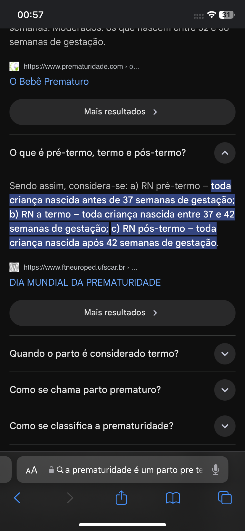 <p>00:57 31 semanas de gestação. https://www.prematuridade.com > O Bebê Prematuro Mais resultados > O que é pré-termo, termo e pós-termo? Sendo assim, considera-se: a) RN pré-termo - toda criança nascida antes de 37 semanas de gestação; b) RN a termo - toda criança nascida entre 37 e 42 semanas de gestação; c) RN pós-termo - toda criança nascida após 42 semanas de gestação. https://www.ftneuroped.ufscar.br > ... DIA MUNDIAL DA PREMATURIDADE Mais resultados > Quando parto é considerado termo? V Como se chama parto prematuro? V Como se classifica a prematuridade? V AA Q a prematuridade é um parto pre te</p>