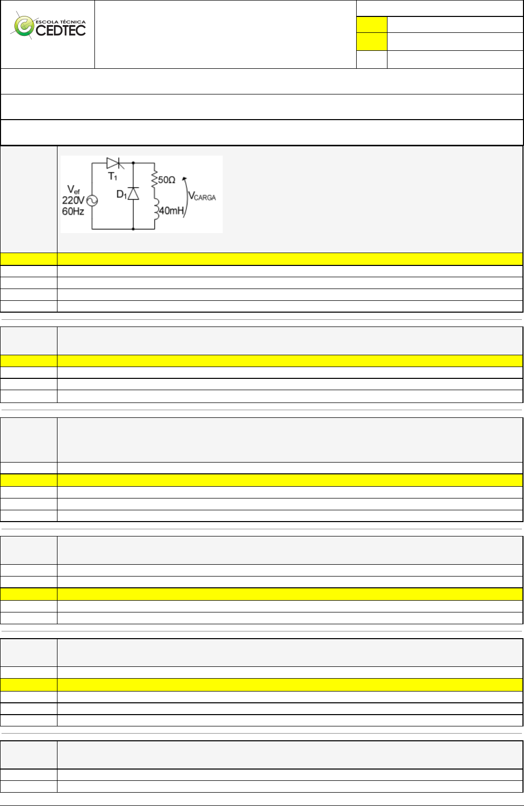 <p>Pincel Atômico - 10/10/2024 06:06:58 1/4</p><p>DANIEL DE ALMEIDA</p><p>LOPES</p><p>Avaliação Presencial (EAD)</p><p>Atividade finalizada em 09/10/2024 06:47:32 (2727995 / 1)</p><p>LEGENDA</p><p>Resposta correta na questão</p><p># Resposta correta - Questão Anulada</p><p>X Resposta selecionada pelo Aluno</p><p>Disciplina:</p><p>ELETRÔNICA DE POTÊNCIA [1146510] - Avaliação com 20 questões, com o peso total de 51,00 pontos [capítulos - Todos]</p><p>Turma:</p><p>Curso Técnico: Eletrotécnica - Grupo: EAD - 07/24 - EAD ELE [128010]</p><p>Aluno(a):</p><p>91636745 - DANIEL DE ALMEIDA LOPES - Respondeu 14 questões corretas, obtendo um total de 35,70 pontos como nota</p><p>[350058_11576]</p><p>Questão</p><p>001</p><p>Considere o circuito do retificador monofásico controlado de meia onda mostrado na figura a seguir.</p><p>O valor da tensão média, em V, sobre a carga para um ângulo de disparo do SCR de 90º é, aproximadamente, igual a :</p><p>X 50</p><p>60</p><p>100</p><p>30</p><p>70</p><p>[350058_298301]</p><p>Questão</p><p>002</p><p>Em que aplicações os tiristores são amplamente utilizados?</p><p>Retificadores controlados e controladores CA</p><p>Amplificadores de áudio</p><p>Fontes de alimentação chaveadas</p><p>X Conversores de alta frequência</p><p>[350058_188697]</p><p>Questão</p><p>003</p><p>Dentre as aplicações de um conversor de potência como um retificador controlado temos:</p><p>I. Transmissão DC em alta tensão.</p><p>II. Controle de velocidade de motor DC a partir de uma fonte AC.</p><p>III. Controle de velocidade para ferramentas elétricas portáteis.</p><p>Podemos considerar verdadeiras:</p><p>I-(V); II-(V); III-(F)</p><p>X I-(V); II-(V); III -(V)</p><p>I- (F); II-(V); III-(F)</p><p>I-(F); II-(V); III-(V)</p><p>I-(F); II-(F); III-(F)</p><p>[350058_11582]</p><p>Questão</p><p>004</p><p>Sobre tiristores, é correto afirmar que :</p><p>O DIAC só dispara quando um pulso positivo é aplicado ao terminal gate.</p><p>O TRIAC é um tiristor de quatro terminais externos: dois anodos, um catodo e um gate.</p><p>X A corrente de anodo do SCR só flui em um único sentido.</p><p>Após o disparo do SCR, ele volta à condição de corte quando a corrente do terminal gateé interrompida.</p><p>Um dos parâmetros do TRIAC é a sua corrente de disparo IH (holding current).</p><p>[350057_5348]</p><p>Questão</p><p>005</p><p>Sabendo que as chaves semicondutoras de potência são os elementos mais importantes em circuitos de eletrônica de potência, marque a alternativa</p><p>que apresenta apenas componentes que podem ser responsáveis pelo chaveamento num conversor CC-CC.</p><p>Triac, Diodo, MOSFET,SCR</p><p>X BJT, MOSFET</p><p>SCR, BJT, Diac, Diodo</p><p>MOSFET, BJT, SCR, Diac</p><p>SCR, BJT, Diodo,DIAC</p><p>[350058_11591]</p><p>Questão</p><p>006</p><p>Sistemas de comunicação utilizam variados métodos que permitem a transmissão de dados através de técnicas de modulação digital. Existe uma</p><p>técnica que consiste basicamente em variar a largura do pulso da portadora, proporcionalmente ao sinal modulante, que é conhecida por :</p><p>Amplificador</p><p>FSK</p><p>Pincel Atômico - 10/10/2024 06:06:58 2/4</p><p>X PWM</p><p>PCM</p><p>[350058_4739]</p><p>Questão</p><p>007</p><p>O circuito abaixo representa:</p><p>Retificador de meia onda tap central</p><p>Retificador de onda completa tap central</p><p>Retificador de meia onda em ponte</p><p>X Retificador de onda completa em ponte com tap central</p><p>Retificador de onda completa em ponte</p><p>[350058_188731]</p><p>Questão</p><p>008</p><p>Nas últimas décadas, com o grande avanço dos dispositivos eletrônicos, foi possível implementar diversos equipamentos em variadas aplicações. Os</p><p>conversores CC – CC são alguns dos exemplos nestas inovações. Com base nestes conversores é possível afirmar:</p><p>I – O conversor CC – CC buck é conhecido como elevador de tensão;</p><p>II – O conversor CC – CC boost é conhecido como abaixador de tensão;</p><p>III – O conversor CC – CC buck boost é conhecido como abaixador e elevador de tensão.</p><p>Assinale a alternativa:</p><p>Apenas II é correta.</p><p>X Apenas III é correta.</p><p>Apenas I é correta.</p><p>Todas as alternativas são corretas.</p><p>Apenas I e II estão corretas.</p><p>[350058_298275]</p><p>Questão</p><p>009</p><p>Em um circuito de corrente alternada, como a corrente faz com que o SCR corte?</p><p>Aumentando a tensão de gate.</p><p>Aumentando a temperatura.</p><p>X Passando por zero.</p><p>Aumentando a corrente de ânodo.</p><p>[350058_298236]</p><p>Questão</p><p>010</p><p>Qual é a função principal da eletrônica de potência?</p><p>X Controlar o fluxo de potência e processar energia através de dispositivos semicondutores.</p><p>Converter energia mecânica em energia elétrica.</p><p>Gerar energia elétrica a partir de fontes renováveis.</p><p>Armazenar energia em baterias.</p><p>[350059_298265]</p><p>Questão</p><p>011</p><p>O que aumenta a dificuldade na realização de um conversor?</p><p>Redução da tensão e corrente.</p><p>Estabilidade da fonte de alimentação.</p><p>Redução do peso e do volume.</p><p>X Aumento da tensão, corrente e frequência.</p><p>Pincel Atômico - 10/10/2024 06:06:58 3/4</p><p>[350059_11594]</p><p>Questão</p><p>012</p><p>A figura acima mostra um dispositivo eletrônico muito usado para transmissão de sinais analógicos. Esse dispositivo combina dois sinais de entrada,</p><p>gerando um sinal na saída.</p><p>X Modulador PWM</p><p>Amplificador</p><p>Filtro passa-banda</p><p>Modulador AM</p><p>Modulador FM</p><p>[350059_298287]</p><p>Questão</p><p>013</p><p>Qual é a principal vantagem do controle PWM em relação ao controle linear?</p><p>Maior tamanho do circuito</p><p>X Menor dissipação de calor</p><p>Maior resistência</p><p>Menor eficiência</p><p>[350059_188734]</p><p>Questão</p><p>014</p><p>A figura ao lado mostra a configuração básica de um circuito chopper st