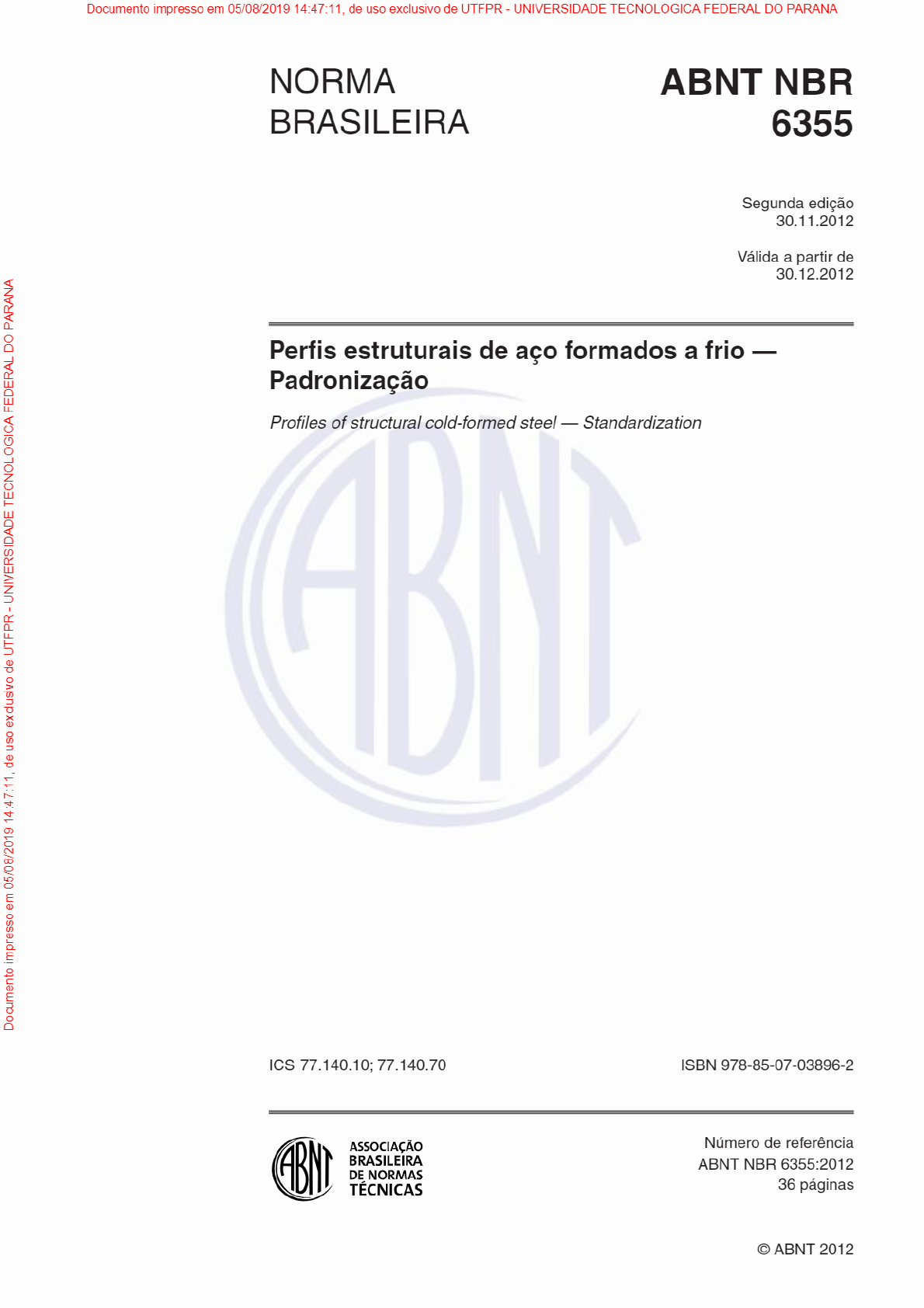 <p>impresso em 05/08/2019 14:47:11, de uso exclusivo de UTFPR - UNIVERSIDADE TECNOLOGICA FEDERAL DO PARANA NORMA ABNT NBR BRASILEIRA 6355 Segunda edição 30.11.2012 Válida a partir de 30.12.2012 Perfis estruturais de aço formados a frio - Padronização Profiles of structural cold-formed steel - Standardization ICS 77.140.10;77.140.70 ISBN 978-85-07-03896-2 ASSOCIAÇÃO ABNT Número de referência BRASILEIRA DE NORMAS ABNT NBR 6355:2012 TÉCNICAS 36 páginas ABNT 2012</p><p>Documento impresso em 05/08/2019 14:47:11, de uso exclusivo de UTFPR - UNIVERSIDADE TECNOLOGICA FEDERAL DO PARANA ABNT NBR 6355:2012 DO de de ABNT 2012 Todos os direitos reservados. A menos que especificado de outro modo, nenhuma parte desta publicação pode ser reproduzida ou utilizada por qualquer meio, eletrônico ou mecânico, incluindo fotocópia e microfilme, sem permissão por escrito da ABNT. ABNT Av.Treze de Maio, 13 - andar 20031-901 - Rio de Janeiro - RJ Tel.: + 55 21 3974-2300 Fax: + 55 21 3974-2346 abnt@abnt.org.br www.abnt.org.br ii ABNT 2012 - Todos os direitos reservados</p><p>Documento impresso em 05/08/2019 14:47:11, de uso exclusivo de UTFPR UNIVERSIDADE TECNOLOGICA FEDERAL DO PARANA ABNT NBR 6355:2012 Sumário Página Prefácio V 1 Escopo 1 2 Referências normativas 1 3 Termos e definições 1 4 Símbolos 2 4.1 Letras romanas maiúsculas 2 4.2 Letras romanas minúsculas 2 4.3 Letras gregas minúsculas 3 5 Séries comerciais e designações dos perfis 4 6 Requisitos do processo 5 6.1 Materiais 5 6.2 Tolerâncias 5 6.2.1 Chapas 5 6.2.2 Perfis 6 6.3 Aspectos superficiais 8 6.4 Modo de fazer a encomenda 8 6.5 Identificação e acondicionamento 9 6.5.1 Identificação 9 6.5.2 Forma de identificação 9 de 6.5.3 Acondicionamento 9 7 Inspeção 9 8 Aceitação e rejeição 10 9 Cantoneira de abas iguais 14 de 10 Perfil U simples 14 11 Perfil U enrijecido 15 12 Perfil Z enrijecido a 90° 15 13 Perfil Z enrijecido a 45° 16 14 Perfil cartola 17 Anexo Anexo A (informativo) Tabelas de perfis de séries comerciais 11 Figuras Figura 1 - Ângulo formado por elementos adjacentes 8 Figura 2 - Flecha do perfil 8 Figura 3 - Torção do perfil 8 Figura 4 - Esquadro de extremidade do perfil 8 Figura A.1 - Cantoneira de abas iguais 12 Figura A.2 - Perfil U simples 12 Figura A.3 - Perfil U enrijecido 13 ABNT 2012 - Todos os direitos reservados iii</p><p>Documento impresso em 05/08/2019 de uso exclusivo de UTFPR - UNIVERSIDADE TECNOLOGICA FEDERAL DO PARANA ABNT NBR 6355:2012 Figura A.4 - Perfil Z enrijecido a 13 Figura A.5 - Perfil Z enrijecido a 45° 14 Tabelas Tabela 1 - Séries comerciais mais usuais de perfis estruturais e respectivas designações 4 Tabela 2 - Tolerâncias nas formas e dimensões dos perfis obtidos por dobramento 6 Tabela 3 - Tolerâncias nas formas e dimensões dos perfis obtidos por conformação contínua 7 DO Tabela A.1 - Cantoneira de abas iguais - Aço sem revestimento: dimensões, massas e propriedades geométricas 18 Tabela A.2 - Perfil U simples - Aço sem revestimento - Dimensões, massas e propriedades geométricas 21 Tabela A.3 - Perfil U enrijecido - Aço sem revestimento - Dimensões, massas e propriedades geométricas 27 Tabela A.4 - Perfil Z enrijecido a 90° - Aço sem revestimento - Dimensões, massas e propriedades geométricas 30 Tabela A.5 - Perfil Z enrijecido a 45° - sem revestimento - Dimensões, massas e propriedades geométricas 33 Tabela A.6 - Perfil cartola - Aço sem revestimento - Dimensões, massas e propriedades geométricas 35 de Tabela A.7 - Perfil U enrijecido - Aço zincado a - Dimensões, massas e propriedades geométricas 36 Tabela A.8 - Perfil cartol a Aço zincadoa - Dimensões, massas e propriedades geométricas 38 de iv ABNT 2012 - Todos os direitos reservados</p><p>Documento impresso em 05/08/2019 de uso exclusivo de UTFPR UNIVERSIDADE TECNOLOGICA FEDERAL DO PARANA ABNT NBR 6355:2012 Prefácio A Associação Brasileira de Normas Técnicas (ABNT) é o Foro Nacional de Normalização. As Normas Brasileiras, cujo conteúdo é de responsabilidade dos Comitês Brasileiros (ABNT/CB), dos Organismos de Normalização Setorial (ABNT/ONS) e das Comissões de Estudo Especiais (ABNT/CEE), são elaboradas por Comissões de Estudo (CE), formadas por representantes dos setores envolvidos, delas fazendo parte: produtores, consumidores e neutros (universidades, laboratórios e outros). Os Documentos Técnicos ABNT são elaborados conforme as regras da Diretiva ABNT, Parte 2. A Associação Brasileira de Normas Técnicas (ABNT) chama atenção para a possibilidade de que alguns dos elementos deste documento podem ser objeto de direito de patente. A ABNT não deve ser considerada responsável pela identificação de quaisquer direitos de patentes. A ABNT NBR 6355 foi elaborada no Comitê brasileiro de Siderurgia (ABNT/CB-28), pela Comissão de Estudo de Produtos Planos (CE-28:000.03). Projeto circulou em Consulta Nacional conforme Edital n° 07, de 06.07.2012 a 03.09.2012, com o número de Projeto ABNT NBR 6355. Esta segunda edição cancela e substitui a edição anterior (ABNT NBR 6355:2003), a qual foi tecnicamente revisada. Escopo desta Norma Brasileira em inglês é o seguinte: de Scope This Standard define the requirements demanded for structural cold-formed steel with cross-section open. de ABNT 2012 Todos os direitos reservados V</p><p>Documento impresso em 05/08/2019 14:47:11, de uso exclusivo de UTFPR - UNIVERSIDADE TECNOLOGICA FEDERAL DO PARANA</p><p>Documento impresso em 05/08/2019 14:47:11, de uso exclusivo de UTFPR - UNIVERSIDADE TECNOLOGICA FEDERAL DO PARANA NORMA BRASILEIRA ABNT NBR 6355:2012 Perfis estruturais de aço formados a frio Padronização 1 Escopo Esta Norma estabelece os requisitos exigíveis dos perfis estruturais de aço formados a frio, com seção transversal aberta. DO 2 Referências normativas Os documentos relacionados a seguir são indispensáveis à aplicação deste documento. Para referências datadas, aplicam-se somente as ediçõ