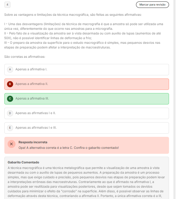 <p>4 Marcar para revisão Sobre as vantagens e limitações da técnica são feitas as seguintes afirmativas: Uma das desvantagens (limitações) da técnica de macrografia é que a amostra pode ser utilizada uma unica vez, diferentemente do que ocorre nas amostras para a micrografia. Pelo fato de a visualização da amostra ser à vista desarmada ou com auxilio de lupas (aumentos de até 50X), não é possível identificar linhas de deformação a frio; III - preparo da amostra da para estudo é simples, mas pequenos desvios nas etapas de preparação podem afetar a interpretação de macroestruturas São corretas as afirmativas: A Apenas a afirmativa B Apenas a afirmativa II. Apenas a afirmativa III. D Apenas as afirmativas e II. E Apenas as afirmativas e III. Resposta incorreta Opal A alternativa correta é a letra Confira gabarito comentado! Gabarito Comentado A técnica é uma técnica que permite a visualização de uma amostra à vista desarmada ou com de lupas de pequenos A preparação da amostra é um processo simples, mas que exige cuidado e precisão, pois pequenos desvios nas etapas de preparação podem levar a interpretações errôneas das macroestruturas Contrariamente ao que é afirmado na afirmativa a amostra pode ser reutilizada para visualizações posteriores, desde que sejam tomados os devidos cuidados para minimizar efeito da "corrosão" na Além disso, é possível observar as linhas de deformação através desta técnica, contrariando a afirmativa II. Portanto, a afirmativa correta é a III,</p>