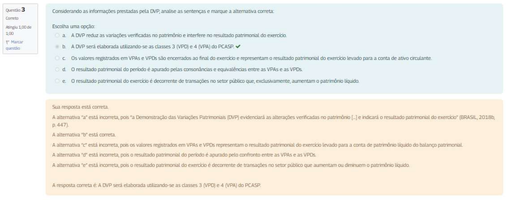<p>Questão 3 Considerando as informações prestadas pela DVP, analise as sentenças e marque a alternativa correta: Correto Atingiu 1,00 de Escolha uma opção: 1,00 A DVP reduz as variações verificadas no patrimônio e interfere no resultado patrimonial do exercício. Marcar questão b. A DVP será elaborada utilizando-se as classes 3 (VPD) e 4 (VPA) do PCASP. Os valores registrados em VPAs e VPDs são encerrados ao final do exercício e representam resultado patrimonial do exercicio levado para a conta de ativo circulante. d. o resultado patrimonial do periodo é apurado pelas consonâncias e equivalências entre as VPAs e as VPDs. e. o resultado patrimonial do exercício é decorrente de transações no setor público que, exclusivamente, aumentam o patrimônio Sua resposta está A alternativa "a" está incorreta, pois "a Demonstração das Variações Patrimoniais (DVP) evidenciará as alterações verificadas no patrimônio [-] e indicará o resultado patrimonial do exercício" (BRASIL, 447). A alternativa "b" está correta. A alternativa está incorreta, pois os valores registrados em VPAs e VPDs representam o resultado patrimonial do exercicio levado para a conta de patrimônio do balanço patrimonial. A alternativa "d" está incorreta, pois resultado patrimonial do é apurado pelo confronto entre as VPAs e as VPDs. A alternativa "e" está incorreta, pois o resultado patrimonial do exercício é decorrente de transações no setor público que aumentam ou diminuem patrimônio A resposta correta A DVP será elaborada utilizando-se as classes 3 (VPD) e 4 (VPA) do PCASP.</p>