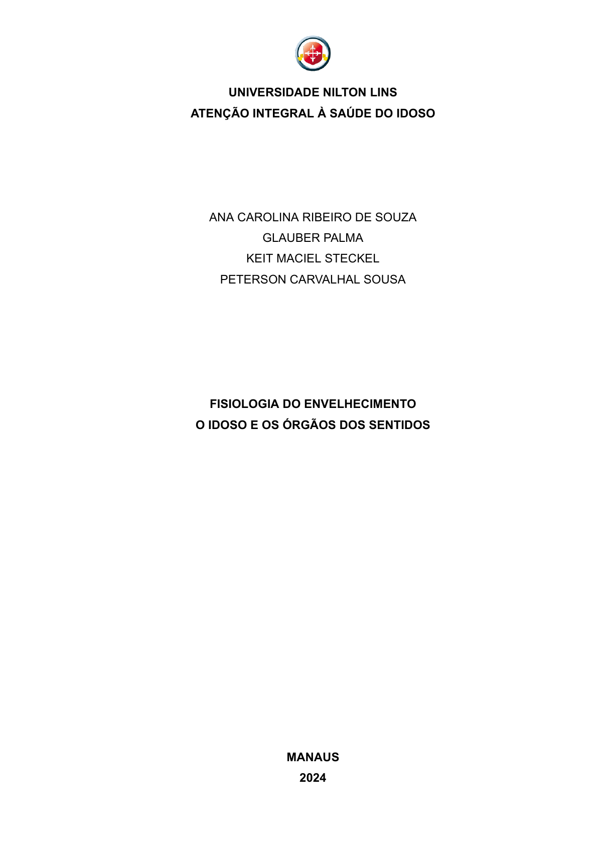 <p>UNIVERSIDADE NILTON LINS</p><p>ATENÇÃO INTEGRAL À SAÚDE DO IDOSO</p><p>ANA CAROLINA RIBEIRO DE SOUZA</p><p>GLAUBER PALMA</p><p>KEIT MACIEL STECKEL</p><p>PETERSON CARVALHAL SOUSA</p><p>FISIOLOGIA DO ENVELHECIMENTO</p><p>O IDOSO E OS ÓRGÃOS DOS SENTIDOS</p><p>MANAUS</p><p>2024</p><p>ANA CAROLINA RIBEIRO DE SOUZA</p><p>GLAUBER PALMA</p><p>KEIT MACIEL STECKEL</p><p>PETERSON CARVALHAL SOUSA</p><p>FISIOLOGIA DO ENVELHECIMENTO</p><p>O IDOSO E OS ÓRGÃOS DOS SENTIDOS</p><p>Trabalho apresentado à disciplina</p><p>Saúde do Idoso da Universidade</p><p>Nilton Lins como requisito para</p><p>obtenção de nota prática.</p><p>MANAUS</p><p>2024</p><p>SUMÁRIO</p><p>Introdução-—---------------------------------------------------------------------------------------------1</p><p>Olfato-—---------------------------------------------------------------------------------------------------1</p><p>Visão-—---------------------------------------------------------------------------------------------------2</p><p>Tato-—-----------------------------------------------------------------------------------------------------7</p><p>Audição-—------------------------------------------------------------------------------------------------8</p><p>Envelhecimento cardiovascular—-----------------------------------------------------------------15</p><p>Envelhecimento endócrino-—----------------------------------------------------------------------15</p><p>Envelhecimento respiratório—---------------------------------------------------------------------16</p><p>Imunidade e envelhecimento—--------------------------------------------------------------------18</p><p>Envelhecimento e massa muscular—-------------------------------------------------------------9</p><p>Envelhecimento e sistema nervoso—------------------------------------------------------------20</p><p>Envelhecimento e sistema digestório-—---------------------------------------------------------21</p><p>Bibliografia—--------------------------------------------------------------------------------------------22</p><p>1</p><p>1. INTRODUÇÃO</p><p>Durante o processo de envelhecimento a capacidade de interagir com o</p><p>ambiente e perceber estímulos sofre alterações. Em idosos, déficits sensoriais</p><p>podem se instaurar de forma gradual, resultando em alterações das atividades</p><p>rotineiras e redução da funcionalidade. Aumentando a dependência</p><p>Com o avanço da idade o nível de sensibilidade dos órgãos dos sentidos</p><p>tende a apresentar diminuição, resultando em um processo de redução da</p><p>capacidade visual, auditiva, tátil, olfativa e gustativa. A perda de tais percepções</p><p>está relacionada a maiores riscos no cotidiano de pessoas idosas, pois impacta</p><p>diretamente na capacidade de interpretar situações de risco e também de observar</p><p>mudanças ambientais ao seu redor.</p><p>Cabe aos profissionais de saúde observar tais mudanças sensoriais ao longo</p><p>do tempo de acompanhamento ao paciente idoso para que dessa forma seja</p><p>possível apresentar soluções que contornam situações incapacitantes.</p><p>2. OLFATO</p><p>2.1. ASPECTOS GERAIS</p><p>O olfato é uma sensação processada do rinencéfalo, uma das regiões</p><p>cerebrais mais primitivas, tal sensação auxilia no processo gustativo e participa da</p><p>percepção ambiental, sendo responsável até mesmo por identificar situações de</p><p>perigo relacionadas ao odor de substâncias que oferecem riscos.</p><p>Durante o processo de envelhecimento fisiológico alterações olfativas são</p><p>mais comuns que alterações gustativas. Ademais, o lobo temporal medial,</p><p>responsável pela identificação de odores, é uma das regiões mais precocemente</p><p>afetadas por doenças associadas à população mais velha, como Alzheimer e</p><p>demência vascular.</p><p>2.2. FISIOLOGIA OLFATIVA</p><p>O neurônios presentes no epitélio olfatório, estão localizados no teto da</p><p>cavidade nasal e desempenham o papel de receptores olfativos. para a formação</p><p>2</p><p>da sensação é necessário que o odor se dilua no muco nasal e estimule os</p><p>receptores neuronais através de despolarização, o estímulo segue até o hipocampo</p><p>e nessa estrutura ocorre a percepção do odor.</p><p>2.3. FISIOLOGIA DO ENVELHECIMENTO DO OLFATO</p><p>Em pacientes idosos ocorre alteração de secreção do muco nasal, em que</p><p>esta encontra-se reduzida, associada a maior fluidez do muco produzido. Outro</p><p>ponto importante é a ocorrência de metaplasia do epitélio sensorial nasal, tendo em</p><p>vista que ele é substituído por uma mucosa respiratória menos espessa e com</p><p>menor concentração de neurônios.</p><p>3. VISÃO</p><p>3.1 ANATOMIA E FISIOLOGIA DA VISÃO</p><p>A função visual normal compreende as capacidades de perceber, discriminar</p><p>e interpretar estímulos luminosos. E para isso é necessário nitidez nas imagens</p><p>interpretadas e formadas por meio da acuidade visual, que é caracterizada pela</p><p>capacidade de distinguir contornos, cores e a forma das coisas.</p><p>Para que haja uma visão normal, a luz visível, que corresponde ao espectro</p><p>no intervalo entre 380 e 760 nm de comprimento de onda, deve atravessar a córnea,</p><p>o cristalino e o corpo vítreo, chegando à retina. Esta por sua vez será sensibilizada</p><p>pela luz, emitindo impulsos elétricos por meio da via óptica ao cérebro, que os</p><p>interpreta e cria as imagens.</p><p>Essa capacidade visual é promovida pelo sistema fotorreceptor, que pode ser</p><p>dividido didaticamente em: túnica fibrosa ou externa, que compreende as estruturas</p><p>da córnea e da esclera; túnica vascular ou média, compreendendo a íris e corpo</p><p>ciliar no segmento anterior e a coroide em seu segmento posterior; além da túnica</p><p>neurossensorial que se refere à região mais nobre do olho humano formada</p><p>