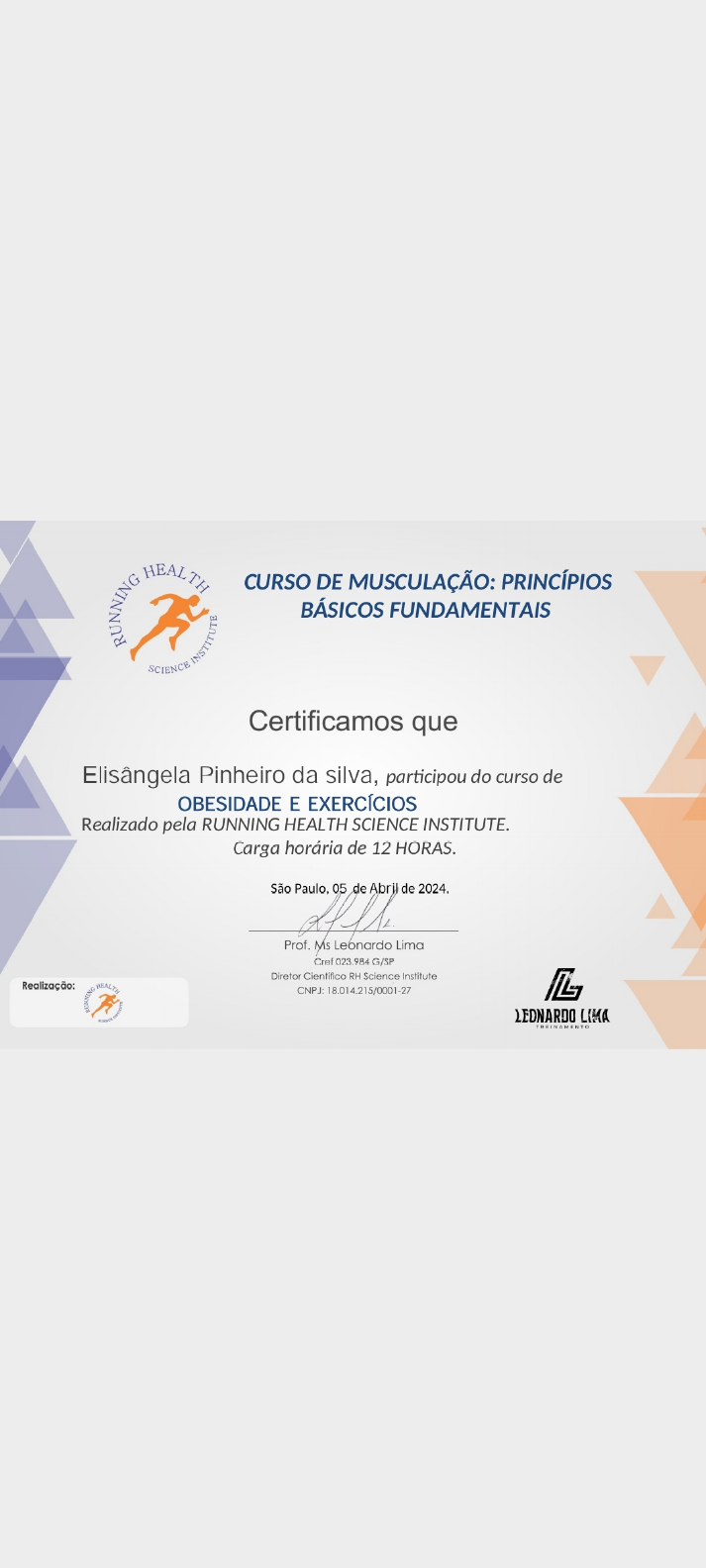 <p>HEALTH CURSO DE MUSCULAÇÃO: PRINCÍPIOS K BÁSICOS FUNDAMENTAIS SCIENCE Certificamos que Elisângela Pinheiro da silva, participou do curso de OBESIDADE E EXERCÍCIOS Realizado pela RUNNING HEALTH SCIENCE INSTITUTE. Carga horária de 12 HORAS. São Paulo, 05 de Abril de 2024. Prof. Ms Leonardo Lima Cref 023.984 G/SP Diretor RH Science Institute Realização: HEALTH CNPJ: 18.014.215/0001-27 LEDNARDO LIMA TREINAMENTO</p>