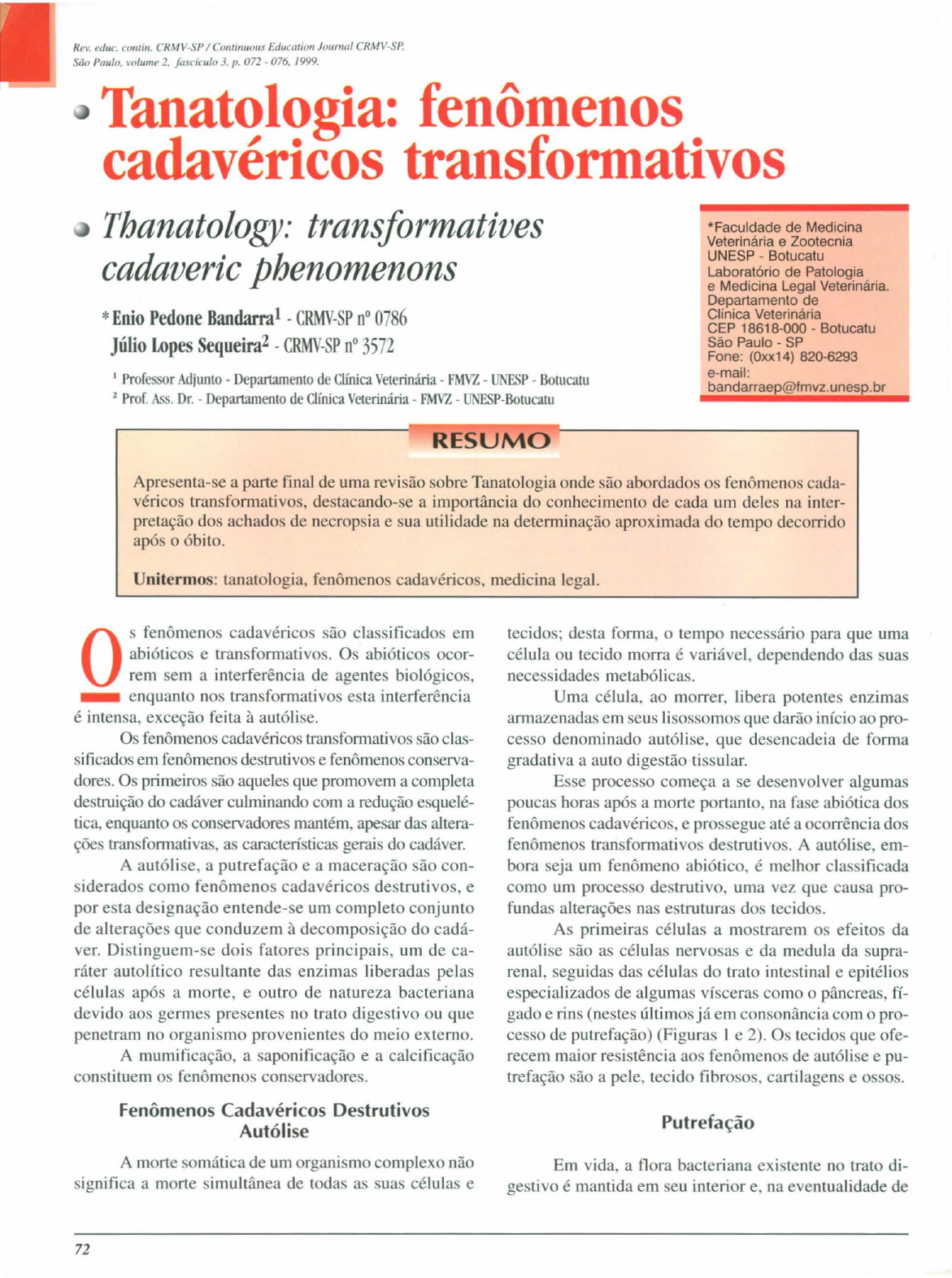 <p>Re~ .. educo comino CRMV-SP / Cominuous Educatioll Jouma/ CRMV-SP.</p><p>Seio Pau/o, volume 2. fascículo]. p. 072·076, 1999.</p><p>Tanatologia: fenômenos</p><p>cadavéricos transformativos</p><p>Thanatology: transformatives</p><p>cadaveric phenomenons</p><p>*Enio Pedone Bandarra1 - CRMV-SP n° 0786</p><p>Júlio Lopes Sequeira2 - CRMV-SP n° 3572</p><p>I Professor Adjunto - Departamento de Clínica Veterinária - FMVZ - UNESP - Botucatu</p><p>2 Prof. Ass. Dr. - Departamento de Clínica Veterinária - FMVZ - UNESP-Botucatu</p><p>I RESUMO</p><p>·Faculdade de Medicina</p><p>Veterinária e Zootecnia</p><p>UNESP - Botucatu</p><p>Laboratório de Patologia</p><p>e Medicina Legal Veterinária.</p><p>Departamento de</p><p>Clínica Veterinária</p><p>CEP 18618-000 - Botucatu</p><p>São Paulo - SP</p><p>Fone: (Oxx14) 820-6293</p><p>e-maíl:</p><p>bandarraep@fmvz.unesp.br</p><p>Apresenta-se a parte final de uma revisão sobre Tanatologia onde são abordados os fenômenos cada</p><p>véricos transformativos, destacando-se a importância do conhecimento de cada um deles na inter</p><p>pretação dos achados de necropsia e sua utilidade na determinação aproximada do tempo decorrido</p><p>após o óbito.</p><p>Unitermos: tanatologia, fenômenos cadavéricos, medicina legal.</p><p>os fenômenos cadavéricos são classificados em</p><p>abióticos e transformativos. Os abióticos ocor</p><p>rem sem a interferência de agentes biológicos,</p><p>_ enquanto nos transformativos esta interferência</p><p>é intensa, exceção feita à autólise.</p><p>Os fenômenos cadavéricos transformativos são clas</p><p>sificados em fenômenos destrutivos e fenômenos conserva</p><p>dores. Os primeiros são aqueles que promovem a completa</p><p>destruição do cadáver culminando com a redução esquelé</p><p>tica, enquanto os conservadores mantém, apesar das altera</p><p>ções transformativas, as características gerais do cadáver.</p><p>A autólise, a putrefação e a maceração são con</p><p>siderados como fenômenos cadavéricos destrutivos, e</p><p>por esta designação entende-se um completo conjunto</p><p>de alterações que conduzem à decomposição do cadá</p><p>ver. Distinguem-se dois fatores principais, um de ca</p><p>ráter autolítico resultante das enzimas liberadas pelas</p><p>células após a morte, e outro de natureza bacteriana</p><p>devido aos germes presentes no trato digestivo ou que</p><p>penetram no organismo provenientes do meio externo.</p><p>A mumificação, a saponificação e a calcificação</p><p>constituem os fenômenos conservadores.</p><p>Fenômenos Cadavéricos Destrutivos</p><p>Autólise</p><p>A morte somática de um organismo complexo não</p><p>significa a morte simultânea de todas as suas células e</p><p>72</p><p>tecidos; desta forma, o tempo necessário para que uma</p><p>célula ou tecido morra é variável, dependendo das suas</p><p>necessidades metabólicas.</p><p>Uma célula, ao morrer, libera potentes enzimas</p><p>armazenadas em seus lisossomos que darão início ao pro</p><p>cesso denominado autólise, que desencadeia de forma</p><p>gradativa a auto digestão tissular.</p><p>Esse processo começa a se desenvolver algumas</p><p>poucas horas após a morte portanto, na fase abiótica dos</p><p>fenômenos cadavéricos, e prossegue até a ocorrência dos</p><p>fenômenos transformativos destrutivos. A autólise, em</p><p>bora seja um fenômeno abiótico, é melhor classificada</p><p>como um processo destrutivo, uma vez que causa pro</p><p>fundas alterações nas estruturas dos tecidos.</p><p>As primeiras células a mostrarem os efeitos da</p><p>autólise são as células nervosas e da medula da supra</p><p>renal, seguidas das células do trato intestinal e epitélios</p><p>especializados de algumas vísceras como o pâncreas, fí</p><p>gado e rins (nestes últimos já em consonância com o pro</p><p>cesso de putrefação) (Figuras I e 2). Os tecidos que ofe</p><p>recem maior resistência aos fenômenos de autólise e pu</p><p>trefação são a pele, tecido fibrosos, cartilagens e ossos.</p><p>Putrefação</p><p>Em vida, a flora bacteriana existente no trato di</p><p>gestivo é mantida em seu interior e, na eventualidade de</p><p>BA DARRA, E. P.; SEQUEIRA. J. L. Tanatologia: fenômenos cadavéricos transfonnalivos. I ThalJal%gy: transfomlath'es cadal'er;c phenomenons I Rev. educo</p><p>contin. CRM-V-SP I COlllillUOIIS Educat;oll Jouma/ CRMV-SP, São Paulo, volume 2, fascículo 3, p. 072 - 076,1999.</p><p>Figura I - Autólise e início de putrefação em fígado.</p><p>qualquer microorganismo penetrar na parede intesti</p><p>nal, ele é rapidamente destruído, em condições nor</p><p>mais, pelas defesas orgânicas que constituem a bar</p><p>reira intestinal. No cadáver, estes mesmos microor</p><p>ganismos, decorrido certo tempo, vencem esta bar</p><p>reira e penetram no tecido e nos vasos sangüíneos</p><p>onde se multiplicam rapidamente; a produção de ga</p><p>ses, pelo metabolismo bacteriano, e a pressão por eles</p><p>produzida em cavidades fechadas empurra o sangue</p><p>carregado de bactérias, difundindo-as pelo organis</p><p>mo, formando-se uma autêntica "circulação cadavé</p><p>rica" ou post-mortem evidentemente passiva, estabe</p><p>lecendo-se, dessa maneira, a generalização do pro</p><p>cesso de putrefação, a princípio limitada às zonas</p><p>centrais do cadáver.</p><p>Fazem exceção a essa regra os fetos e recém</p><p>nascidos cujo intestino é estéril e os animais trata</p><p>dos por longos períodos com antibióticos por via oral;</p><p>nestes casos, e abstraindo-se os fenômenos de autó</p><p>lise, a putrefação inicia-se sempre pelo exterior do</p><p>animal.</p><p>Existem condições extrínsecas e intrínsecas que</p><p>podem modificar a marcha da putrefação. Entre as ex</p><p>trínsecas destacam-se as seguintes:</p><p>• Temperatura ambiente: temperaturas inferio</p><p>res a zero grau centígrado conservam o cadáver quase<