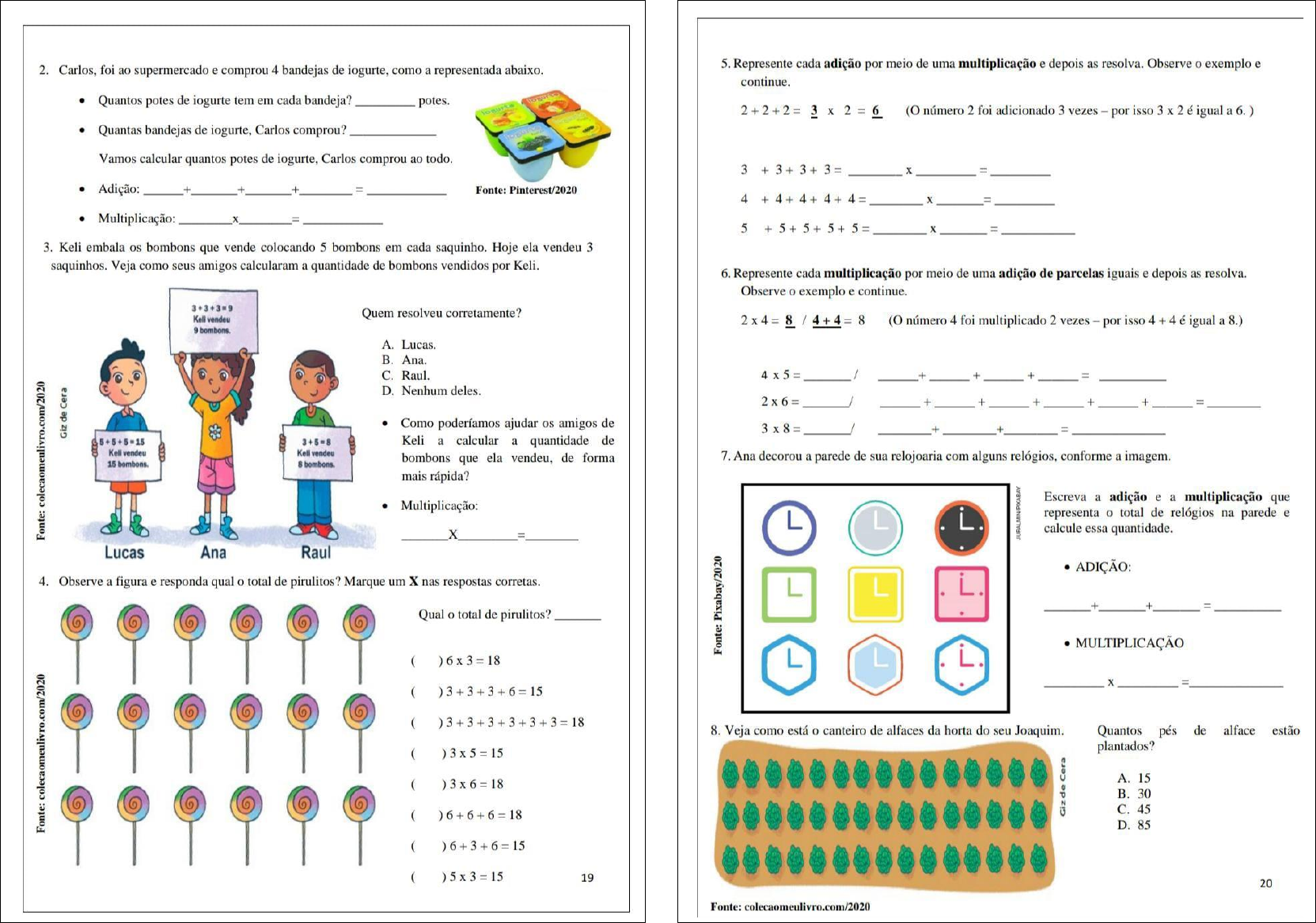<p>5. Represente cada adição por meio de uma multiplicação e depois as resolva. Observe exemplo e 2. Carlos, foi ao supermercado e comprou 4 bandejas de iogurte, como a representada abaixo. continue. Quantos potes de iogurte tem em cada bandeja? potes. +2+2 = 3 X 2 = 6 (O número 2 foi adicionado 3 vezes - por isso 3 X 2 é igual a 6.) Quantas bandejas de iogurte, Carlos comprou? Vamos calcular quantos potes de iogurte, Carlos comprou ao 3 = X = Adição: + + + = Fonte: Pinterest/2020 4 + 4 + 4 + 4 + 4 = X = Multiplicação: X = 5 +5+5+5+5 X = 3. Keli embala os bombons que vende colocando 5 bombons em cada saquinho. Hoje ela vendeu 3 saquinhos. Veja como seus amigos calcularam a quantidade de bombons vendidos por Keli. 6. Represente cada multiplicação por meio de uma adição de parcelas iguais e depois as resolva. Observe exemplo e continue. Kell vendeu Quem resolveu corretamente? = 8 / 4+4 = 8 (O número 4 foi multiplicado 2 vezes - por isso 4+4é igual a 8.) A. Lucas. B. Ana. C. Raul. 4 5 = / + + + = D. Nenhum deles. 2 6 = / + + + + + = de Como poderíamos ajudar os amigos de 3 8 = / + + = 15 3 Keli a calcular a quantidade de Kell vendeu Kell vendeu bombons que ela vendeu, de forma 7. Ana decorou a parede de sua relojoaria com alguns relógios, conforme a imagem. 15 8 mais rápida? Escreva a adição e a multiplicação que Multiplicação: L representa total de relógios na parede e X calcule essa quantidade = Lucas Ana Raul ADIÇÃO: 4. Observe a figura e responda qual total de pirulitos? Marque um X nas respostas corretas. L L + + = 6 Qual total de pirulitos? MULTIPLICAÇÃO ( ) 6x3=18 L L X = ( ) 03+3+3+6=15 6 6 6 ( ) 3 +3+3+3+3+3=18 8. Veja como está canteiro de alfaces da horta do seu Quantos pés de alface estão plantados? ( ) A. 15 ( ) 6 B. 30 C. 45 ( ) D. 85 ( ) ( ) 19 20 Fonte:</p><p>9. Quantos reais dona Joana gastou para comprar 4 caixas de leite? 13. Escreva de 4 (quatro) formas diferentes, a quantidade de losangos que têm na figura abaixo: ADIÇÃO: + + + = R$ 5,00 MULTIPLICAÇÃO X = Fonte: aquarelamatematica.com.br/2020 2 formas de Adição: 10. Seu Manoel tem uma banca de frutas na feira. Observe preço das frutas e calcule: Se eu comprar 4 (quatro) abacaxis? Quanto gastar? 2 formas de Multiplicação: Adição: + + + = 14. Observe a decoração feita em uma parede com azulejos e depois responda as perguntas. Multiplicação: X = 3.00 E se levar também 9 (nove) mangas? Quanto vou 8.00 gastar? Adição: + + = FRUTAS Multiplicação: X = 11. Mário gastou R$ 32,00 com materiais Paulo gastou dobro de Luciano gastou triplo de Paulo. Fonte: aquarelamatematica.com.br/2020 Complete as frases a seguir com a quantia que cada um gastou. a) Calcule o número de azulejos pintados de vermelho. Adição: Paulo gastou reais. Luciano gastou reais. Multiplicação: Fonte: galeria.colorir.com/2020 b) Quantos azulejos foram pintados de azul-claro? 12. A escola de Ana foi visitar aquário da cidade de São No total, foram 20 crianças, e cada Adição: uma pagou 5 reais pelo ingresso. Quanto pagaram no total? Multiplicação: Adição: + + + + = c) Qual o total de azulejos pintados de verde? Adição: Multiplicação: X = Multiplicação: 21 22</p><p>VAMOS CALCULAR! 4 - Resolva as multiplicações: a) 3.231 b) 3.273 c) 7.273 d) 2.329 e) 5.028 X 5 X 5 5 5 X 5 DM UM C D U DM UM D U DM UM D U DM UM C D U DM UM C D U 1 1 1 1 1. 1 f) 2.406 g) 3.240 h) 4.275 i) 2.023 j) 2.078 X 2 2 2 2 5 5 5 5 X 5 2 2 2 2 2 2 2 1 - Resolva as multiplicações (2): 5 - Resolva as multiplicações: a) 1.271 b) 5.279 c) 7.274 d) 4.229 e) 5.523 a) 4.281 b) 3.773 c) 5.273 d) 8.829 e) 5.829 X 2 2 X 2 2 X 2 X 6 6 X 6 6 X 6 f) 5.476 g) 4.241 h) 5.277 i) 8.623 j) 4.578 f) 5.466 g) 7.041 h) 5.270 i) 6.623 j) 3.079 X 2 2 X 2 2 X 2 6 6 6 5 X 6 2 - Resolva as multiplicações (3): 6 - Resolva as multiplicações: a) 9.071 b) 5.001 c) 2.009 d) 4.029 e) 2.025 a) 7.287 b) 8.703 c) 5.206 d) 4.809 e) 6.809 X 3 3 3 3 X 3 X 7 X 7 7 7 X 7 f) 5.571 g) 3.072 h) 2.766 i) 1.520 j) 1.201 f) 6.469 g) 6.641 h) 8.278 i) 4.653 j) 5.559 3 3 3 X 3 X 3 7 7 6 X 7 X 7 3 - Resolva as multiplicações (4): 7 - Resolva as multiplicações: a) 2.070 b) 3.201 c) 2.201 d) 4.029 e) 2.521 a) 5.587 b) 2.733 c) 9.406 d) 7.833 e) 5.839 X 4 X 4 4 4 X 4 8 X 8 8 8 X 8 f) 4.070 g) 2.001 h) 3.777 i) 8.820 j) 6.600 f) 6.569 g) 6.663 h) 5.578 i) 5.553 j) 7.500 4 X 4 4 4 4 9 9 X 9 9 9 @atividadesanosiniciais @atividadesanosiniciais</p><p>ESCOLA ESCOLA NOME: DATA: / / NOME: DATA: / / PROFESSORA: TURMA: PROFESSORA: TURMA: PRESTE ATENÇÃO! PRESTE ATENÇÃO! 1 - RESOLVA AS OPERAÇÕES: 1 - RESOLVA AS OPERAÇÕES: a) b) c) 2 002 x 72 d) 2 a) b) c) 102 e) f) 3 327x54 g) h) e) 25 X 33 f) 77 X 33 g) h) 55 x 33 i) 5 106x67 j) k) 3 I) i) 66 X 44 j) 123 X 44 k) @atividadesanosiniciais @atividadesanosiniciais</p><p>Resolva os problemas usando seus conhecimentos em multiplicação. 10. Comprei 3 caixas de morango com 50 unidades em cada uma. Quantos morangos eu comprei ao todo? 7. Num parque de diversão há 16 carrinhos. Em cada carrinho cabem 2 pessoas. Quantas pessoas podem andar nos carrinhos em cada vez? Fonte: Flickr.com/2020 11. Uma fábrica de automóveis monta 82 carros por semana. Quantos carros ela pode montar em 6 semanas? Fonte: Pinterest/2020 8. Dona Suely comprou 4 embalagens como essa de ovos. Quantos ovos ela comprou ao todo? Fonte: Pinterest/2020 12. Em um estacionamento há 8 carros e 3 motos. Quanto receberá o dono do estacionamento se todos esses veículos ficarem estacionados durante 2 horas? Fonte: Pixabay/2020 9. Cada estante da biblioteca da escola acomoda 53 livros. A bibliotecária, hoje arrumou 5 estantes. Quantos livros foram arrumados? Fonte: colecaomeulivro.com/2020 CARROS: 5,00 R$ a hora MOTOS: 3,00 R$ a hora TOTAL: Fonte: Freepik.com/2020</p><p>PROBLEMAS DE MULTIPLICAÇÃO 6. Durante as férias escolares, Paulinha viajou para Porto Seguro, onde tirou muitas fotos com 3. Na banca de dona Inês, têm 8 caixas de Em cada uma delas, ca