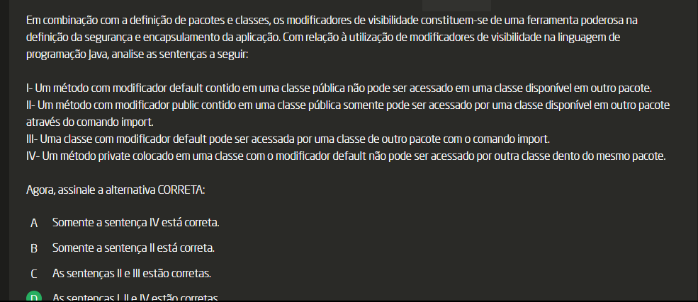 <p>Em combinação com a definição de pacotes e classes, os modificadores de visibilidade constituem-se de uma ferramenta poderosa na definição da segurança e encapsulamento da aplicação. Com relação à utilização de modificadores de visibilidade na linguagem de programação Java, analise as sentenças a seguir: Um método com modificador default contido em uma classe pública não pode ser acessado em uma classe disponível em outro pacote. II- Um método com modificador public contido em uma classe pública somente pode ser acessado por uma classe disponível em outro pacote através do comando import. III- Uma classe com modificador default pode ser acessada por uma classe de outro pacote com comando import. IV Um método private colocado em uma classe com modificador default não pode ser acessado por outra classe dento do mesmo pacote. Agora, assinale a alternativa CORRETA: A Somente a sentença IV está correta. B Somente a sentença está correta. C As sentenças II e III estão corretas. As e IV corretas</p>