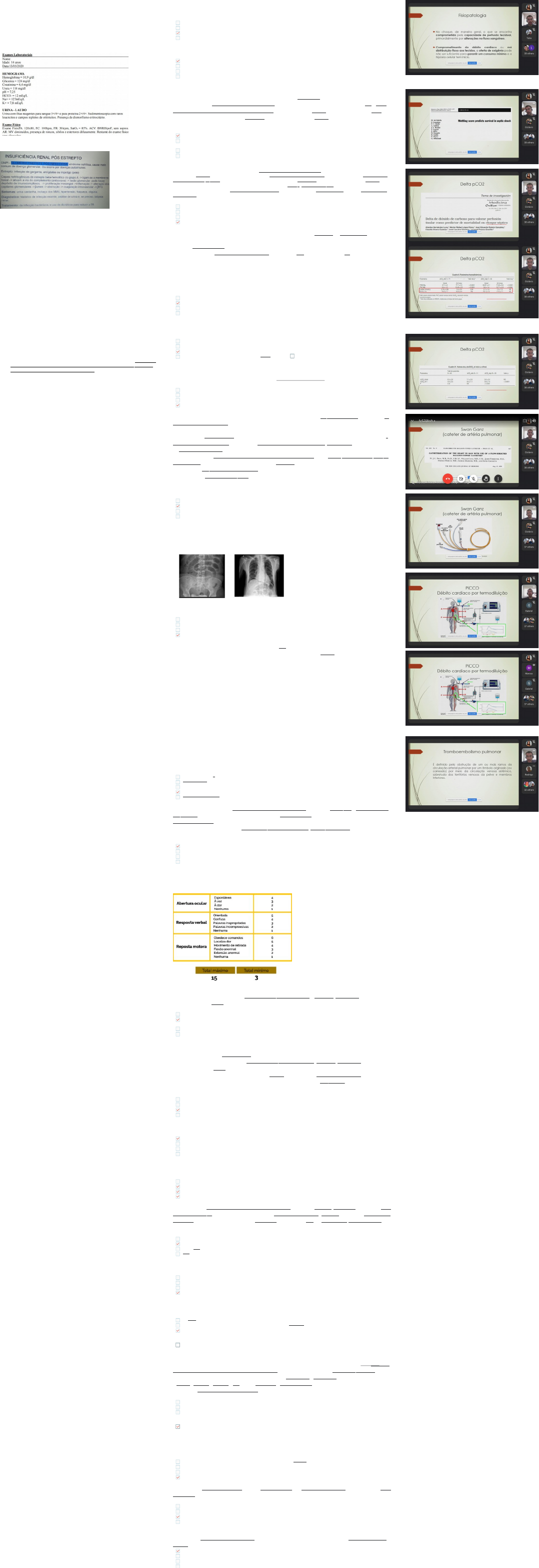 <p>prova</p><p>terça-feira, 2 de março de 2021 15:32</p><p>Mulher, 14 anos</p><p>Náusea, vômito, tontura há 4 dias, piorando nas últimas horas Urina escura e oligúria, hematúria e proteinúria</p><p>· Sedimentos com raros leucócitos e campos repletos de eritrócitos</p><p>· Presença de dismorfismo eritrocitário Edema de MMII e olhos</p><p>22 dias atrás teve amidaglite</p><p>Já internou por pneumonia as 7 anos</p><p>· Na:127 (V.R: 135-145 mmol/L) - HIPONATREMIA</p><p>· K:7,8 mmol/L; (V.R: 3,5-5): HIPERCALEMIA</p><p>· Ureia:114 mg/dL; (V.R: 10-20mg/dL)</p><p>No caso apresentado, a paciente de 14 anos relatou possuir cansaço aos mínimos esforços, náuseas, vômitos, tontura (há 4 dias) com piora progressiva nos últimos dias. Relatou também possuir colúria (urina escura) e oligúria, com edema de membros inferiores e olhos. Ao ser questionada sobre sua história pregressa, a paciente relatou ter tido um quadro de pneumonia (aos 7 anos de idade) e amigdalite não tratatada, há 22 dias.</p><p>Com relação a hipótese diagnóstica (HD), sugere-se, diante dos achados clinicos e laboratoriais, que a paciente apresenta um quadro agudizado de glomerulonefrite (síndrome nefrítica), provavelmente de origem pós- estreptocócica, advinda da amigdalite bacteriana não tratada.</p><p>A glomerulonefrite, por definição, é um processo infeccioso agudo que acomete os glomérulos, levando à retenção de Na (devido à sua dificuldade de excreção). Pode-se elucidar a fisiopatogenia da IRA pós estreptocócica da seguinte maneira:</p><p>- Cepas nefritogênicas de estrepto beta-hemolíticos do grupo A ligam-se à membrana basal e ativam a via do complementos, responsável pela produção de anticorpos. Esses anticorpos podem levar ao depósito de imunocomplexo, causando lesão glomerular. Na tentativa de reestabelecer a fisiologia renal normal, o organismo realiza a proliferação de células mesangiais, o que evolui para um quadro inflamatório com alteração dos capilares glomerulares e, por consequência, do lúmen, gerando obstrução, coagulação intravascular e, por fim, redução da taxa de filtração glomerular.</p><p>A HD gerada foi embasada nos seguintes aspectos:</p><p>· Valor de creatinina e uréia elevados de forma aguda: sugestivo de acometimento renal, com retençao dessas substâncias no organismo</p><p>· Presença de hematúria (principal marcador clínico), decorrente da provável ruptura e lesão de pequenas alças capilares</p><p>· Presença de proteinúria (de moderada intensidade: 2+/4+), decorrente da provável perda da barreira de filtração</p><p>· Presença de edema dos olhos e do membros inferiores, advindo provalmente da proteinúria, fazendo com que haja redução da pressão oncótica capilar e extravazamento de líquido para o meio intertiscial e sobrecarga da drenagem linfática</p><p>· Presença de dismorfismo eritrocitario, oriundo da deformação das hemácias ao passarem pelos capilares fenestrados, as quais são ''rasgadas'', adquirindo aspecto dismórfico. OBS: o dismorfismo é um ponto importante na diferenciação e identificação de hematúria de origem glomerular ou não, uma vez em casos de hematúria por cálculos, por exemplo, não há presença de alterações morfológicas</p><p>· Presença de uremia de 114 mg/dL; (V.R: 10-20mg/dL), gerando uma síndrome composta por distúrbios neurológicos (justificando o cansaço, a fraqueza e a tontura relatadas), cardiovasculares (justificando o aumento da FC), pulmonares (embasando as alteraçoes nos exames do aparelho respiratórios encontrados, como a presença de sibilos, estertores e roncos difusos, além da redução dos MV), digestivas (justificando as náuseas e vômitos apresentados) e hematológicos (comprovando e alterações linfocitárias)</p><p>· Presença de hiperglicemia, devido à alteração na bomba de Sódio-Glicose renal</p><p>· Presença de alterações hidroeletrolíticas como:</p><p>· Hiponatremia - Na:127 (V.R: 135-145 mmol/L): decorente do aumento relativo ou absoluto de água livre (provavelmente oriundo da perda de flúidos hipotônicos no vômito relatado pela paciente)</p><p>· Hipercalemia - K:7,8 mmol/L; (V.R: 3,5-5), podendo ser agravada pelo quadro acidótico da paciente (Ph 7,25 com HCO3: 12mEq/L)</p><p>· Presença de acidose metabólica, devido a queda do Ph (7,25) e do bicarbontato (12mEq/L), provavelmente advindo da incapacidade do rim em regenerar bicarbonato e excretar acidos.</p><p>· Presença de colúria, devido ao dano glomerular apresentado e a presença de hematúria macroscópica que ocorre na maioria dos casos</p><p>· Presença de oligúria, devido à queda da taxa de filtração glomerular, e consequentemente, menor formaçao da urina</p><p>· Alterações no exame físico com taquicardia, taquipnéica, hipofonese de bulhas e desaturação da paciente devido à congestão circulatória oriunda da hipervolemia</p><p>Qual a principal causa de hemorragia digestiva maciça? 1 ponto</p><p>Úlcera péptica</p><p>Neoplasia Gastrica Varizes esofagianas</p><p>Doença priônica (Creutzfeldt-Jakob)</p><p>O(s) principal(is) e primeiro(s) exame(s) necessário()s para o diagnóstico de hemorragia digestiva baixa é: 1 ponto</p><p>Colonoscopia e retossigmoidoscopia Endoscopia e Hemograma Completo Raio x simples de abdome e Biopsia</p><p>Ultrassonografia abdomial total com enfase em pelve</p><p>Homem de 66 anos foi hospitalizado há 6 dias com IAM. Hoje ele queixou de vaga dor epigástrica, mas o eletrocardiograma e os marcadores de necrose miocardica excluíram a possibilidade de novo IAM. Algumas horas mais tarde, o paciente começou a sentir tonteira e eliminou uma grande quantidade de fezes enegrecidas com odor fétido. Alguns minutos depois, vomitou aproximadamente 100ml de sangue. Neste momento, a pressão arterial (PA) estava 90\60mmHg e a frequência cardíaca estava 120bmp. O paciente foi transferido para a UTI. Qual a medida imediata