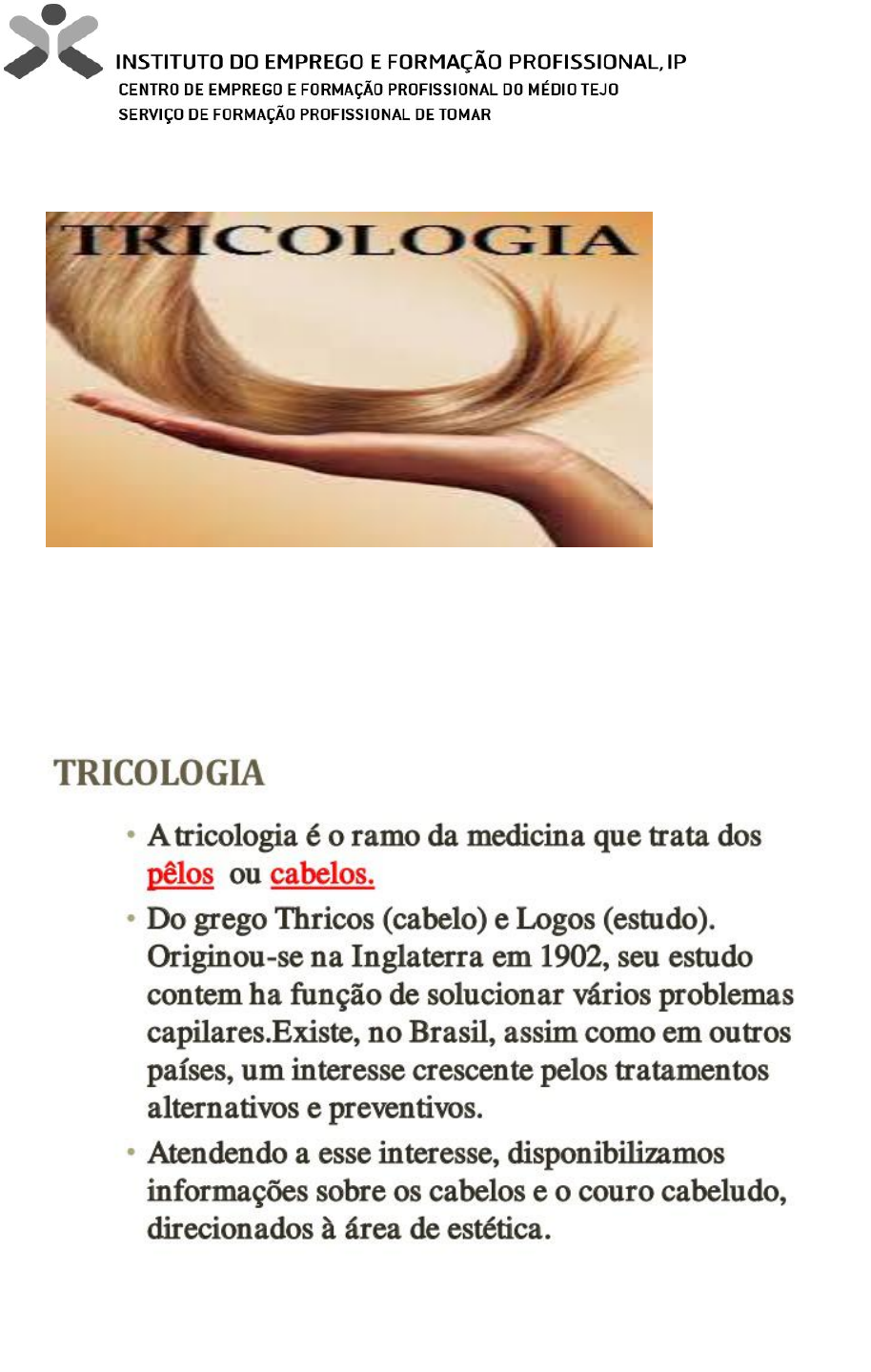 <p>Formadora: Sandrina Lourenço</p><p>Formadora: Sandrina Lourenço</p><p>* Analise das patologia do couro cabeludo e alterações da fibra</p><p>capilar:</p><p>Formadora: Sandrina Lourenço</p><p>Formadora: Sandrina Lourenço</p><p>Formadora: Sandrina Lourenço</p><p>Formadora: Sandrina Lourenço</p><p>Formadora: Sandrina Lourenço</p><p>Formadora: Sandrina Lourenço</p><p>Formadora: Sandrina Lourenço</p><p>Formadora: Sandrina Lourenço</p><p>Tipos de tratamento para o</p><p>cabelo (fechar a cutícula):</p><p>O tratamento capilar é responsável por reter ou repor a humidade</p><p>dentro do fio, assim como devolver os nutrientes e as proteínas</p><p>perdidos na fibra devido à ação de fatores mecânicos ou químicos.</p><p>Para que esse processo alcance o resultado desejado, é preciso</p><p>contar com os ingredientes certos.</p><p>Há uma série de procedimentos que são responsáveis por trazer</p><p>cuidados especiais para todos os tipos de danos sofridos pelos</p><p>cabelos. Para entender as diferenças entre eles e quais são os ideais</p><p>para cada tipo de cabelo.</p><p>Formadora: Sandrina Lourenço</p><p>1. Cauterização</p><p>Esse processo é especialmente indicado para cabelos que passaram</p><p>por processo de descoloração, bem como para quem se submeteu a</p><p>escovas progressivas, alisamentos e colorações, que deixam os fios</p><p>porosos.</p><p>O tratamento de cauterização possui três etapas: primeiramente, o</p><p>cabelo é hidratado.</p><p>Em seguida, ele passa por uma reconstrução e, enfim, a etapa de</p><p>cauterização.</p><p>Ou seja, as cutículas dos fios são fechadas após receberem a ação</p><p>das substâncias reestruturantes, uma finalização que garante mais</p><p>brilho e maciez.</p><p>E aconselhado fazer este tratamento logo após a descoloração para</p><p>recuperar o pH natural dos fios.</p><p>2. Humectação capilar</p><p>A humectação capilar funciona graças à ação dos óleos essenciais.</p><p>Eles hidratam e nutrem os fios, reparando problemas como frizz,</p><p>ressecamento e pontas duplas.</p><p>A aplicação do produto é feita por madeixas do cabelo, não lavado, e</p><p>esperar o tempo necessário para que ele aja.</p><p>E aconselhado a aplicação desse tipo de tratamento durante a noite e</p><p>a lavagem dos fios pela manhã.</p><p>É importante aplicar madeixa a madeixa, da altura da orelha até as</p><p>pontas, e espalhar o produto uniformemente.</p><p>http://blog.aneethun.com/guia-da-cauterizacao-capilar/</p><p>https://www.aneethun.com/produtos/tratamento/therapy/antiquebra-cronograma-capilar/</p><p>Formadora: Sandrina Lourenço</p><p>3. Com creme de tratamento</p><p>Os cremes de tratamento são ideais para hidratar os fios no dia a dia,</p><p>sendo usados como uma espécie de condicionador mais potente.</p><p>Eles atendem aos cabelos rebeldes e ressecados, fornecendo maior</p><p>capacidade de controle.</p><p>Para potencializar o efeito, é possível combinar o creme de</p><p>tratamento com um shampoo antirresíduos, (que tenha o pH</p><p>balanceado, ou seja neutro) para que ocorra uma limpeza eficiente e</p><p>delicada aos fios já ressecados.</p><p>Esse produto promove a dilatação necessária das cutículas durante</p><p>a lavagem, fazendo com que o creme de tratamento penetre na fibra</p><p>de forma mais potente.</p><p>4. Máscara capilar</p><p>Formadora: Sandrina Lourenço</p><p>A máscara capilar é um dos itens mais lembrados quando o assunto</p><p>é hidratação dos fios, sendo ideal para uso constante.</p><p>Após a lavagem dos cabelos com o shampoo indicado para otipo de</p><p>cabelo, tirar o excesso de água e aplicar uma porção nas madeixas.</p><p>A aplicação do produto tem que ser feita madeixa a madeixa,</p><p>evitando que o creme encoste no couro cabeludo.</p><p>Deixe agir por até dez minutos ou de acordo com o tempo indicado.</p><p>Enxáguar bem.</p><p>Cada estrutura de cabelo exige um tipo de máscara, mesmo que a</p><p>função principal seja a hidratação dos fios. Afinal, cada cabelo possui</p><p>necessidades e características próprias.</p><p>Um produto para fios muito danificados pode deixar um cabelo fino</p><p>sem volume, por exemplo.</p><p>Os cabelos oleosos precisam ser hidratados sem que fiquem com</p><p>aspeto pesado. Por isso, recomenda-se o uso de máscaras com</p><p>agentes como proteína de trigo, glicerina e chá-verde.</p><p>Já os cabelos ressecados precisam receber uma hidratação capilar</p><p>mais profunda, o que exige a ação de agentes emolientes, como a</p><p>queratina e óleos obtidos do argan, da macadâmia, da semente de</p><p>linhaça e do coco, por exemplo.</p><p>Os cabelos com volume precisam de ativos hidratantes potentes para</p><p>deixar os fios menos armados. A queratina, a aminoqueratina B3 e a</p><p>vitamina E são alguns desses ingredientes.</p><p>Os cabelos finos, por outro lado, precisam de uma hidratação que</p><p>não pese e ajude a deixar o fio mais encorpado. Ativos como</p><p>gengibre , chá verde e minerais ajudam a dar um pouco mais de</p><p>volume para os fios.</p><p>http://blog.aneethun.com/cabelos-oleosos-quais-sao-os-cuidados-necessarios/</p><p>http://blog.aneethun.com/cachos-naturais-dicas-e-cuidados-para-cabelos-perfeitos/</p><p>Formadora: Sandrina Lourenço</p><p>Por fim, os cabelos que passaram por procedimentos, como</p><p>progressivas e outros tratamentos mais propensos ao dano, precisam</p><p>de uma hidratação que não retire os agentes dos fios, prolongando</p><p>seu efeito. Máscaras com óleos de sementes e queratina ajudam</p><p>nessa missão. A queratina e os aminoácidos vegetais têm maior</p><p>compatibilidade com o fio e oferece uma hidratação mais intensa.</p><p>Para os cabelos coloridos precisa ter especial atenção: os princípios</p><p>ativos de cada máscara deve conter proteção solar, assim como</p><p>agentes antioxidantes para prevenir o desbotamento dos fios</p><p>coloridos.</p><p>5. Queratinização</p><p>Em