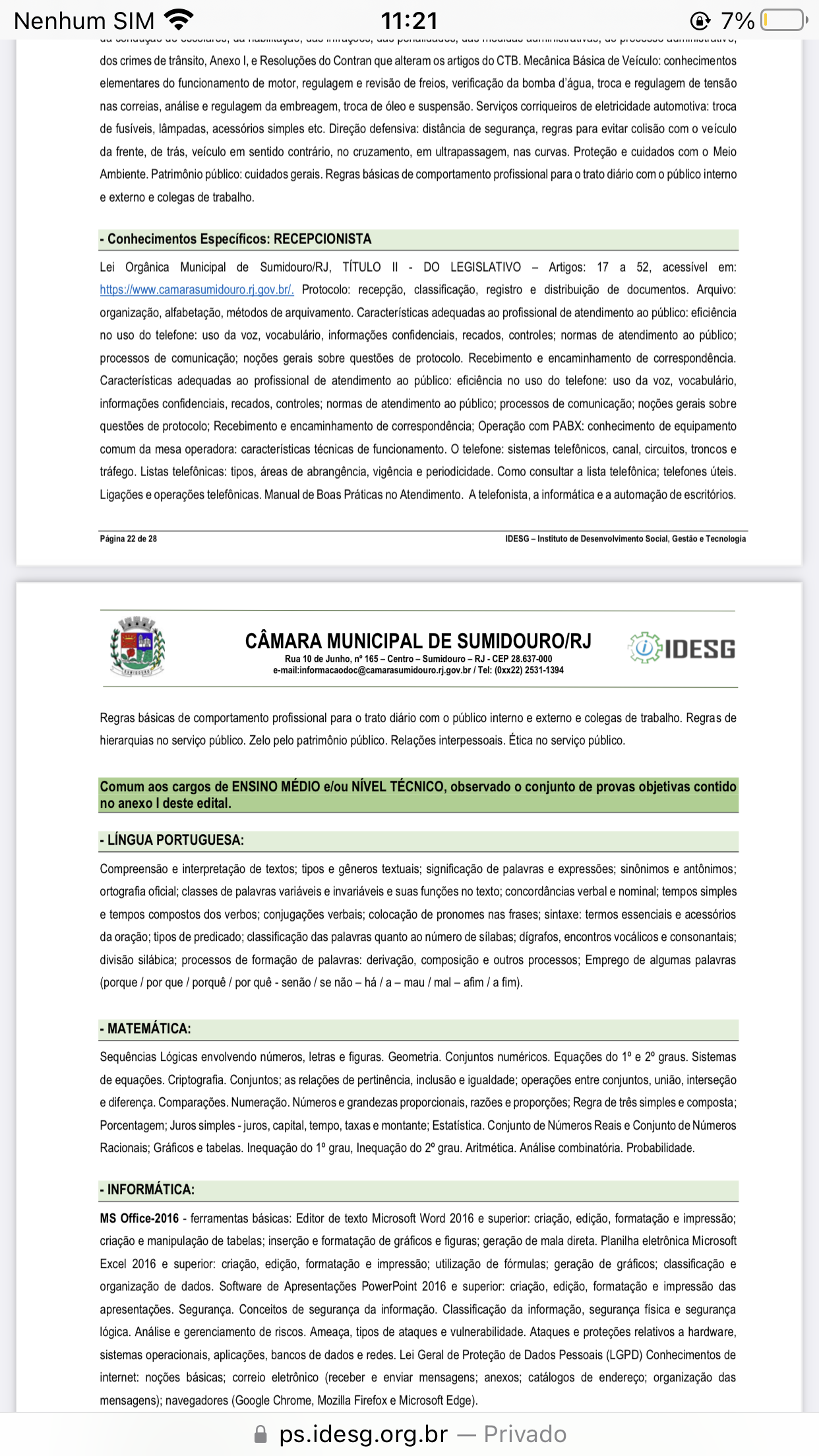 <p>Nenhum SIM 11:21 7% dos crimes de Anexo I, e Resoluções do Contran que alteram os artigos do CTB. Mecânica Básica de Veículo: conhecimentos elementares do funcionamento de motor, regulagem e revisão de freios, verificação da bomba troca e regulagem de tensão nas correias, análise e regulagem da embreagem, troca de óleo e suspensão. Serviços corriqueiros de eletricidade automotiva: troca de fusíveis, lâmpadas, acessórios simples etc. Direção defensiva: distância de segurança, regras para evitar colisão com veículo da frente, de trás, veículo em sentido contrário, no cruzamento, em ultrapassagem, nas curvas. Proteção e cuidados com Meio Ambiente. Patrimônio público: cuidados gerais. Regras básicas de comportamento profissional para trato diário com 0 público interno e externo e colegas de trabalho. Conhecimentos Específicos: RECEPCIONISTA Lei Orgânica Municipal de Sumidouro/RJ. TÍTULO DO LEGISLATIVO Artigos: 17 a acessível em: Protocolo: recepção, classificação, registro e distribuição de documentos. Arquivo: organização, alfabetação, métodos de arquivamento. Características adequadas ao profissional de atendimento ao público: eficiência no uso do telefone: uso da informações confidenciais, recados, controles; normas de atendimento ao público; processos de comunicação; noções gerais sobre questões de protocolo. Recebimento e encaminhamento de correspondência. Características adequadas ao profissional de atendimento ao público: eficiência no uso do telefone: uso da informações confidenciais, recados, controles; normas de atendimento ao público; processos de comunicação; noções gerais sobre questões de protocolo; Recebimento e encaminhamento de correspondência; Operação com PABX: conhecimento de equipamento comum da mesa operadora: características técnicas de telefone: sistemas telefônicos, canal, circuitos, troncos e tráfego. Listas telefônicas: tipos, áreas de abrangência, vigência e periodicidade. Como consultar a lista telefônica; telefones Ligações e operações Manual de Boas Práticas no A telefonista, a informática e a automação de escritórios. Página 22 de 28 IDESG Instituto de Desenvolvimento Gestão e Tecnologia CÂMARA MUNICIPAL DE SUMIDOURO/RJ IDESG Rua 10 de Junho, 165 Centro - Sumidouro RJ CEP 28.637-000 / Tel: (0xx22) 2531-1394 Regras básicas de comportamento profissional para trato diário com público interno e externo e colegas de trabalho. Regras de hierarquias no serviço público. Zelo pelo patrimônio público. Relações interpessoais. Ética no serviço público. Comum aos cargos de ENSINO MÉDIO e/ou NÍVEL TÉCNICO, observado o conjunto de provas objetivas contido no anexo deste edital. LÍNGUA PORTUGUESA: Compreensão e interpretação de textos; tipos e gêneros textuais; significação de palavras e expressões; sinônimos e antônimos; ortografia oficial; classes de palavras variáveis e invariáveis e suas funções no texto; concordâncias verbal e nominal; tempos simples e tempos compostos dos verbos; conjugações verbais; colocação de pronomes nas frases; sintaxe: termos essenciais e acessórios da oração; tipos de predicado; classificação das palavras quanto ao número de sílabas; encontros vocálicos e consonantais: divisão silábica; processos de formação de palavras: derivação, composição e outros processos; Emprego de algumas palavras (porque / por que / porquê / por quê senão / se não há a mau / mal afim / a fim). MATEMÁTICA: Sequências Lógicas envolvendo números, letras e figuras. Geometria. Conjuntos numéricos. Equações do e 2° graus. Sistemas de equações. Criptografia. Conjuntos; as relações de pertinência, inclusão e igualdade; operações entre conjuntos, união, interseção e diferença. Comparações. Numeração. Números e grandezas proporcionais, razões e proporções; Regra de três simples e composta; Porcentagem; Juros simples juros, capital, tempo, taxas e montante; Estatística. Conjunto de Números Reais e Conjunto de Números Gráficos e tabelas. Inequação do grau, Inequação do 2° grau. Análise combinatória. INFORMÁTICA: MS Office-2016 ferramentas básicas: Editor de texto Microsoft Word 2016 e superior: criação, edição, formatação e impressão; criação e manipulação de tabelas; inserção e formatação de gráficos e figuras; geração de mala Planilha eletrônica Microsoft Excel 2016 e superior: criação, edição, formatação e impressão; utilização de fórmulas; geração de gráficos; classificação e organização de dados. Software de Apresentações PowerPoint 2016 e superior: criação, edição, formatação e impressão das apresentações. Segurança. Conceitos de segurança da informação. Classificação da informação, segurança física e segurança lógica. Análise e gerenciamento de riscos. Ameaça, tipos de ataques e vulnerabilidade. Ataques e proteções relativos a hardware, sistemas operacionais, aplicações, bancos de dados e redes. Lei Geral de Proteção de Dados Pessoais (LGPD) Conhecimentos de internet: noções básicas; correio eletrônico (receber e enviar mensagens; anexos; catálogos de endereço; organização das mensagens); navegadores (Google Chrome, Mozilla Firefox e Microsoft Edge). ps.idesg.org.br Privado</p>