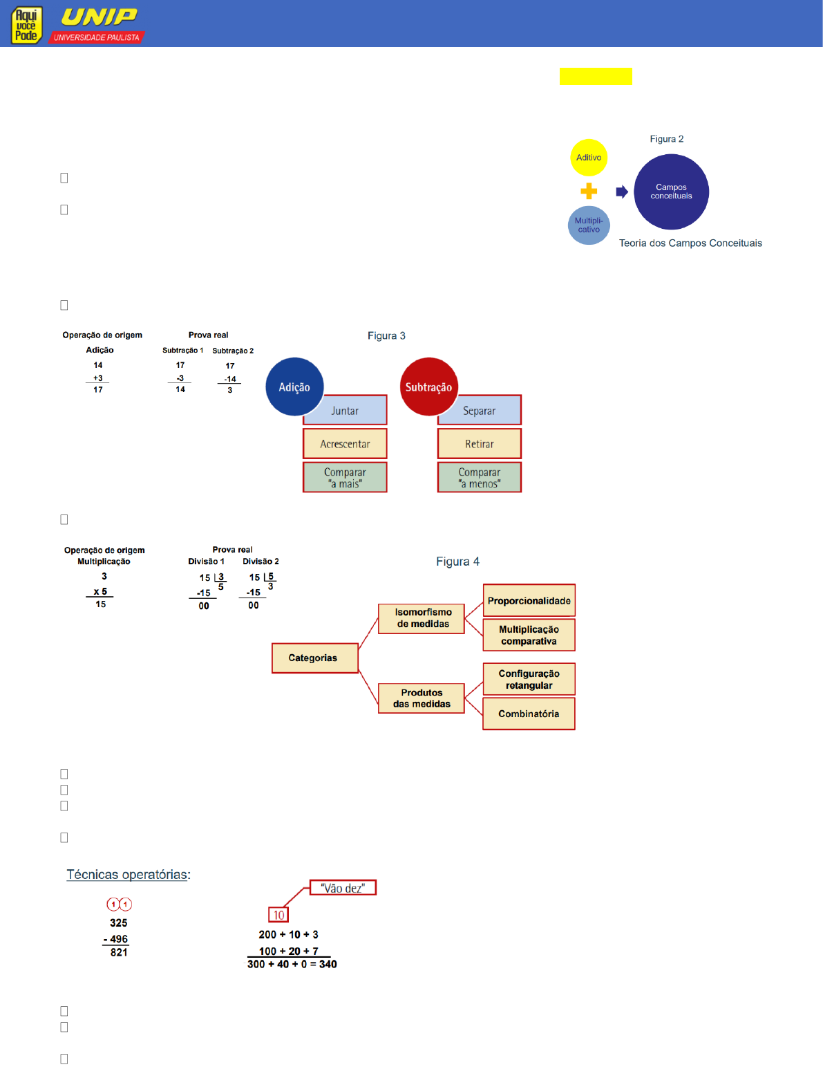 <p>1</p><p>CONTEÚDOS DE MATEMÁTICA PARA O ENSINO FUNDAMENTAL I – Unidade 2 - 08/10/2024</p><p>Professo(a): Dianiny Albuquerque Rodrigues</p><p>Pedagogia – Noite 1/ Sala 07 – 3º e 4º semestre</p><p>Operações com números naturais</p><p>Como você aprendeu as operações no período de escolarização?</p><p>A abordagem atual evidencia a necessidade de compreender a aplicação</p><p>prática social das operações fundamentais no dia a dia;</p><p>A Teoria dos Campos Conceituais, do francês Gerard Vergnaud (1996, 2009),</p><p>explica tal necessidade a partir da compreensão sobre os diferentes significados</p><p>e das relações envolvidas entre a adição, a subtração, a multiplicação e a</p><p>divisão.</p><p>Campo aditivo</p><p>As operações de adição e subtração fazem parte da mesma família, portanto, existem estreitas conexões entre</p><p>elas.</p><p>Campo multiplicativo</p><p>As operações de multiplicação e divisão fazem parte da mesma família, portanto, existem</p><p>estreitas conexões entre elas.</p><p>Estratégias e técnicas para calcular as adições</p><p>Cálculos:</p><p>Comutar: em vez de 2 + 7 = 9, calcular 7 + 2 = 9;</p><p>Decompor: ao resolver 5 + 8 = 13, calculamos 5 + 5 = 10 e, depois, acrescentamos ao resultado 3 (10 + 3 = 13);</p><p>Compensar: acrescentar e retirar. Por exemplo: para 3 + 5 = 8, calculamos 4 + 4 = 8. Neste caso, o resultado é o</p><p>mesmo porque retiramos 1 do 5 para acrescentá-lo ao 3;</p><p>Arredondar: na adição 9 + 8 = 17, como só falta 1 para o 9 ser 10, podemos adicionar 10 + 8 = 18 e retirar 1 do</p><p>resultado (18 – 1 = 17), obtendo o total de 17.</p><p>Estratégias e técnicas para calcular as subtrações</p><p>Cálculos:</p><p>Descontar: para encontrar o resultado de 11 – 3, desconta-se 3 de 11 e considera a quantidade que sobrou, 8;</p><p>Contar acrescentando (sobrecontagem): para encontrar o resultado da subtração 14 – 9, conta-se acrescentando,</p><p>de um em um, a partir do número menor, ou seja, do 9 até chegar ao 14, que dá 5;</p><p>Contar retirando: inversa à anterior. É realizada uma contagem decrescente, do maior para o menor, contando-</p><p>se, retirando de um em um, de 14 a 9, cujo resultado também dá 5.</p><p>2</p><p>Estratégias e técnicas para calcular as multiplicações</p><p>Comutar: 9 x 4 = 36, podemos encontrar o mesmo resultado em 4 x 9 = 36.</p><p>Dobrar: ao multiplicar por 2, por exemplo, 9 × 2, podemos calcular o dobro de 9, recorrendo ao fato básico da</p><p>adição, ou seja, 9 + 9 = 18.</p><p>Decompor: para 6 × 5, podemos calcular, primeiro, 5 × 5 = 25 e, depois, acrescentar mais 5 ao resultado, para</p><p>obter o produto 30.</p><p>Compensar: para multiplicar 5 × 8, calculamos quanto dá 10 × 4, ou seja, o dobro do primeiro e a metade do</p><p>segundo, chegando ao mesmo resultado.</p><p>Arredondar: 9 × 7, basta multiplicar 10 × 7 e subtrair 7 do resultado: 9 × 7 = (10 × 7) – 7 = 70 – 7 = 63.</p><p>Estratégias e técnicas para calcular as divisões</p><p>Cálculos:</p><p>Por adição: para calcular 26 : 4, realizamos 4 + 4 = 8, 8 + 4 = 12, 12 + 4 = 16, 16 + 4 = 20 e 20 + 4 = 24. Depois,</p><p>contamos a quantidade de vezes em que o 4 foi repetido. Assim, o quociente é 6, porque podemos adicioná-lo 6</p><p>vezes ao 4 para obter 24, ou seja, o número mais próximo a 26. Neste caso, o resto é 2, porque 26 - 24 = 2;</p><p>Por subtração: para calcular 26 : 4, subtraímos o 4 tantas vezes possíveis e, depois, contamos o número de vezes</p><p>em que foi subtraído. Por exemplo: 26 - 4 = 22, 22 - 4 = 18, 18 - 4 = 14, 14 - 4 = 10, 10 - 4 = 6 e 6 - 4 = 2. Assim, e</p><p>possível chegar ao quociente;</p><p>Por consulta à tabuada.</p><p>Interatividade</p><p>Leia o enunciado do problema a seguir:</p><p>Yasmin tem 10 anos, Léo tem o dobro dessa idade. Quantos anos Léo tem?</p><p>O problema faz parte de qual campo conceitual: aditivo ou multiplicativo?</p><p>Que categoria o problema se enquadra de acordo com a Teoria dos Campos Conceituais?</p><p>Assinale a alternativa que apresenta, respectivamente, as respostas a essas questões:</p><p>a) Aditivo. Comparação positiva.</p><p>b) Multiplicativo. Comparação.</p><p>c) Aditivo. Comparação negativa.</p><p>d) Multiplicativo. Proporcionalidade.</p><p>e) Multiplicativo. Combinação.</p><p>Usos e representações dos números racionais</p><p>Você já observou que, no contexto social, existem diferentes tipos de representações numéricas? Quais são elas?</p><p>Podemos identificar várias maneiras de comunicar as ideias relacionadas às quantidades, além daquelas,</p><p>diretamente, associadas aos números naturais, como, por exemplo:</p><p>12:00, 15:20 e 9:05, que representam as horas e frações de hora;</p><p>R$ 20,00, R$ 3.480,50 e R$ 756,00, números que expressam os valores associados ao sistema monetário</p><p>brasileiro;</p><p>1/2 e 1/4 kg, números fracionários que se referem às partes da unidade de medida de massa;</p><p>10%, 25% e 35%, que representam a porcentagem.</p><p>Todas essas representações numéricas são números racionais!</p><p>3</p><p>Os números racionais são aqueles que expressam as unidades e/ou partes de uma unidade. Podem ser escritos</p><p>em forma de frações, como: ½ e ¼, ou em forma decimal, como 3,10 e 4,45:</p><p>Fração: permite compreender as razões, escalas e porcentagens;</p><p>Decimal: presente nas informações da mídia e nos negócios.</p><p>Em muitas situações cotidianas, os números naturais não são suficientes para resolver todos os problemas que</p><p>surgem no dia a dia.</p><p>Assim, o trabalho com os números racionais, no 1º ao 5º ano, deve envolver os seus significados, a leitura, escrita,</p><p>comparação, ordenação, as representações fracionárias e decimais de uso frequente.</p><p>Significados dos números racionais</p><p>Relação parte-todo: por exemplo, comi dois oitavos de uma pizza, ou seja, 2/8 (dois pedaços</p><p>de oi