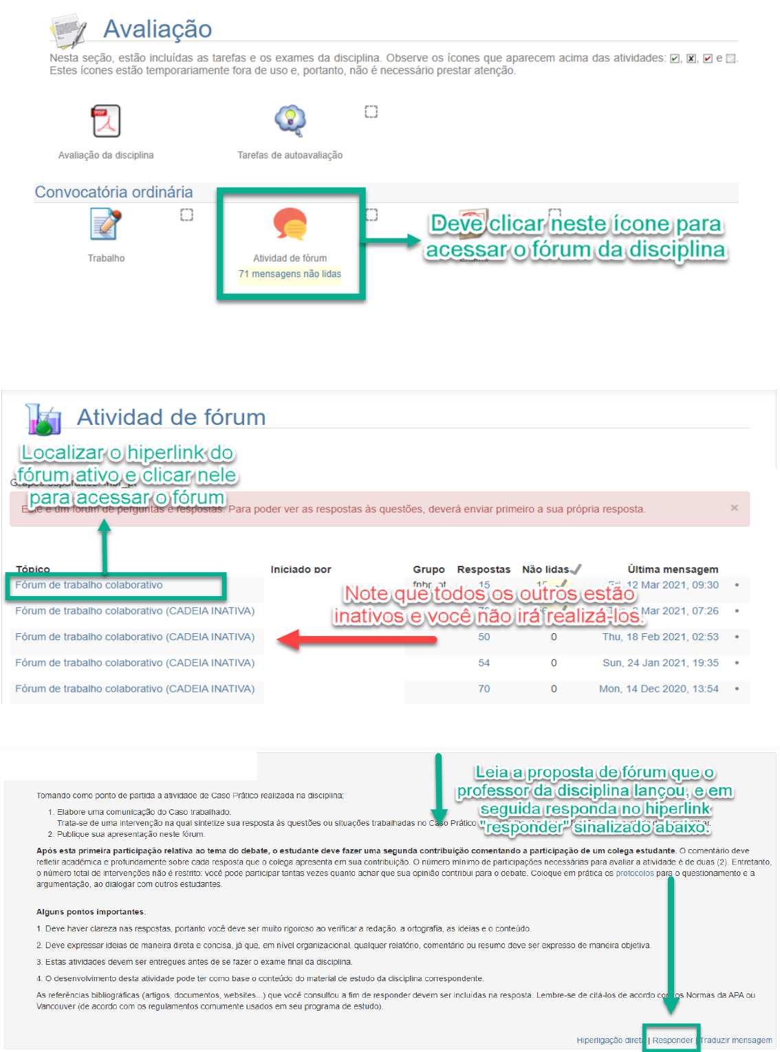 <p>Avaliação Nesta seção, estão incluídas as tarefas e os exames da disciplina. Observe os ícones que aparecem acima das atividades: e Estes estão temporariamente fora de uso e, portanto, não é necessário prestar atenção. Avaliação da disciplina Tarefas de autoavaliação Convocatória ordinária Deve clicar neste para Trabalho Atividad de fórum acessar fórum da disciplina 71 mensagens não lidas Atividad de fórum Localizar E um forum e Para poder ver as respostas às questões, deverá enviar primeiro a sua própria resposta. x Tópico Iniciado por Grupo Respostas Não lidas Última mensagem Fórum de trabalho colaborativo fnhr 15 15 12 Mar 2021, 09:30 Note quetodos outros estão Fórum de trabalho colaborativo (CADEIA INATIVA) inativos e você não irá frealizá-los Mar 07:26 Fórum de trabalho colaborativo (CADEIA INATIVA) 50 0 Thu, 18 Feb 02:53 Fórum de trabalho colaborativo (CADEIA INATIVA) 54 0 Sun, 24 Jan 2021. 19:35 Fórum de trabalho colaborativo (CADEIA INATIVA) 70 Mon. 14 Dec 2020. 13:54 Leia Tomando como ponto de partida a atividade de Caso Prático realizada na disciplina: professor da disciplina 1. Elabore uma comunicação do Caso seguida responda no hiperlink Trata-se de uma intervenção na qual sintetize sua resposta às questões ou situações trabalhadas no Caso Prático sinalizado 2. Publique sua apresentação neste Após esta primeira participação relativa ao tema do debate. o estudante deve fazer uma segunda contribuição comentando a participação de um colega estudante. o comentário deve refletir acadêmica e profundamente sobre cada resposta que o colega apresenta em sua número mínimo de participações necessárias para avaliar a atividade é de duas (2) Entretanto o número total de intervenções não é restrito: você pode participar tantas vezes quanto achar que sua opinião contribui para o Coloque em prática os protocolos para o questionamento e a ao dialogar com outros estudantes. Alguns pontos importantes 1. Deve haver clareza nas respostas, portanto você deve ser muito rigoroso ao verificar a redação, a ortografia, as ideias e o 2. Deve expressar ideias de maneira direta e já que, em nível organizacional, qualquer relatório, comentário ou resumo deve ser expresso de maneira 3. Estas atividades devem ser entregues antes de se fazer o exame final da disciplina. 4. desenvolvimento desta atividade pode ter como base o conteúdo do material de estudo da disciplina correspondente. As referências bibliográficas (artigos, documentos websites...) que você consultou a fim de responder devem ser incluídas na resposta. Lembre-se de citá-los de acordo los Normas da APA ou Vancouver (de acordo com os regulamentos comumente usados em seu programa de estudo). Hiperligação diret I Responder Traduzir mensagem</p><p>A sua resposta Assunto * Re: Fórum de trabalho colaborativo Mensagem B A := U Nesta caixa de diálogo você irá escrever sua resposta Lembre-se de utilizar as normativas da APA para citações e referências bibliográficas Subscrição da discussão ? Após escrever sua resposta deve no botão para Subscrição da discussão ? Grupo Submeter tópico Cancelar São de preenchimento obrigatório os campos assinalados com * Assunto (oculto) que aparecem ocultos inicialmente são as respostas de outros que abrirão Não pode visualizar esta mensagem, ub maximo de edição ainda não a discussão ainda não iniciou ou já para depois que sua Assunto (oculto) Autor (oculto) IMPORTANTE: Quando as resposta abrirem Não pode visualizar esta mensagem, de edição ainda não a discussão ainda não iniciou ou já terminou duas Assunto (oculto) Autor (oculto) Não pode visualizar es Realizados.estes edição ainda não a discussão ainda não iniciou ou já terminou.</p>