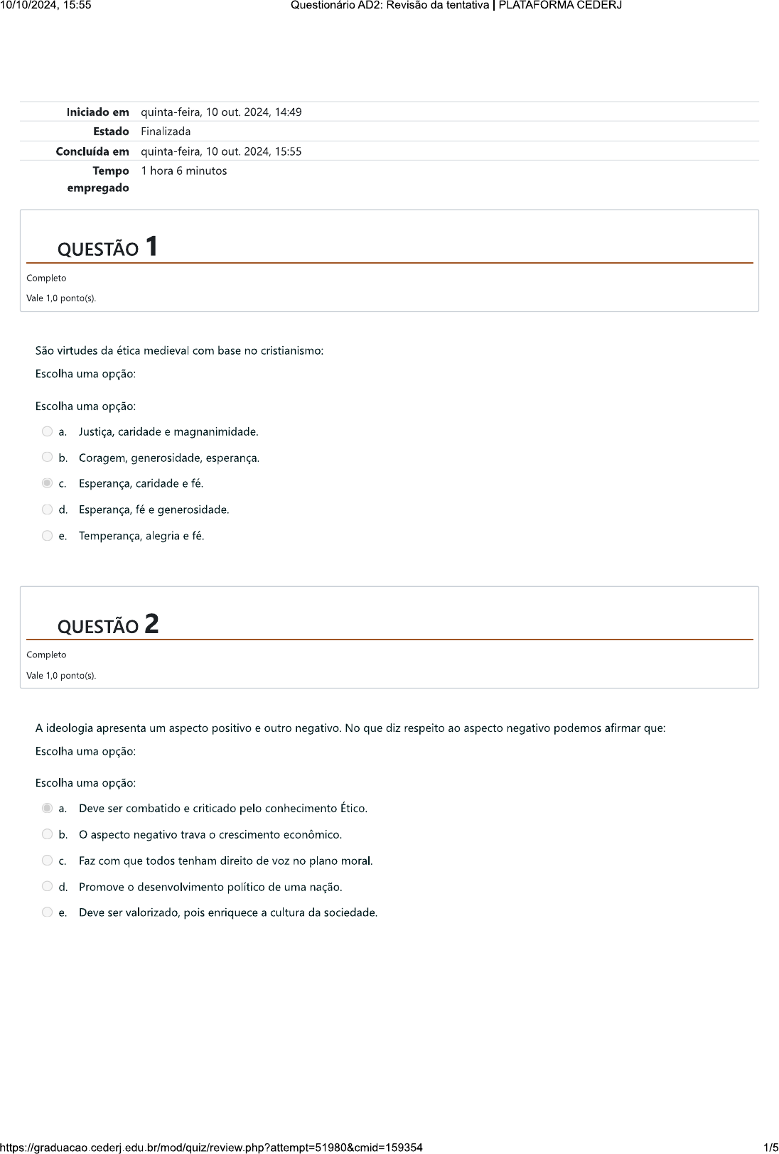 <p>10/10/2024, 15:55 Questionário AD2: Revisão da tentativa PLATAFORMA CEDERJ Iniciado em quinta-feira, 10 out. 2024, 14:49 Estado Finalizada Concluída em quinta-feira, 10 out. 2024, 15:55 Tempo 1 hora 6 minutos empregado QUESTÃO 1 Completo Vale 1,0 ponto(s). São virtudes da ética medieval com base no cristianismo: Escolha uma opção: Escolha uma opção: a. Justiça, caridade e magnanimidade. b. Coragem, generosidade, esperança. C. Esperança, caridade e fé. d. Esperança, fé e generosidade. e. Temperança, alegria e fé. QUESTÃO 2 Completo Vale 1,0 A ideologia apresenta um aspecto positivo e outro negativo. No que diz respeito ao aspecto negativo podemos afirmar que: Escolha uma opção: Escolha uma opção: a. Deve ser combatido e criticado pelo conhecimento Ético. b. aspecto negativo trava o crescimento econômico. C. Faz com que todos tenham direito de voz no plano moral. d. Promove o desenvolvimento político de uma nação. e. Deve ser valorizado, pois enriquece a cultura da sociedade. 1/5</p><p>10/10/2024, 15:55 Questionário AD2: Revisão da tentativa PLATAFORMA CEDERJ QUESTÃO 3 Completo Vale 1,0 Desde os anos 90, o Brasil tem conseguido diminuir a pobreza e, respectivamente as desigualdades sociais. Quais são os dois elementos que podem ser apontados como responsáveis por essa transformação? Escolha uma opção: Escolha uma opção: a. A alta dos juros que impossibilita que as empresas não concentrem renda e invistam e gerem empregos tal como a alta do dólar que permite b. A inflação que permite que o consumo exagerado diminua e o desemprego que também auxilia nesse processo de contenção do consumo supérfluo; C. Brasil não tem obtido sucesso em sua tentativa de diminuir a pobreza desde a década de 90. d. A crescente queda de emprego que abaixa a inflação e o acesso as tecnologias que nos conectam com o resto do mundo; e. crescimento constante da economia, permitindo acesso a emprego e renda para boa parte da população e o outro são as políticas de redistribuição de renda promovida por programas como o Programa Bolsa Família; QUESTÃO 4 Completo Vale 1,0 ponto(s). No século XX, as descobertas científicas passaram a ter aplicabilidade pratica nas indústrias e empresas, essa aliança viabilizou a instrumentalização da ciência visando a criação e o aprimorando de produtos que melhoram a vida das pessoas. Essa aplicabilidade da ciência no desenvolvimento de novas tecnologias é chamada de? Escolha uma alternativa: Escolha uma opção: a. Ideologia; b. Inovação; C. Cientificismo; d. Tecnociência; e. Método científico; 2/5</p><p>10/10/2024 15:55 Questionário AD2: Revisão da tentativa PLATAFORMA CEDERJ QUESTÃO 5 Completo Vale 1,0 ponto(s). A partir da década de 70, com a deterioração do Estado de Bem-Estar Social, a ideologia neoliberal passa a ser difundida nas Américas e na Europa. Quais são os eixos da Reforma de Estado proposta pela ideologia neoliberal? Escolha uma opção: Escolha uma opção: a. Crescimento dos gastos públicos e aumento de impostos; b. Diminuição de benefícios sociais e aumento da atividade estatal na economia; C. Aumento da participação estatal no mercado tal como aumento da seguridade social; d. Corte nos gastos, criação de novos impostos para as empresas e regulamentação máxima das atividades produtivas; e. Corte nos gastos públicos, contenção do crédito, diminuição de impostos sobre empresas, equilíbrio orçamentário público e desregulação do mercado; QUESTÃO 6 Completo Vale 1,0 ponto(s). Uma das características mais elementares da ciência, tal como a conhecemos, é a utilização de um método adequado para obtenção de resultados. Tendo em vista a definição de método como técnica ou meios utilizados para se fazer alguma coisa de maneira lógica e sistematizada e seu uso no decorrer da história, escolha uma opção: Escolha uma opção: a. método é algo próprio da ciência moderna, visto que ela foi pioneira ao criar mecanismos sistematizados de pesquisa e produção; b. método científico pode ser considerado superior aos métodos presentes em sociedades arcaicas, pois eles, diferente dos métodos das sociedades arcaicas, auxiliam na realização de tarefas necessárias a manutenção da vida e organização da comunidade; C. uso de métodos não é algo típico da modernidade, pois mesmo em sociedades arcaicas se observa o uso de técnicas sistematizadas para obtenção de resultados; d. No contexto científico, o uso de métodos é completamente dispensável; e. Em sociedades arcaicas não é possível observarmos o uso de métodos que conduzam a resultados satisfatórios; 3/5</p><p>10/10/2024, 15:55 Questionário AD2: Revisão da tentativa PLATAFORMA CEDERJ QUESTÃO 7 Completo Vale 1,0 ponto(s). É certo afirmarmos a respeito da Ética que: Escolha uma opção: Escolha uma opção: a. Institui valores morais que devem ser seguidos obrigatoriamente por todos. b. Controla o poder político. C. Visa promover exclusivamente o bem estar dos cidadãos. d. A Ética é uma filosofia moral, uma forma de conhecimento que busca compreender o sentido dos valores morais. e. Ela visa fazer com as religiões convivam em harmonia. QUESTÃO 8 Completo Vale 1,0 Para a moral medieval o Bem se identifica com: Escolha uma opção: Escolha uma opção: a. Fazer a vontade de Deus, assim as condutas devem seguir a vontade de Deus. b. Uma conduta orientada pela consciência individual. C. A felicidade conforme definida pelos filósofos gregos. d. A santidade do papa. e. A ideologia da sociedade cristã 4/5</p><p>10/10/2024, 15:55 Questionário AD2: Revisão da tentativa PLATAFORMA CEDERJ QUESTÃO 9 Completo Vale 1,0 ponto(s). A construção de máximas universais kantianas (o domínio do transcendental) sofreu críticas, sobretudo da escola de Frankfurt, pelo filósofo J. Habermas. Escolha uma opção: Escolha uma opção: a. Para Habermas a ideologia do capitalismo não representa prob