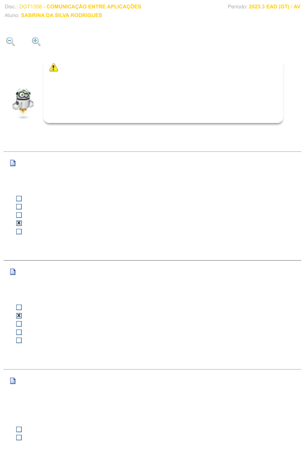 <p>18/09/2023, 14:26 Estácio: Alunos</p><p>https://simulado.estacio.br/alunos/ 1/4</p><p>Disc.: DGT1358 - COMUNICAÇÃO ENTRE APLICAÇÕES Período: 2023.3 EAD (GT) / AV</p><p>Aluno: SABRINA DA SILVA RODRIGUES Matrícula: 202303229186</p><p>Data: 18/09/2023 14:26:06 Turma: 9001</p><p>Lupa RETORNAR À AVALIAÇÃO</p><p>1a Questão (Ref.: 202308544510)</p><p>A camada internet da arquitetura TCP/IP tem definido o protocolo IP como principal protocolo, mas também</p><p>são utilizados protocolos que auxiliam no processo de encaminhamento dos dados para a máquina de</p><p>destino. Entre os protocolos auxiliares, podemos dizer que o:</p><p>DHCP é responsável por estabelecer as regras para garantir a entrega dos pacotes.</p><p>IGMP é responsável por definir o caminho da origem ao destino para cada pacote.</p><p>Todas as alternativas estão incorretas.</p><p>ARP é responsável por realizar a tradução do endereço lógico para o endereço físico.</p><p>ICMP é responsável por realizar a atribuição do endereço automática para cada estação.</p><p>2a Questão (Ref.: 202308544508)</p><p>Os dois modelos de camadas de rede conhecidos e discutidos são: modelo OSI e arquitetura TCP/IP</p><p>(internet). Os dois modelos diferem, principalmente, no número de camadas que cada um utiliza: o modelo</p><p>OSI possui sete camadas e o TCP/IP, quatro. Como a quantidade no TCP/IP é menor, a camada de:</p><p>Todas as alternativas estão incorretas.</p><p>Acesso à rede assume as funções das camadas de enlace e física do modelo OSI.</p><p>Aplicação assume a função apenas da camada de apresentação do modelo OSI.</p><p>Internet assume as funções das camadas enlace e física do modelo OSI.</p><p>Transporte assume as funções das camadas de sessão e apresentação do modelo OSI.</p><p>3a Questão (Ref.: 202311078568)</p><p>(PRODEB /2018 - Adaptada) Na camada de aplicação do modelo de referência TCP/IP, encontramos os</p><p>protocolos de nível mais alto. O modelo de referência TCP/IP não tem as camadas de sessão ou de</p><p>apresentação que existiam no modelo de referência OSI. Não foi percebida qualquer necessidade para elas,</p><p>pois as aplicações simplesmente incluem quaisquer funções de sessão e apresentação que forem</p><p>necessárias. Sobre protocolos da camada de aplicação, é correto afirmar que:</p><p>DNS, TCP e UDP são protocolos localizados na camada de aplicação do modelo de referência TCP/IP.</p><p>Na camada de aplicação do modelo TCP/IP, temos somente o protocolo Ethernet.</p><p>Atenção</p><p>1. Veja abaixo, todas as suas respostas gravadas no nosso banco de dados.</p><p>2. Caso você queira voltar à prova clique no botão "Retornar à Avaliação".</p><p>3. Não esqueça de finalizar a avaliação colocando o código verificador no campo no final</p><p>da página.</p><p>javascript:diminui();</p><p>javascript:diminui();</p><p>javascript:aumenta();</p><p>javascript:aumenta();</p><p>javascript:alert('C%C3%B3digo da quest%C3%A3o: 5292406\n\nStatus da quest%C3%A3o: Liberada para Uso.');</p><p>javascript:alert('C%C3%B3digo da quest%C3%A3o: 5292406\n\nStatus da quest%C3%A3o: Liberada para Uso.');</p><p>javascript:alert('C%C3%B3digo da quest%C3%A3o: 5292404\n\nStatus da quest%C3%A3o: Liberada para Uso.');</p><p>javascript:alert('C%C3%B3digo da quest%C3%A3o: 5292404\n\nStatus da quest%C3%A3o: Liberada para Uso.');</p><p>javascript:alert('C%C3%B3digo da quest%C3%A3o: 7826464\n\nStatus da quest%C3%A3o: Liberada para Uso.');</p><p>javascript:alert('C%C3%B3digo da quest%C3%A3o: 7826464\n\nStatus da quest%C3%A3o: Liberada para Uso.');</p><p>javascript:ir_finalizar();</p><p>Srodrigues</p><p>Realce</p><p>18/09/2023, 14:26 Estácio: Alunos</p><p>https://simulado.estacio.br/alunos/ 2/4</p><p>HTTP, SMTP, RTP e DNS são exemplos de protocolos localizados na camada de aplicação do modelo de</p><p>referência TCP/IP.</p><p>ICMP é um protocolo localizado na camada de aplicação do modelo de referência TCP/IP.</p><p>Somente o protocolo IP está localizado na camada de aplicação do modelo de referência TCP/IP.</p><p>4a Questão (Ref.: 202311078570)</p><p>(UFPE/2017 - Adaptada) Arquiteturas em redes são essenciais para permitir a comunicação entre diferentes</p><p>dispositivos e sistemas em uma rede. Elas definem uma estrutura para organizar os componentes e</p><p>protocolos de rede em camadas lógicas, a fim de facilitar o desenvolvimento, implementação e manutenção</p><p>de redes complexas. A respeito da arquitetura cliente-servidor, é correto afirmar que:</p><p>I. É baseada em interações requisição-resposta.</p><p>II. Garante tolerância a falhas.</p><p>III. O cliente é onde tipicamente se implementa a interface de usuário.</p><p>IV. É um modelo de arquitetura centralizada.</p><p>Marque a alternativa correta</p><p>I, III e IV, apenas.</p><p>II, III e IV, apenas.</p><p>I, apenas.</p><p>II e III, apenas.</p><p>IV, apenas.</p><p>5a Questão (Ref.: 202311070269)</p><p>(COSEAC/2021 - Adaptada) A camada de rede é responsável pela transferência de pacotes entre redes</p><p>diferentes, permitindo a comunicação entre dispositivos de redes distintas. Na arquitetura TCP/IP a camada</p><p>"interface de rede" corresponde a(s) seguinte(s) camada(s) no modelo OSI:</p><p>rede e enlace.</p><p>enlace e física.</p><p>rede.</p><p>transporte e rede.</p><p>sessão e transporte.</p><p>6a Questão (Ref.: 202311063886)</p><p>(CESGRANRIO/2016 - Adaptada) Os protocolos são regras e padrões estabelecidos para comunicação</p><p>entre dispositivos e sistemas. RIP e OSPF são, respectivamente, protocolos baseados em</p><p>Estado de Enlace (Link State) e Estado de Enlace (Link State)</p><p>Vetor de Distâncias (Distance Vector) e Estado de Enlace (Link State)</p><p>Vetor de Distâncias (Distance Vector) e Vetor de Distâncias (Distance Vector)</p><p>Estado de Enlace (Link State) e Vetor de Caminhos (Path Vector)</p><p>Estado de Enlace (Link State) e Vetor de Dist