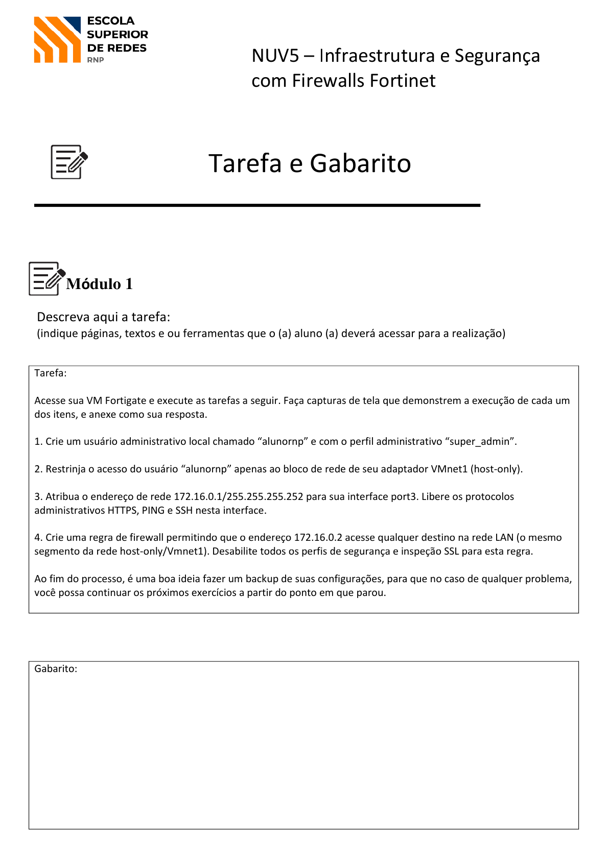 <p>NUV5 – Infraestrutura e Segurança</p><p>com Firewalls Fortinet</p><p>Tarefa e Gabarito</p><p>Módulo 1</p><p>Descreva aqui a tarefa:</p><p>(indique páginas, textos e ou ferramentas que o (a) aluno (a) deverá acessar para a realização)</p><p>Tarefa:</p><p>Acesse sua VM Fortigate e execute as tarefas a seguir. Faça capturas de tela que demonstrem a execução de cada um</p><p>dos itens, e anexe como sua resposta.</p><p>1. Crie um usuário administrativo local chamado “alunornp” e com o perfil administrativo “super_admin”.</p><p>2. Restrinja o acesso do usuário “alunornp” apenas ao bloco de rede de seu adaptador VMnet1 (host-only).</p><p>3. Atribua o endereço de rede 172.16.0.1/255.255.255.252 para sua interface port3. Libere os protocolos</p><p>administrativos HTTPS, PING e SSH nesta interface.</p><p>4. Crie uma regra de firewall permitindo que o endereço 172.16.0.2 acesse qualquer destino na rede LAN (o mesmo</p><p>segmento da rede host-only/Vmnet1). Desabilite todos os perfis de segurança e inspeção SSL para esta regra.</p><p>Ao fim do processo, é uma boa ideia fazer um backup de suas configurações, para que no caso de qualquer problema,</p><p>você possa continuar os próximos exercícios a partir do ponto em que parou.</p><p>Gabarito:</p><p>NUV5 – Infraestrutura e Segurança</p><p>com Firewalls Fortinet</p><p>Item 1:</p><p>Item 2:</p><p>Item 3:</p><p>NUV5 – Infraestrutura e Segurança</p><p>com Firewalls Fortinet</p><p>NUV5 – Infraestrutura e Segurança</p><p>com Firewalls Fortinet</p><p>Item 4:</p><p>NUV5 – Infraestrutura e Segurança</p><p>com Firewalls Fortinet</p><p>NUV5 – Infraestrutura e Segurança</p><p>com Firewalls Fortinet</p><p>Fazendo backup:</p>
