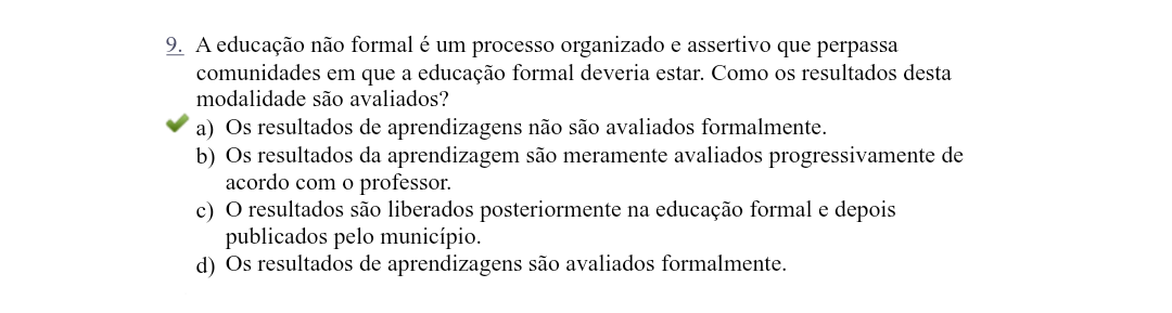 <p>9. A educação não formal é um processo organizado e assertivo que perpassa comunidades em que a educação formal deveria estar. Como os resultados desta modalidade são avaliados? a) Os resultados de aprendizagens não são avaliados formalmente. b) Os resultados da aprendizagem são meramente avaliados progressivamente de acordo com o professor. c) O resultados são liberados posteriormente na educação formal e depois publicados pelo município. d) Os resultados de aprendizagens são avaliados formalmente.</p>