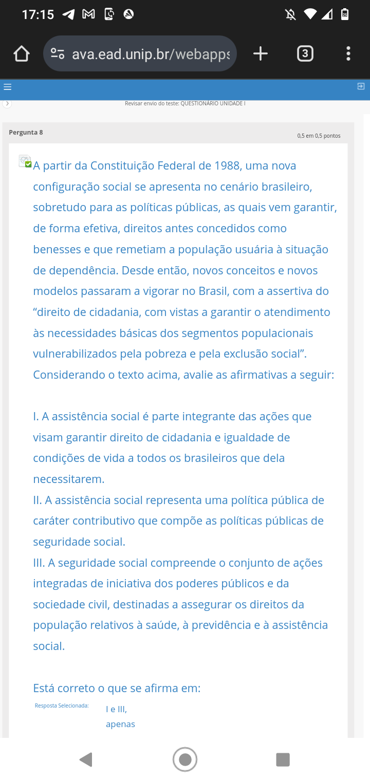 <p>17:15 M 25 ava.ead.unip.br/webapps + 3 = > Revisar envio do UNIDADE Pergunta 8 em pontos A partir da Constituição Federal de 1988, uma nova configuração social se apresenta no cenário brasileiro, sobretudo para as políticas públicas, as quais vem garantir, de forma efetiva, direitos antes concedidos como benesses e que remetiam a população usuária à situação de dependência. Desde então, novos conceitos e novos modelos passaram a vigorar no Brasil, com a assertiva do "direito de cidadania, com vistas a garantir o atendimento às necessidades básicas dos segmentos populacionais vulnerabilizados pela pobreza e pela exclusão social". Considerando o texto acima, avalie as afirmativas a seguir: I. A assistência social é parte integrante das ações que visam garantir direito de cidadania e igualdade de condições de vida a todos os brasileiros que dela II. A assistência social representa uma política pública de caráter contributivo que compõe as políticas públicas de seguridade social. III. A seguridade social compreende conjunto de ações integradas de iniciativa dos poderes públicos e da sociedade civil, destinadas a assegurar os direitos da população relativos à saúde, à previdência e à assistência social. Está correto o que se afirma em: Resposta Selecionada: III, apenas</p>