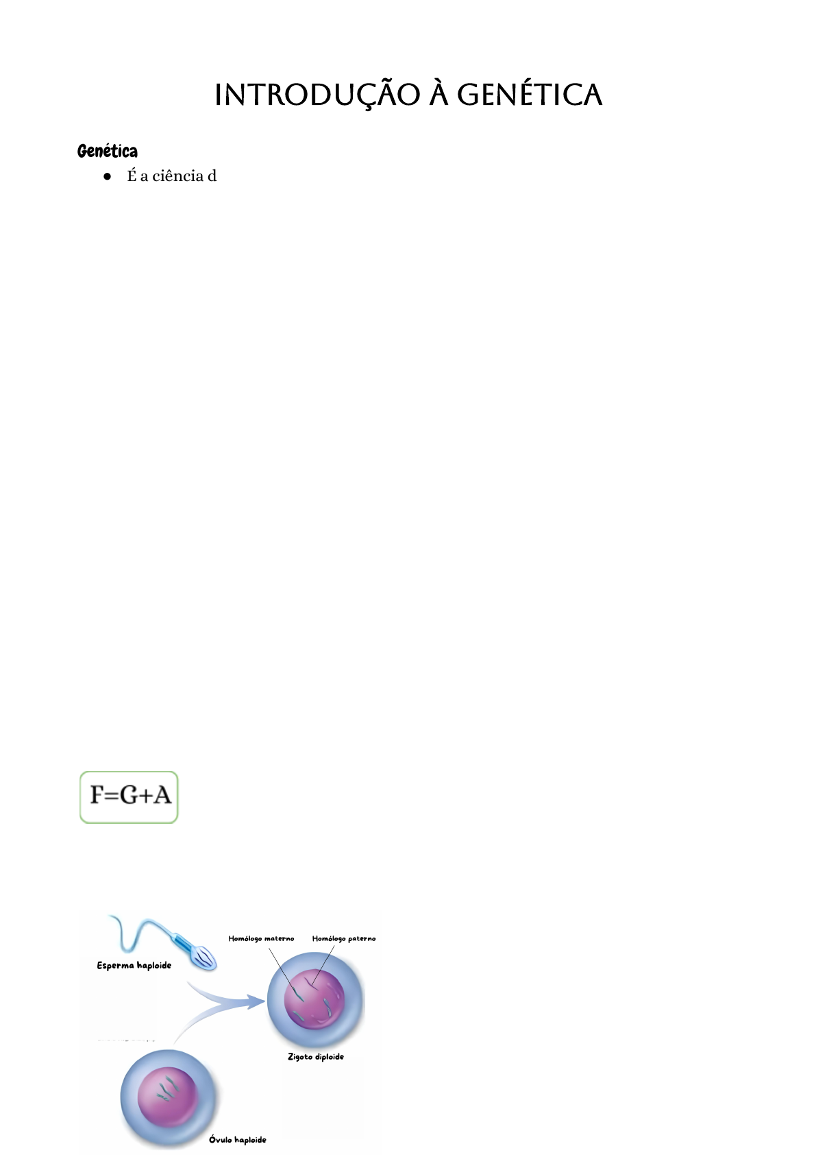 <p>INTRODUÇÃO À GENÉTiCA</p><p>Genética</p><p>● É a ciência da hereditariedade e das variações dos organismos que dá enfoque</p><p>uni�cador para compreensão de uma grande variedade de processos na vida de um</p><p>organismo em todos os estágios, não apenas durante o desenvolvimento de um</p><p>adulto a partir do zigoto, mas envolve também a diversidade, replicação, mutação e</p><p>tradução das informações contidas nos genes, sendo peça fundamental para a</p><p>evolução.</p><p>GENE</p><p>● unidade fundamental da hereditariedade;</p><p>● sequência especí�ca de ácidos nucleicos;</p><p>● codi�cam proteínas;</p><p>● expressam características- OCA2 (responsável pela despigmentação dos olhos em</p><p>albinos)</p><p>● de 20 a 25 mil genes nos 46 cromossomos humanos.</p><p>GENÓTIPO</p><p>constituição genética do indivíduo- herdado do pai e da mãe</p><p>representado por letras (A,a, X,x, Y,y)</p><p>FENÓTIPO</p><p>características que se manifestam- morfológicas, �siológicas ou complementares;</p><p>determinado pelo genótipo;</p><p>ex.: cor dos olhos, cor da pele, características físicas…</p><p>CROMOSSOMOS HOMÓLOGOS</p><p>mesma quantidade entre organismos da</p><p>mesma espécie;</p><p>reprodução sexuada e assexuada;</p><p>apresentam genes provenientes de seus</p><p>progenitores</p><p>● homologo paterno (n)</p><p>● homologo materno (n)</p><p>● zigoto (2n)</p><p>número complementar na formação dos organismos;</p><p>GENES ALELOS</p><p>mesma localização nos cromossomos homólogos</p><p>dominância</p><p>● expressa tanto</p><p>em condições</p><p>homozigóticas e</p><p>heterozigóticas</p><p>recessividade</p><p>● não se expressam em condições heterozigotas;</p><p>homozigotos</p><p>● dois alelos iguais de um gene</p><p>heterozigoto</p><p>● dois alelos diferentes de um gene</p><p>CRUZAMENTO</p><p>monoibridismo: cruzamento resultante</p><p>da comparação de um caráter</p><p>● AA x aa</p><p>diibridismo: cruzamento resultante da</p><p>comparação de dois caracteres</p><p>simultaneamente</p><p>● AABB x aabb</p><p>triibridismo: cruzamento resultante da</p><p>comparação de três caracteres</p><p>simultaneamente</p><p>● AABBCC x aabbcc</p><p>Genética Mendeliana</p><p>Genética clássica</p><p>Gregor Johann Mendel (1822-1884)</p><p>● botânico e meteorologista</p><p>transmissão das características hereditárias</p><p>material de estudo: a ervilha- de-cheiro (Pisum Satiuum)</p><p>Características estudadas</p><p>Conclusões de Mendel</p><p>a herança parecia seguir regras de�nitivas e relativamente simples;</p><p>quando dois tipos diferentes de plantas eram cruzadas, não havia mistura dos estados das</p><p>características individuais;</p><p>os fatores da hereditariedade responsáveis pelas condições de dinâmica e recessividade</p><p>não erammodi�cadas quando ocorriam junto ao híbrido;</p><p>a promoção fenotípica na descendência seria de 3:1, enquanto que genotipicamente,</p><p>usando a nomenclatura atual, seria 1;2;1</p><p>quando um cruzamento envolvia dois pares de unidades hereditárias contrastantes, tal</p><p>como AaBb x AaBb, cada pa5r se comportam independentemente;</p><p>Segregação em Árvores Genealógicas</p><p>grá�cos utilizados em genética para expor a genealogia de um indivíduo ou de uma</p><p>família;</p><p>através de símbolos e sinais convencionais são caracterizados todos os integrantes da</p><p>linhagem;</p><p>identi�cação de homozigotos recessivos e dominantes, além dos heterozigotos;</p><p>possibilidade de identi�car os genótipos dos outros indivíduos;</p><p>Heredograma</p><p>Sistema XY</p><p>os machos possuem dois lotes de</p><p>cromossomos autossomos e mais um par</p><p>de cromossomos sexuais XY;</p><p>● heterogamético</p><p>as fêmeas possuem os mesmos dois lotes</p><p>de autossomos e um par de</p><p>cromossomos sexuais XX;</p><p>● homogaméticos</p><p>os nomes X e Y, empregados na designação desses cromossomos, foram encolhidos</p><p>arbitramento</p><p>Conceitos</p><p>hereditária: porque é herdado, ou seja, se transmite;</p><p>autossômica: quando ocorre em um cromossomo que não é responsável pela</p><p>determinação do sexo;</p><p>recessiva: é necessário ter herdado uma cópia do gene defeituoso de cada um dos pais</p><p>dominante: sempre terá alguém que expresse a condição em cada uma das gerações</p><p>Autossômica recessiva</p><p>expressam-se apenas em homozigotos;</p><p>o risco de ocorrência para cada irmão do probando</p><p>é de 1 em 4</p><p>os pais do indivíduo afetado em alguns casos são</p><p>consanguíneos</p><p>ALBINISMO</p><p>determinado por gene</p><p>autossômico recessivo;</p><p>consanguinidade entre os pais dos</p><p>afetados em 20 a 30%;</p><p>hipopigmentação da pele, cabelos</p><p>e olhos;</p><p>ocorrem nistagmo, fotofobia e</p><p>redução da acuidade visual em torno de 10%;</p><p>Autossômica dominante</p><p>expressa da mesmamaneira em homozigotos e</p><p>heterozigotos</p><p>toda pessoa afetada possui um genitor afetado,</p><p>que possui um genitor afetado e assim por</p><p>diante;</p><p>o fenótipo aparece em todas as gerações</p><p>qualquer �lho de genitor afetado tem risco de 50% de herdar o fenótipo;</p><p>ambos os sexos têm amesma probabilidade de serem afetados</p><p>RETINOBLASTOMA</p><p>Holândrica</p><p>o cromossomo Y possui alguns que lhe são</p><p>exclusivos, que não é homologada ao X;</p><p>conhecidos como genes holândricos,</p><p>caracterizam a chamada herança restrita ao</p><p>sexo;</p><p>exclusivo para indivíduos do sexo masculio</p><p>HIPERTRICOSE AURICULAR</p><p>condição que se caracteriza pelo aparecimento de pelos longos e abundantes no bordo das</p><p>orelhas;</p><p>sempre é passado de pai para �lho, independentemente de ser herança dominante ou</p><p>recessiva</p><p>X recessivo</p><p>aquela em que os genes estão localizados</p><p>em uma região não homóloga do</