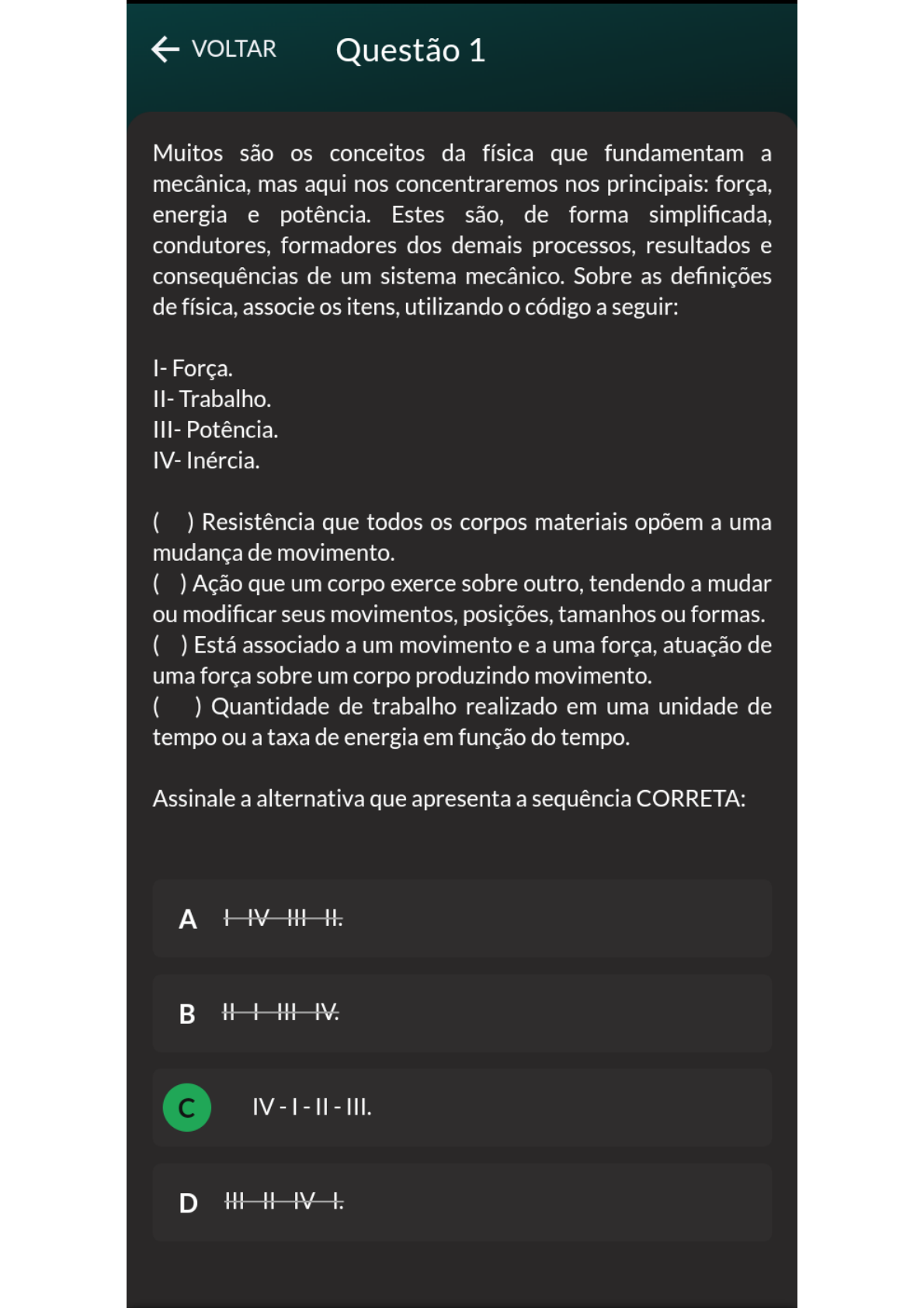 <p>VOLTAR Questão 1 Muitos são os conceitos da física que fundamentam a mecânica, mas aqui nos concentraremos nos principais: força, energia e potência. Estes são, de forma simplificada, condutores, formadores dos demais processos, resultados e consequências de um sistema mecânico. Sobre as definições de física, associe os itens, utilizando código a seguir: Força. II- Trabalho. III- Potência. IV- Inércia. ( ) Resistência que todos os corpos materiais opõem a uma mudança de movimento. ( ) Ação que um corpo exerce sobre outro, tendendo a mudar ou modificar seus movimentos, tamanhos ou formas. ( ) Está associado a um movimento e a uma força, atuação de uma força sobre um corpo produzindo movimento. ( ) Quantidade de trabalho realizado em uma unidade de tempo ou a taxa de energia em função do tempo. Assinale a alternativa que apresenta a sequência CORRETA: A IV III II. B H III IV. C D IV</p><p>VOLTAR Questão 2 [Laboratório Virtual - Agricultura de Precisão - Análise de Informações do Computador de Bordo da Colheitadeira] O funcionamento de uma colhedora de cereais é complexo e dinâmico, pois todos os seus mecanismos constituintes operam em sintonia, com o objetivo de entregar um grão limpo, inteiro e, às vezes, ensacado. Em alguns desses mecanismos, podem ser instalados sensores para desempenhar importantes funções no monitoramento da colheita. Assinale a alternativa correta em relação à função da colheita mecanizado dos grãos: Manter a qualidade dos alimentos produzidos no A campo. Aumentar a produção des alimentos produzidos B Aumentar a qualidade alimentos produzidos no Manter a produtividade des alimentos produzidos D Baixar a produtividade des alimentos produzidos no E campo. Revisar Conteúdo do Livro</p><p>VOLTAR Questão 3 É importante planejar tipo de secagem aliado ao tipo de grão produzido, visto que cada grão possui diferentes características químicas e físicas, que influenciam no desempenho de cada tipo de secador. Dessa forma, assinale a alternativa correta com relação às partes que compõem um secador: Funil de carga, torre de secagem, câmara de A decantação, sistema de descarga, balança, ventiladores. Funil de carga, torre de secagem, balança, sistema de B descarga, registros de ar, ventiladores. Funil de carga, torre de secagem, câmara de C decantação, sistema de descarga, registros de ar, ventiladores. Funil de carga, balança, câmara de decantação, D sistema de descarga, registros de ar, aspersores.</p><p>VOLTAR Questão 4 Os métodos de controle e tratamento pós-colheita variam de acordo com a espécie a ser tratada e também podem ser divididos entre físicos, culturais, biológicos e químicos. Sobre as vantagens dos métodos de controle e tratamento biológico, assinale a alternativa CORRETA: É mais antigo método físico, utilizado A principalmente no controle de doenças em produtos frescos. Imersão ou pulverização de agentes biológicos, B normalmente elevando a temperatura a 50 a 55 °C devido à fermentação. Sensibilidade antagonistas às condições ambientais, eficácia alta de biocontrole em situações C em que patógenos estão ou alta pressão de doença. Seguro para homem, animais e ambiente D (antagonistas biodegradáveis).</p><p>VOLTAR Questão 5 Os componentes e equipamentos eletrônicos utilizados para gerar O mapa de produtividade podem variar em posição, formato e tecnologia, de acordo com os fabricantes da colhedora. Para exemplificar, em algumas máquinas é necessária a instalação de um sensor de fluxo no elevador de grãos limpos, bem como O uso de um sensor específico para medir a umidade do grão. Já a posição do ponto de localização na área é obtida por meio de um receptor de GPS, O qual determinará a latitude e a longitude da máquina no momento da leitura. Com base na finalidade dos mapas, avalie as asserções a seguir e a relação proposta entre elas: Todas as informações geradas são enviadas a um dispositivo de memória para a posterior geração das análises de limitações e erros. Após, são finalmente enviadas para a elaboração dos mapas. PORQUE II- Levar em consideração os mapas nas operações agrícolas pode reduzir custos com fertilizantes e corretivos, proporcionando a sua aplicação localizada, reduzindo O custo energético e contribuindo para a sustentabilidade da produção. Assinale a alternativa CORRETA: A le proposições falsas. A asserção I é uma proposição verdadeira, e a B uma proposição falsa. A I é uma proposição falsa, e a é uma C proposição verdadeira.</p><p>VOLTAR Questão 5 I- Todas as informações geradas são enviadas a um dispositivo de memória para a posterior geração das análises de limitações e erros. Após, são finalmente enviadas para a elaboração dos mapas. PORQUE II- Levar em consideração os mapas nas operações agrícolas pode reduzir custos com fertilizantes e corretivos, proporcionando a sua aplicação localizada, reduzindo custo energético e contribuindo para a sustentabilidade da produção. Assinale a alternativa CORRETA: A As le são proposições falsas. A asserção uma proposição verdadeira, e a B uma proposição falsa. A asserção I é uma proposição falsa, e a é uma proposição verdadeira. As asserções I e II são proposições verdadeiras, e D a II é uma justificativa da I.</p><p>VOLTAR Questão 6 [Laboratório Virtual - Manutenção de Máquinas Agrícolas Antes das As máquinas agrícolas são consideradas aliadas de quem trabalha no campo, e a manutenção é garantia de longevidade e lucro. Investir em tratores e implementos, como colheitadeiras, semeadoras ou pulverizadores requer um alto valor, assim é preciso cuidar muito bem para que os problemas mecânicos não atrapalhem o seu desempenho e operação. Assinale a alternativa correta em relação à manutenção das máquinas agrícolas: A Diminui a vida útil da máquina. Prejudica da máquina. 