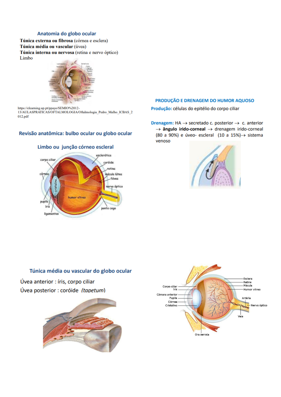 <p>Semiologia do sistema ocular</p><p>A córnea esta sempre exposta por isso é tão fácil</p><p>ter lesões nesta estrutura. Muito mais normal em</p><p>cachorros que possuem o olho mais exposto. Uma</p><p>formação benigna deve ser tirada, se atrapalhar o</p><p>animal mesmo não sendo maligno.</p><p>Íris é o que da cor ao olho. Corpo ciliar fica mais</p><p>profundo e não dá pra ver externamente. Íris</p><p>dilatada � midríase; pupila diminuída � miose;</p><p>Ela é média porque ela está entre a túnica externa</p><p>e a interna.</p><p>No fundo de olho tem a coroide e a retina.</p><p>Entre a córnea e a íris tem a lente (cristalino),</p><p>entre a córnea e o cristalino tem uma câmara que</p><p>possui o humor aquoso (líquido).</p><p>Na câmara posterior também tem humor aquoso e</p><p>o humor vítreo está preenchendo a câmara</p><p>posterior e anterior, o humor vítreo é mais</p><p>gelatinoso. Se deixar perfurar é muito normal</p><p>cegar o cachorro. Se lesionar o cristalino e ele</p><p>ficar opaco, resulta em catarata. Pode acontecer</p><p>um glaucoma. O humor aquoso mantém a pressão</p><p>intraocular.</p><p>Ceratite � inflamação da córnea;</p><p>Focinho crânio-achatado é muito mais predisposto</p><p>a ter problemas oculares e respiratórios.</p><p>Exoftalmia (os globos oculares projetam-se para</p><p>fora da órbita), enoftalmia (deslocamento do</p><p>globo ocular em direção ao interior da cavidade</p><p>ocular) e buftalmia (aumento do tamanho do</p><p>bulbo ocular).</p><p>Prestar atenção quando o olho do cachorro está</p><p>branco, pode ser diabetes (com abdômen</p><p>distendido e bebendo muita água;</p><p>hiperadrenocorticismo), se ter gordura na córnea</p><p>melhor fazer exame de sangue (hipotiroidismo)</p><p>Blefarite � inflamação das bordas das pálpebras</p><p>Excesso de lacrimejamento pode ser uma</p><p>pigmentação no pelo ao redor do olho.</p><p>saber a pressão</p><p>ocular, a densidade</p><p>quanta lagrima ele produz por minuto</p><p>Se corou o estroma é porque perdeu a camada de</p><p>epitélio.</p><p>se perder toda camada de estroma e chegar no</p><p>endotélio pode ter projeção e exteriorização de íris</p><p>e humor aquoso</p>