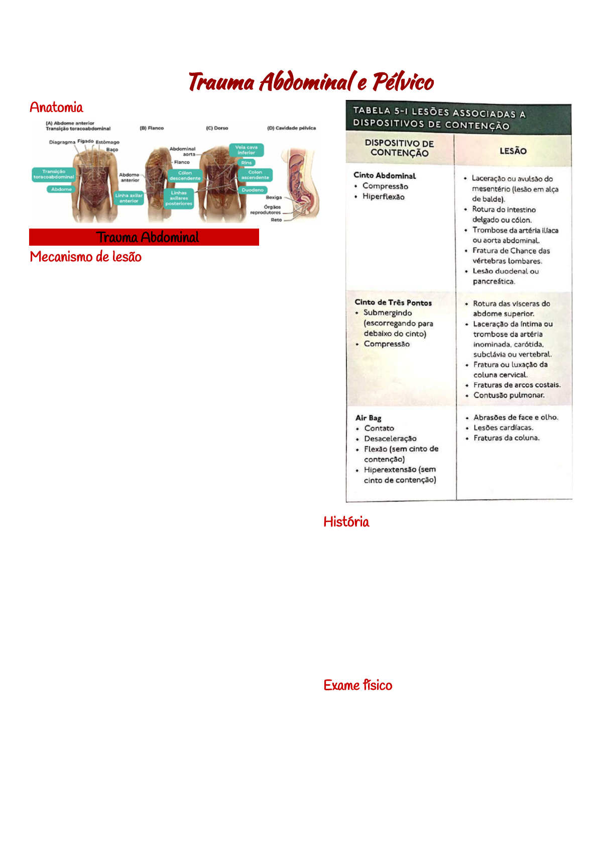 <p>M Clara Weber 8 Período</p><p>MEDFASA</p><p>Trauma Abdominal e Pélvico</p><p>Anatomia</p><p>Trauma Abdominal .</p><p>Mecanismo de lesão</p><p>● Contuso</p><p>- Golpe direto: lesão por compressão e</p><p>esmagamento</p><p>- Cisalhamento; mecanismo de contenção</p><p>usado de forma inadequada</p><p>- Desaceleração: diferença de movimento entre</p><p>partes fixas e móveis</p><p>- Órgãos mais lesados: Baço (40-55%); Fígado</p><p>(35-45%); Intestino Delgado(5 a 10%)</p><p>- 15% - hematoma retroperitoneal</p><p>● Penetrante</p><p>- Baixa energia - PAB: lesões por laceração</p><p>- Alta energia - PAF: transfere muita energia</p><p>cinética, causando danos aos tecidos no</p><p>trajeto do projétil (efeito de cavitação e</p><p>possível fragmentação do projétil).</p><p>● Explosão</p><p>- Penetrante por fragmentos</p><p>- Ferimentos contundentes</p><p>- Lesões por alta pressão (lesão pulmonar,</p><p>intestinal, membrana timpânica)</p><p>História</p><p>● Tipo de veículo, tipo de colisão, invasão no</p><p>compartimento de passageiros, tipo de</p><p>contenção, posição do paciente no veículo,</p><p>status de outros passageiros</p><p>● Em casos de queda, determinar a altura</p><p>● Tipo de arma, distância do agressor, número</p><p>de facadas/tiros, sangramento na cena</p><p>● Distância do paciente da explosão</p><p>Exame físico</p><p>● Inspeção, ausculta, percussão, palpação</p><p>● Pelve: hipotensão inexplicada pode ser</p><p>indício de fratura pélvica</p><p>● Evidência de lesão da uretra, diferença no</p><p>M Clara Weber 8 Período</p><p>MEDFASA</p><p>tamanho dos membros inferiores,</p><p>deformidade rotacional são indícios de</p><p>fratura pélvica</p><p>● Raio-x AP</p><p>● Uretra, períneo, reto, vagina, glúteos</p><p>● Sangue no meato uretral,</p><p>equimose/hematoma no escroto e perínco</p><p>● Suspeita de lesão de uretra: Não sondar.</p><p>- A palpação da próstata não é um sinal</p><p>confiável de lesão uretral.</p><p>Medidas auxiliares</p><p>● SNG e SVD</p><p>- Descompressão gástrica</p><p>- Reduz a incidência de aspiração</p><p>- Presença de sangue pode indicar lesão no</p><p>TGI superior</p><p>- Suspeita de fratura de base de cránio, fratura</p><p>facial severa - Orogástrica</p><p>- SVD: evita retenção, avalia presença de</p><p>hematúria, monitorar a perfusão tecidual</p><p>- Ausência de hematúria não exclui lesão do</p><p>trato genitourinário.</p><p>● Raio-X de tórax/Abdome/Pelve</p><p>- Avaliar a presença de hemotórax,</p><p>pneumotórax</p><p>- Determinar a presença de</p><p>pneumoperitônio</p><p>- Com marcadores radiopacos nos orifícios</p><p>prováveis de entrada e saída</p><p>- Ajuda a determinar o possível trajeto do</p><p>projétil</p><p>● FAST (Focused Assesment with Sonography</p><p>for Trauma)</p><p>- Método rápido;</p><p>- Estudo confiável para detectar líquido</p><p>intraperitoneal;</p><p>- Não é bom para identificar sangue (esse</p><p>tipo de líquido);</p><p>- Pode ser repetido - facilidade de ser feito</p><p>no leito</p><p>- Detecção de tamponamento pericárdico</p><p>- Examina quatro regiões: saco pericárdico,</p><p>espaço hepatorrenal, espaço</p><p>M Clara Weber 8 Período</p><p>MEDFASA</p><p>esplenorrenal, pelve</p><p>● Lavado peritoneal diagnóstico (LPD)</p><p>- Requer descompressão gástrica e urinária</p><p>- Realizado em pacientes</p><p>hemodinamicamente instáveis ou em</p><p>pacientes estáveis quando não há TC ou</p><p>FAST disponível</p><p>- Aspiração de conteúdo gástrico, fibras</p><p>vegetais, bile ou sangue em pacientes</p><p>hemodinamicamente instáveis indica</p><p>laparotomia.</p><p>- Cateterização peritoneal (Técnica de</p><p>Seldinger); - Aspirado inicial (é a primeira</p><p>etapa do LPD);</p><p>- No aspirado inicial, se puxar na agulha (de</p><p>grosso calibre/ hemodiálise em região</p><p>infraumbilical abaixo da bifurcação aórtica)</p><p>e se aspirar:</p><p>> ou = 10 ml de sangue, o teste é positivo;</p><p>Conteúdo GI, teste positivo.</p><p>- Se não vier nada, é normal.</p><p>- - Pós-lavado: introduzir soro aquecido na</p><p>cavidade abdominal com objetivo de aspirar</p><p>e vir sangue, diagnosticando presença de</p><p>trauma/hemorragia intraabdominal.</p><p>- Soro 30ml/kg ou 300-500ml</p><p>- Após coletar esse líquido de soro com</p><p>sangue, encaminha o mesmo para análise</p><p>laboratorial.</p><p>● TC</p><p>- Pacientes hemodinamicamente estáveis</p><p>- Não realizar se for atrasar a transferência</p><p>do paciente a um centro de trauma</p><p>- Melhor exame para classificar o grau de</p><p>comprometimento do abdome (padrão</p><p>ouro);</p><p>- Tipificar as lesões;</p><p>- Melhor exame;</p><p>- Avalia a região retroperitoneal ;</p><p>- Exige estabilidade clínica.</p><p>● Laparoscopia/Toracoscopia</p><p>- Diagnóstico de lesão diafragmática,</p><p>penetração no peritônio</p><p>● Estudos contrastados</p><p>M Clara Weber 8 Período</p><p>MEDFASA</p><p>- Uretrografia: antes de realizar SVD, na</p><p>suspeita de lesão de uretra</p><p>- Cistografia: Diagnóstico de lesão intra/extra</p><p>peritoneal de bexiga</p><p>- TC com contraste: útil no reconhecimento</p><p>de lesões nos órgãos retroperitoneais</p><p>Avaliação de lesões penetrantes</p><p>● Abdome anterior</p><p>- 55 a 60% tem indicação de laparotomia</p><p>imediata</p><p>- PAF: 98% tem lesão intraperitoneal</p><p>significativa</p><p>- PAB: 30% tem lesão intraperitoneal</p><p>- Tratamento conservador pode ser tentado em</p><p>pacientes selecionados</p><p>- Exame físico seriado: acurácia de 94%</p><p>- FAST</p><p>- LPD</p><p>- Tomografia computadorizada</p><p>● Flanco e dorso</p><p>- A musculatura da parede confere algum grau</p><p>de proteção</p><p>- Exame físico seriado</p><p>- TC com duplo ou triplo contraste: acurácia</p><p>comparável à do exame físico seriado -</p><p>detecção mais preco