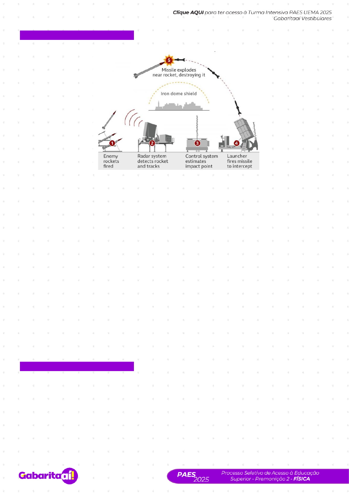 <p>Questão 41</p><p>Disponivel em https://www.civilsdaily.com/news/iron-dome-israels-guardian-terror-attacks/.acesso:</p><p>03/09/2024(adaptado).</p><p>O Iron Dome é um sistema de defesa antimísseis desenvolvido por Israel para proteger contra</p><p>ataques de foguetes e mísseis de curto alcance. Ele intercepta e destrói projéteis antes que atinjam</p><p>áreas povoadas, utilizando um radar para detectar ameaças, um centro de controle para calcular a</p><p>trajetória e unidades de lançamento para disparar mísseis interceptores. O sistema tem uma taxa de</p><p>sucesso de cerca de 90% na proteção de áreas habitadas.</p><p>Texto gerado por Microsoft Copilot no Bing, em 03/09/2024.</p><p>Considere um míssil do sistema Iron Dome lançado com uma velocidade inicial de 3100 km/h a um</p><p>ângulo de 45° em relação à horizontal. Desprezando a resistência do ar e considerando a aceleração</p><p>da gravidade como 10 m/s².Sabendo que este míssil atinge um alvo inimigo na sua altura máxima,</p><p>qual é aproximadamente, seu o alcance horizontal?</p><p>a) 63𝑘𝑚</p><p>b) 37𝑘𝑚</p><p>c) 39 km</p><p>d) 78 𝑘𝑚</p><p>e) 83 𝑘𝑚</p><p>Questão 42</p><p>A montanha-russa é uma das atrações mais emocionantes e procuradas do Fantástico Park,</p><p>localizada no Espaço Reserva, no Shopping da Ilha em São Luís, Maranhão. Essa montanha-russa</p><p>promete uma experiência cheia de adrenalina e diversão para visitantes de todas as idades.</p><p>Com um design moderno e seguro, a montanha-russa oferece curvas acentuadas, subidas</p><p>vertiginosas e descidas de tirar o fôlego. É perfeita para quem busca uma dose extra de emoção e</p><p>quer sentir a adrenalina correr nas veias. Além disso, a vista panorâmica do alto da montanha-russa</p><p>proporciona um visual incrível da cidade de São Luís, tornando a experiência ainda mais memorável.</p><p>https://www.civilsdaily.com/news/iron-dome-israels-guardian-terror-attacks/.acesso</p><p>https://www.bing.com/chat?form=NTPCHB</p><p>https://www.sympla.com.br/evento/fantastico-park/2519712</p><p>https://www.sympla.com.br/evento/fantastico-park/2519712</p><p>https://oimparcial.com.br/noticias/2024/08/fantastico-park-aproveite-o-fim-de-semana-em-familia/</p><p>https://oimparcial.com.br/noticias/2024/08/fantastico-park-aproveite-o-fim-de-semana-em-familia/</p><p>O Fantástico Park é conhecido por trazer uma variedade de brinquedos radicais e divertidos, e a</p><p>montanha-russa é, sem dúvida, uma das estrelas do parque. Se você está em busca de aventura e</p><p>momentos inesquecíveis, não pode deixar de conferir essa atração quando visitar São Luís.</p><p>Abaixo temos uma ilustração dessa montanha russa (fora de escala). Considere que no instante 𝑡0</p><p>= 0 𝑠, um carrinho de massa 150kg (massa total), parta do ponto A com 𝐻𝐴 = 24𝑚 e uma velocidade</p><p>inicial de 15 m/s e chegue a um ponto B com 𝐻𝐵 = 5𝑚 e velocidade de 20m/s, dissipando X de</p><p>energia mecânica, devido ao atrito. No trecho BC o atrito é desprezível e a altura atingida é 𝐻𝑐 =</p><p>15𝑚 e com velocidade Y .Adote: 𝑔 = 10𝑚/𝑠2 e √2 ≅ 1,4. Os valores aproximados de X e Y são</p><p>respectivamente:</p><p>a) X=15,4KJ e Y=14 m/s</p><p>b) X=20,3kJ e Y=15 m/s</p><p>c) X=15,4kJ e Y=15 m/s</p><p>d) X=20,4kJ e Y=17 m/s</p><p>e) X=30,3kJ e Y=13 m/s</p><p>Questão 43</p><p>A polarização de uma onda é um fenômeno que ocorre exclusivamente em ondas transversais, como</p><p>a luz. Esse processo envolve a seleção de uma direção específica de vibração da onda, enquanto</p><p>as vibrações em outras direções são bloqueadas por um dispositivo chamado polarizador12.</p><p>Por exemplo, quando a luz passa por um polarizador, apenas as ondas que vibram em uma direção</p><p>específica conseguem atravessar. Se um segundo polarizador for colocado perpendicularmente ao</p><p>primeiro, a luz polarizada não conseguirá passar, demonstrando a eficácia do processo.</p><p>A polarização é importante em várias aplicações, como em óculos de sol polarizados, que reduzem</p><p>o brilho refletido em superfícies, e em tecnologias de comunicação, onde as ondas eletromagnéticas</p><p>são polarizadas para melhorar a qualidade do sinal.</p><p>Texto gerado por Microsoft Copilot no Bing, em 03/09/2024.</p><p>Qual das seguintes afirmações sobre a polarização de ondas é correta?</p><p>a) A polarização ocorre em ondas longitudinais, como o som.</p><p>b) Um polarizador permite que todas as direções de vibração passem.</p><p>c) A polarização é útil apenas em óculos de sol.</p><p>d) A polarização envolve a seleção de uma direção específica de vibração em ondas transversais.</p><p>e) A luz polarizada pode passar por dois polarizadores perpendiculares.</p><p>https://www.sympla.com.br/evento/fantastico-park/2519712</p><p>https://www.sympla.com.br/evento/fantastico-park/2519712</p><p>https://brasilescola.uol.com.br/fisica/polarizacao-ondas.htm</p><p>https://brasilescola.uol.com.br/fisica/polarizacao-ondas.htm</p><p>https://brasilescola.uol.com.br/fisica/polarizacao-ondas.htm</p><p>https://brasilescola.uol.com.br/o-que-e/fisica/o-que-e-polarizacao.htm</p><p>https://brasilescola.uol.com.br/fisica/polarizacao-ondas.htm</p><p>https://brasilescola.uol.com.br/fisica/polarizacao-ondas.htm</p><p>https://brasilescola.uol.com.br/o-que-e/fisica/o-que-e-polarizacao.htm</p><p>https://brasilescola.uol.com.br/o-que-e/fisica/o-que-e-polarizacao.htm</p><p>https://brasilescola.uol.com.br/o-que-e/fisica/o-que-e-polarizacao.htm</p><p>https://www.bing.com/chat?form=NTPCHB</p><p>Questão 44</p><p>Sete sóis no céu de uma cidade na China</p><p>Recentemente, um fenômeno raro chamou a atenção na cidade de Chengdu, na China, onde</p><p>moradores testemunharam a aparição de sete sóis no céu. Esse evento, que pode parecer algo saído</p><p>de um filme de ficção científica, é na verdade uma ilusão 
