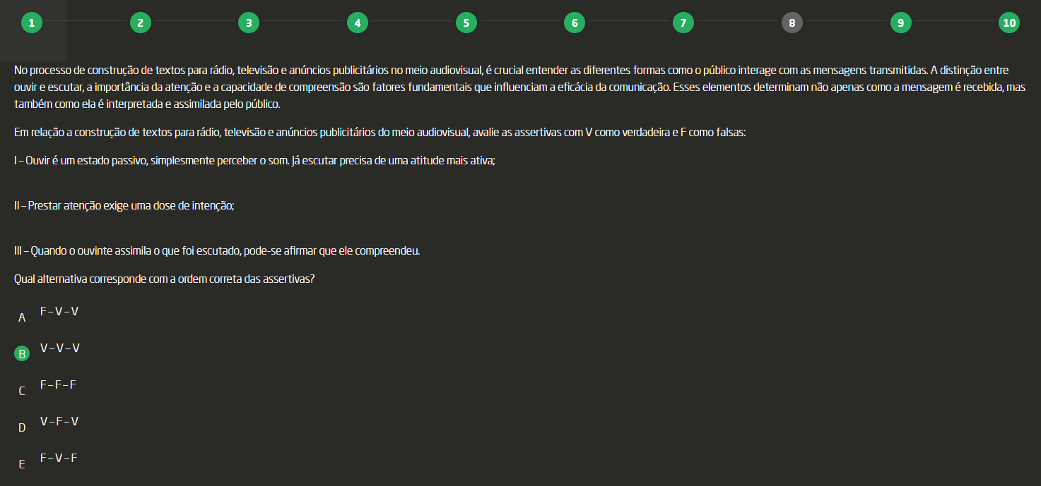 <p>1 2 3 4 5 6 7 8 9 10 No processo de construção de textos para rádio, televisão e anúncios publicitários no meio audiovisual, é crucial entender as diferentes formas como público interage com as mensagens transmitidas. A distinção entre ouvir e escutar, a importância da atenção e a capacidade de compreensão são fatores fundamentais que influenciam a eficácia da comunicação. Esses elementos determinam não apenas como a mensagem é recebida, mas também como ela é interpretada e assimilada pelo público. Em relação a construção de textos para rádio, televisão e anúncios publicitários do meio audiovisual, avalie as assertivas com V como verdadeira e F como I - Ouvir é um estado passivo, simplesmente perceber escutar precisa de uma atitude mais ativa; II - Prestar atenção exige uma dose de III - Quando ouvinte assimila que foi escutado, pode-se afirmar que ele compreendeu. Qual alternativa corresponde com a ordem correta das assertivas? F-V-V A V-V-V B F-F-F D V-F-V F-V-F E</p>