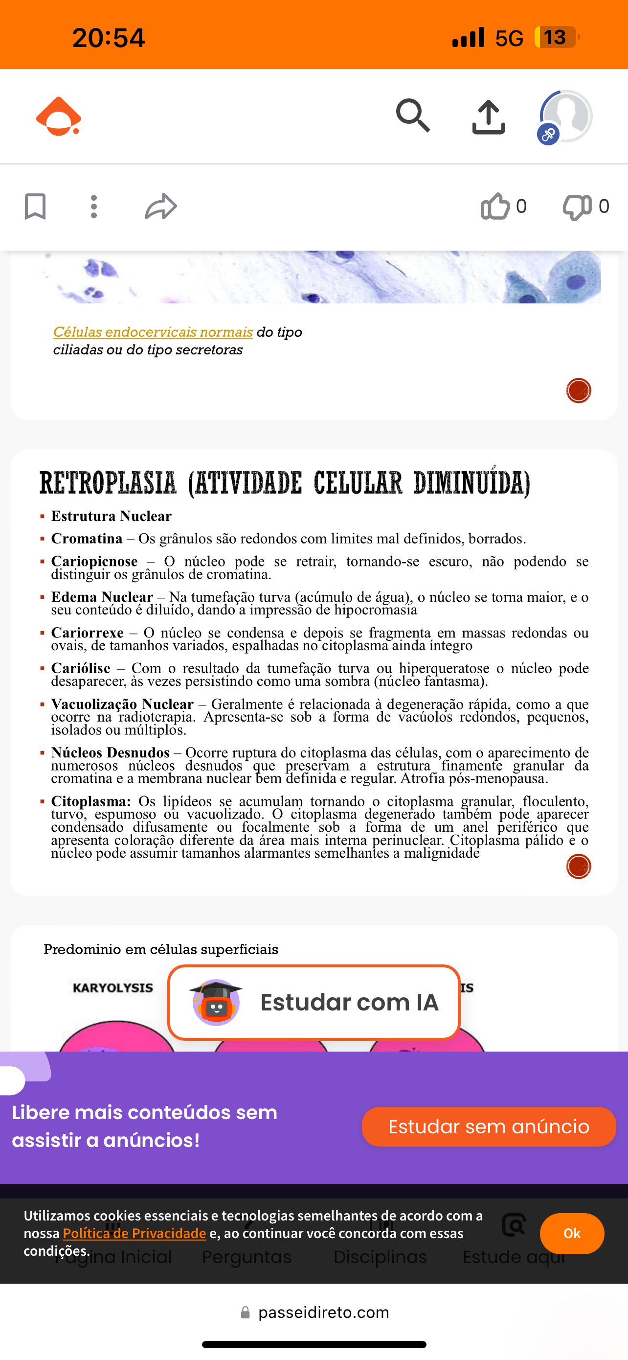 <p>20:54 5G 13 0 0 Células endocervicais normais do tipo ciliadas ou do tipo secretoras RETROPLASIA (ATIVIDADE CELULAR DIMINUÍDA) Estrutura Nuclear Cromatina - Os grânulos são redondos com limites mal definidos, borrados. Cariopicnose - O núcleo pode se retrair, tornando-se escuro, não podendo se distinguir os grânulos de cromatina. Edema Nuclear - Na tumefação turva (acúmulo de água), o núcleo se torna maior, e o seu conteúdo é diluído, dando a impressão de hipocromasia Cariorrexe - núcleo se condensa e depois se fragmenta em massas redondas ou ovais, de tamanhos variados, espalhadas no citoplasma ainda íntegro Cariólise - Com o resultado da tumefação turva ou hiperqueratose o núcleo pode desaparecer, às vezes persistindo como uma sombra (núcleo fantasma). Vacuolização Nuclear - Geralmente é relacionada à degeneração rápida, como a que ocorre na radioterapia. Apresenta-se sob a forma de vacúolos pequenos, isolados ou múltiplos. Núcleos Desnudos - Ocorre ruptura do citoplasma das células, com o aparecimento de numerosos núcleos desnudos que preservam a estrutura finamente granular da cromatina e a membrana nuclear bem definida e regular. Atrofia pós-menopausa. Citoplasma: Os lipídeos se acumulam tornando o citoplasma granular, floculento, turvo, espumoso ou vacuolizado. citoplasma degenerado também pode aparecer condensado difusamente ou focalmente sob a forma de um anel periférico que apresenta coloração diferente da área mais interna perinuclear. Citoplasma pálido e o núcleo pode assumir tamanhos alarmantes semelhantes a Predominio em células superficiais KARYOLYSIS IS Estudar com IA Libere mais conteúdos sem Estudar sem anúncio assistir a anúncios! Utilizamos cookies essenciais e tecnologias semelhantes de acordo com a nossa Política de Privacidade e, ao continuar você concorda com essas Q Ok condições. Inicial Perguntas Disciplinas Estude aqui passeidireto.com</p>