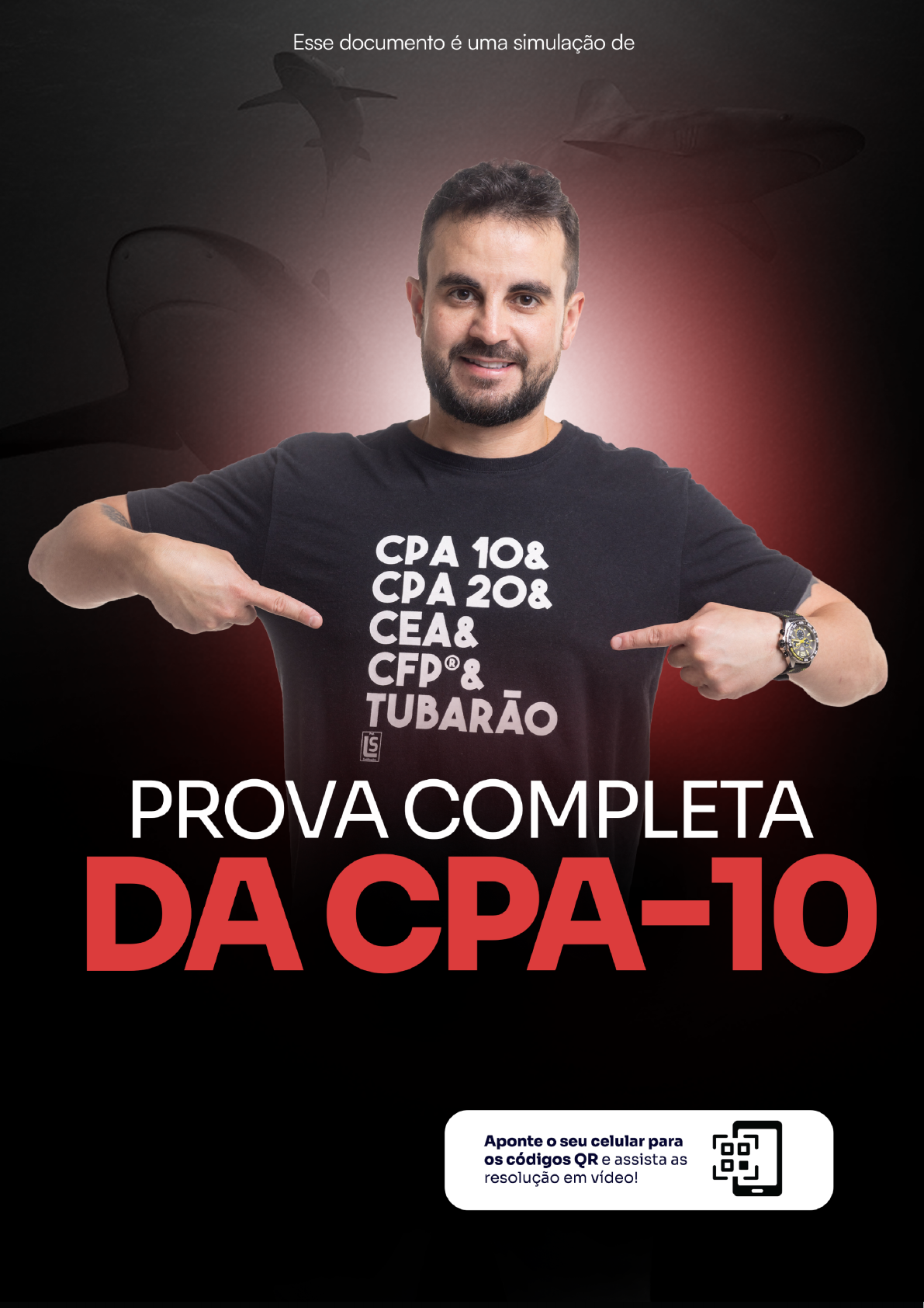 <p>Esse documento é uma simulação de</p><p>QUEM SOMOS?</p><p>Quando pensei em construir a minha escola, a Lucas Silva Educação,</p><p>queria ir além de aprovar pessoas nas certificações financeiras. O meu</p><p>objetivo é mudar vidas a partir da educação.</p><p>Eu, o professor Lucas Silva, sou o responsável por aprovar mais de 85 mil</p><p>alunos nas certificações financeiras. Foram mais de 85 mil vidas</p><p>transformadas.</p><p>E, olhando para a certificação CPA-10, a Certificação Profissional ANBIMA</p><p>Série 10, fico muito feliz em afirmar que sou o responsável por ter</p><p>aprovado a maioria dos profissionais com CPA-10 no Brasil.</p><p>Isso é um marco histórico, mas que mostra que ainda tenho muito a fazer:</p><p>trazer mais pessoas para o mercado financeiro a partir da certificação que</p><p>é a porta de entrada deste mercado: a CPA-10.</p><p>Acompanhe as nossas redes sociais!!</p><p>Clique nos ícones abaixo:</p><p>@professorlucassilva @lseducacao Canal do TelegramCanal do Youtube</p><p>https://www.instagram.com/professorlucassilva/</p><p>https://www.instagram.com/lseducacao/</p><p>https://www.youtube.com/channel/UCUowWv92bJV4tCJpKLSQjZg</p><p>https://t.me/saiadocardume</p><p>O QUE É ESTE MATERIAL?</p><p>Tubarão, uma das mensagens que mais recebo dos meus</p><p>alunos é a curiosidade de como é a prova da CPA-10.</p><p>Leram o edital, entenderam o que precisa para a prova,</p><p>tempo de duração, percentual de acertos para aprovação,</p><p>entre outras questões. Mas, aquelas dúvidas vêm à tona:</p><p>Como os conteúdos são cobrados? Como detectar</p><p>questões fáceis, médias e difíceis?</p><p>E com o objetivo de sempre entregar mais para os nossos</p><p>Tubarões, elaborei este material valiosíssimo: um</p><p>simulado completo da prova da CPA-10!</p><p>Sim, você está diante da experiência completa e exata de</p><p>como é a prova, do que é cobrado, como os conteúdos</p><p>aparecem nas questões, divisão dos módulos.</p><p>Este simulado é um dos materiais responsáveis por</p><p>batermos recordes de aprovados na CPA-10. A ideia é</p><p>sempre deixar os nossos alunos prontos para o dia do</p><p>exame.</p><p>E aí, bora começar esta jornada? Bom simulado,</p><p>Tubarão!</p><p>1 - O Estagiário foi nomeado presidente do Banco Central do</p><p>Brasil. Sendo assim, analise as afirmações abaixo:</p><p>I – O mandato dele irá coincidir com o mandato do</p><p>presidente da república</p><p>II – Realizar operações de redesconto é uma das funções do</p><p>BACEN</p><p>III – Coordenar a política monetária é também uma das</p><p>funções do BACEN</p><p>Está correto o que se afirma em:</p><p>A) I, II e III</p><p>B) II, apenas</p><p>C) II e III</p><p>D) II e I</p><p>2 - Sobre a B3, analise as afirmações abaixo:</p><p>I – Trata-se de uma empresa pública voltada para a</p><p>negociação de ações e títulos</p><p>II – É uma empresa com atuação em mercado de balcão e</p><p>bolsa para títulos de renda fixa e variável</p><p>III – Possui fiscalização da CVM</p><p>Está correto o que se afirma em:</p><p>A) I e II</p><p>B) I e III</p><p>C) II e III</p><p>D) I, II e III</p><p>APONTE A CÂMERA</p><p>DO SEU CELULAR AQUI</p><p>APONTE A CÂMERA</p><p>DO SEU CELULAR AQUI</p><p>3 - O SharkBank Múltiplo S.A é um banco que possui a</p><p>carteira Comercial e a de Arrendamento Mercantil. Esse</p><p>banco está, portanto, autorizado pelo Banco Central a:</p><p>I – Captar por depósito a prazo</p><p>II – Administrar fundos de investimentos</p><p>III – Coordenar operações de abertura de capital na bolsa de</p><p>valores</p><p>Está correto o que se afirma em:</p><p>A) I e II</p><p>B) I e III</p><p>C) Apenas I</p><p>D) I, II e III</p><p>4 - O Estagiário possui uma concessionária de veículos,</p><p>SharkCar e um cliente vai até a loja e compra 3 veículos, no</p><p>valor total de R$ 700 mil, e faz o pagamento do valor total</p><p>em espécie. Estagiário então, com medo de ser assaltado, vai</p><p>na mesma hora até a sua agência bancária no SharkBank e</p><p>faz o depósito de todo o valor em sua conta corrente. Nesse</p><p>caso:</p><p>I – Estagiário está cometendo uma infração por ter recebido</p><p>o valor em espécie</p><p>II – O gerente do SharkBank precisa avisar o COAF em</p><p>até 24 horas</p><p>III – O comprador está cometendo crime de Lavagem de</p><p>Dinheiro</p><p>Está correto o que se afirma em:</p><p>A) I e II</p><p>B) I e III</p><p>C) Apenas II</p><p>D) II e III</p><p>APONTE A CÂMERA</p><p>DO SEU CELULAR AQUI</p><p>APONTE A CÂMERA</p><p>DO SEU CELULAR AQUI</p><p>5 - O Estagiário é um profissional que atua com</p><p>recomendações de produtos de investimentos. Ao ler a</p><p>Instrução N° 30 da CVM, ele ficou ciente sobre as vedações</p><p>dessa regulamentação. Sendo assim, ele não pode realizar</p><p>recomendações de investimentos quando:</p><p>I – O perfil do cliente não estiver atualizado</p><p>II – O produto ou serviço não estiver adequado ao perfil do</p><p>cliente</p><p>III – O tipo de investimento for de alto risco</p><p>Está correto o que se afirma em:</p><p>A) I e III</p><p>B) II e III</p><p>C) I, II e III</p><p>D) I e II</p><p>6 - O Estagiário possui uma longa caminhada focado em</p><p>atividades voltadas a PLDFT, por isso foi indicado pelo</p><p>___________ para ser presidente do Conselho de Controle de</p><p>Atividades Financeiras (COAF).</p><p>Complete a lacuna</p><p>A) Presidente da República</p><p>B) Ministro da Fazenda</p><p>C) Presidente do BACEN</p><p>D) Presidente da CVM</p><p>APONTE A CÂMERA</p><p>DO SEU CELULAR AQUI</p><p>APONTE A CÂMERA</p><p>DO SEU CELULAR AQUI</p><p>7 - O Estagiário está conversando com alguns amigos sobre</p><p>as funções da Comissão de Valores Mobiliários – CVM. São</p><p>funções da mesma:</p><p>I – Fiscalizar permanentemente as atividades e os serviços</p><p>do mercado de valores mobiliários</p><
