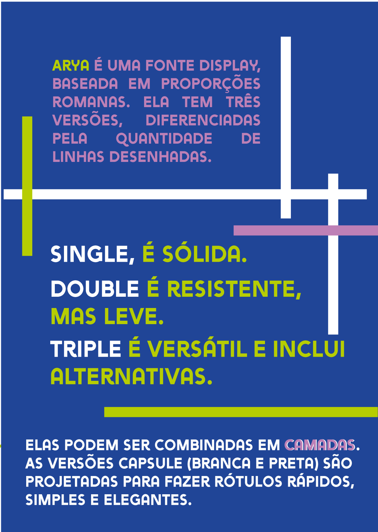 <p>ARYA É UMA FONTE DISPLAY, BASEADA EM PROPORÇÕES ROMANAS. ELA TEM TRÊS VERSÕES, DIFERENCIADAS PELA QUANTIDADE DE LINHAS DESENHADAS. SINGLE, É SÓLIDA. DOUBLE É RESISTENTE, MAS LEVE. TRIPLE É VERSÁTIL E ALTERNATIVAS. ELAS PODEM SER COMBINADAS EM CAMADAS. AS VERSÕES CAPSULE (BRANCA E PRETA) SÃO PROJETADAS PARA FAZER RÓTULOS RÁPIDOS, SIMPLES E ELEGANTES.</p>
