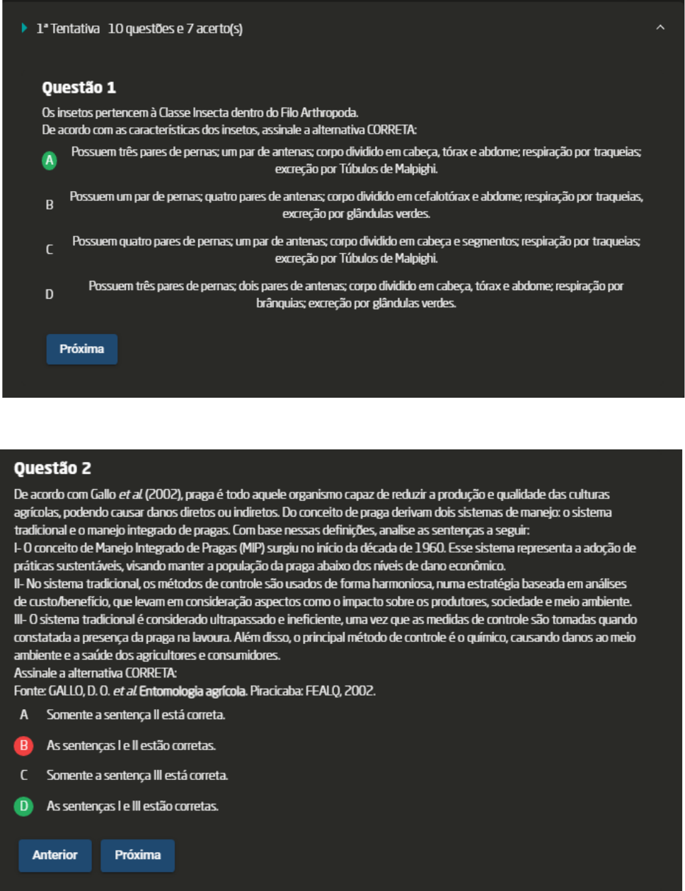 <p>10 questões e 7 acerto(s) Questão 1 Os insetos pertencem à Classe Insecta dentro do Filo Arthropoda. De acordo com as características dos insetos, assinale a alternativa CORRETA: Possuem três pares de pernas; um par de corpo dividido em cabeça, tórax e respiração por A excreção por Túbulos de Malpighi. Possuem um par de pernas; quatro pares de antenas; corpo dividido em cefalotórax e respiração por traqueias, B excreção por glândulas verdes. Possuem quatro pares de pernas; um par de antenas; corpo dividido em cabeça e segmentos; respiração por excreção por Túbulos de Malpighi. Possuem três pares de pernas; dois pares de antenas; corpo dividido em cabeça, tórax e abdome; respiração por D excreção por glândulas verdes. Próxima Questão 2 De acordo com Gallo et al (2002), praga é todo aquele organismo capaz de reduzir a produção e qualidade das culturas agrícolas, podendo causar danos diretos ou indiretos. Do conceito de praga derivam dois sistemas de manejo: sistema tradicional e o manejo integrado de pragas. Com base nessas definições, analise as sentenças a seguir: conceito de Manejo Integrado de Pragas (MIP) surgiu no início da década de 1960. Esse sistema representa a adoção de práticas sustentáveis, visando manter a população da praga abaixo dos níveis de dano econômico. II- No sistema tradicional, os métodos de controle são usados de forma harmoniosa, numa estratégia baseada em análises de que levam em consideração aspectos como o impacto sobre os produtores, sociedade e meio III- sistema tradicional é considerado ultrapassado e ineficiente, uma vez que as medidas de controle são tomadas quando constatada a presença da praga na lavoura. Além disso, o principal método de controle é o químico, causando danos ao meio ambiente e a saúde dos agricultores e consumidores. Assinale a alternativa CORRETA: Fonte: GALLO, D.O. et Entomologia agrícola. Piracicaba: FEALQ, 2002. A Somente a sentença está correta. B As sentenças I e II estão corretas. C Somente a sentença III está D As sentenças I e III estão corretas Anterior Próxima</p><p>10 questões e 7 acerto(s) Questão 3 Os representantes da ordem Coleoptera são insetos conhecidos como besouros e podem ser encontrados em quase todos ambientes. Assinale a alternativa CORRETA em relação às pragas pertencentes a esta A Os adultos são coloridos, pequenos e possuem primeiro par de asas semelhantes às asas de baratas (tégminas). B Os adultos são semelhantes às cigarrinhas com suas asas dispostas de forma semelhante ao casco dos navios. São pragas tanto na fase de larva como na fase adulta e possuem aparelho bucal mastigador. D Os representantes desta ordem não possuem Anterior Próxima Tentativa 10 questões e 7 acerto(s) Questão 5 A elaboração de um programa de MIP envolve diversas etapas. Acerca dessas etapas, analise as sentenças a Para a identificação das pragas-chave é suficiente reconhecimento dos aspectos bionômicos (biologia, hábitos, hospedeiros, inimigos naturais, dentre outros), sendo irrelevante a classificação taxonômica dos indivíduos. A observação da presença de inimigos naturais indica um potencial de mortalidade natural nos agroecossistemas. A partir disso, pode-se estabelecer técnicas de criação de inimigos naturais para liberação, bem como técnicas de produção de patógenos (Controle III- 0 estabelecimento dos níveis de dano econômico e controle devem ser determinados com base na fenologia da planta como, por exemplo, no estágio vegetativo ou reprodutivo em que cultura está menos vulnerável ao ataque da praga. Assinale a alternativa CORRETA: A As sentenças I e III estão corretas. B Somente a sentença III está correta. As sentenças I e II estão corretas. D Somente a sentença II está correta. Anterior Próxima</p><p>10 questões e 7 Questão 6 Após a identificação das principais pragas de uma cultura, é necessário estabelecer um plano de amostragem de De acordo com conceitos obtidos sobre planos de amostragem, classifique V para as sentenças verdadeiras e F para as ( ) A amostragem deve representar bem a realidade, ser lenta, de fácil execução para o agricultor e barata. ( ) Por se tratar de uma técnica simples e de fácil execução, não é necessário realizar estudos prévios para a confecção dos planos de ( ) A amostragem tem por objetivo verificar nível das populações de pragas e dos inimigos naturais nas lavouras Assinale a alternativa que apresenta a A B V-F-F C F-V-F D V-F-V Anterior Próxima Tentativa 10 questões e 7 acerto(s) Questão 7 São pragas-chave em citros, as moscas-das-frutas, a o bicho-furão,o ácaro-da-ferrugem e o Com base nos conhecimentos adquiridos, analise as sentenças a seguir: atacam principalmente as folhas mais novas, abrindo minas típicas de prateada, tornando as folhas mais retorcidas e secas. Em decorrência do ataque há redução da fotossíntese e, consequentemente, do crescimento e desenvolvimento das brotações e produtividade da planta. II- A diferença do ataque do bicho-furão comparado ao da mosca-das-frutas são excrementos (e restos de alimentação) lançados pelo primeiro para fora da casca, os quais conferem um aspecto endurecido ao fruto. III- A (Phyllocnistis citrella) ataca os citros, produzindo sintoma conhecido por "mancha de graxa" devido ao rompimento de glândulas de óleo, que em contato com os raios solares, escurecendo os frutos. Assinale a alternativa CORRETA: A Somente a sentença II está correta. B Somente a sentença I está correta. C As sentenças I e II estão D As sentenças I e III estão Anterior Próxima</p><p>Tentativa 10 questões e 7 acerto(s) Questão 8 Em culturas ornamentais, as pragas-chave podem ser agrupadas em quatro grupos distintos: sugadores, minadores, desfolhadores e Sobre estas pragas, assinale a alternativa CORRETA: A mosca-branca (Bemisia tabaci biótipos A e B) é considerada uma praga desfolhadora, 