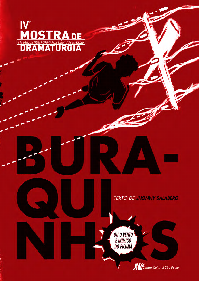 <p>texto</p><p>JHONNY SALABERG</p><p>direção</p><p>NARUNA COSTA</p><p>elenco</p><p>AILTON BARROS</p><p>CLAYTON NASCIMENTO</p><p>JHONNY SALABERG</p><p>realização</p><p>CARCAÇA DE POÉTICAS NEGRAS</p><p>CENTRO CULTURAL SÃO PAULO</p><p>NÓS 2 PRODUTORAS ASSOCIADAS</p><p>OU O VENTO</p><p>É INIMIGO</p><p>DO PICUMÃ</p><p>Associação</p><p>Centro Cultural</p><p>6 | BURAQUINHOS</p><p>: CONSOLI-</p><p>DAÇÃO</p><p>Este quarto movimento da Mostra de dramaturgia em pe-</p><p>quenos formatos cênicos do Centro Cultural São Paulo é sem</p><p>dúvida o que consolida o projeto, lindamente amadurecido</p><p>com a participação de nove autores e autoras selecionados</p><p>nas edições anteriores e a inscrição de algumas centenas</p><p>de outros e outras, que enviaram seus textos.</p><p>BURAQUINHOS | 7</p><p>A edição atual ensaia mais deliberadamente as pontes</p><p>entre estética e política em um momento em que esta re-</p><p>lação volta a ganhar recorrência na cena brasileira. Foram</p><p>selecionados para montagem os textos de Ave Terrena Alves,</p><p>As 3 uiaras de SP City - barbante roxo do mural da memória,</p><p>Jhonny Salaberg, Buraquinhos ou o vento é inimigo do picumã</p><p>e Marcos Barbosa, Necropolítca. Nos dois primeiros preva-</p><p>lecem as discussões de gênero, raça, lugares de classe e</p><p>de uma microfísica do poder, como dizia Michel Foucault.</p><p>São fábulas que acompanham o momento de emergência</p><p>de temas poucas vezes tratados a partir de posições tão</p><p>afirmativas e críticas como agora. No texto de Ave Terrena</p><p>liberdade e contingência ganham campo de embate a partir</p><p>da história de personagens transgêneros, em espelhamento</p><p>de diferentes momentos da história do país. É projeto que</p><p>está no raiar de um tempo novo para o teatro, em que vozes</p><p>até então silenciadas passam a falar em seu próprio nome</p><p>e com seus próprios modos.</p><p>A peça de Salaberg é uma história altamente concen-</p><p>trada, que articula-se em recursos fantásticos e conta, em</p><p>sofisticada, poética estratégia narrativa, sobre a tragédia</p><p>ordinária de jovens negros nas periferias do Brasil e do</p><p>mundo. Por fim, a quase anti-peça de Marcos Barbosa ob-</p><p>serva a sociabilidade em uma visada mais ampla, discutindo</p><p>as formas atuais do ativismo agora travadas na suspensão</p><p>da aporia e nas suas variações, em torno de temas como</p><p>representatividade e engajamento - palavras que ali ganham</p><p>significados díspares. O campo de ficcionalização lambe o</p><p>nonsense. Vistos no conjunto são três retratos livres mas</p><p>generosamente críticos sobre o Brasil atual, em que a per-</p><p>tinência dos temas não limita a experiência de criação ao</p><p>mero relato da conjuntura em forma teatral. Ao contrário,</p><p>convidam para a invenção de um imaginário interessado</p><p>na invenção de linguagem e, portanto, na expansão dos</p><p>horizontes da dramaturgia.</p><p>8 | BURAQUINHOS</p><p>PROJETO</p><p>O projeto da Mostra de dramaturgia em pequenos</p><p>formatos cênicos nasceu em 2015, de uma necessidade:</p><p>diante dos meios de produção existentes no panorama</p><p>teatral de São Paulo, o que poderia ser útil? O que poderia</p><p>ser relevante em uma cidade cujo teatro é já mais que</p><p>razoavelmente subvencionado? Os editais de montagem</p><p>não têm necessariamente compromisso com o autor. A</p><p>autoria dramatúrgica original é um acidente, pode estar</p><p>como não estar, dependendo do projeto. A impressão das</p><p>brochuras com as peças, distribuídas à plateia, é uma</p><p>tentativa de tornar mais íntima e quem sabe um pouco</p><p>mais duradoura a experiência fugidia do espectador frente</p><p>ao fenômeno teatral em uma época na qual o texto de</p><p>teatro ainda é pouco publicado e é dos nichos menos re-</p><p>presentativos no mercado editorial. A ideia de pequenos</p><p>formatos não é novidade. Nas artes visuais há Mostras e</p><p>salões de pequenos formatos. No cinema, os chamados</p><p>filmes de baixo orçamento. E nestas duas áreas a expec-</p><p>tativa é a de que o “pequeno” não seja indicador de obras</p><p>artísticas de má qualidade. Ao contrário, são condições a</p><p>partir das quais a própria linguagem se articula. No caso</p><p>do teatro é ideia que pressupõe dramaturgias sintéticas no</p><p>plano formal. Em que o plano de pensamento seja mais</p><p>importante e não dependa de muitos recursos materiais</p><p>para a encenação. Então o pequeno formato já não será</p><p>uma contingência e sim um campo de provocações, de</p><p>fomento criativo.</p><p>E assim tem sido. Nos dois primeiros editais tivemos</p><p>cerca de duzentos inscritos (por edição). No terceiro o</p><p>numero subiu. Destes, selecionamos três textos por ano,</p><p>que foram montados e ganharam a cena durante as Mos-</p><p>tras. Os textos escolhidos perfazem um amplo painel da</p><p>sociabilidade e das subjetividades emergentes no Brasil.</p><p>A repercussão pública do projeto tem sido uma alegria.</p><p>BURAQUINHOS | 9</p><p>As Mostras têm acontecido com boas plateias, o público</p><p>está vindo. E o reconhecimento institucional também. Nas</p><p>duas primeiras edições ao menos um dos três espetá-</p><p>culos nascidos do edital esteve entre os mais premiados</p><p>do ano e o próprio Centro Cultural São Paulo foi indicado</p><p>ao Premio Shell de teatro, na categoria Inovação, “pelo</p><p>estímulo à experimentação de novas formas cênicas,</p><p>dramatúrgicas e de produção”.</p><p>No Edital do CCSP, pelas contingências (que tenta-</p><p>mos transformar em adubo) escolhemos, entre estas</p><p>tantas possibilidades, jogar luz sobre o texto. Que não é</p><p>necessariamente “a peça”. Temos recebido e premiado</p><p>inúmeras escritas experimentais e textos tradicionais</p><p>também. A resposta ao chamado, com