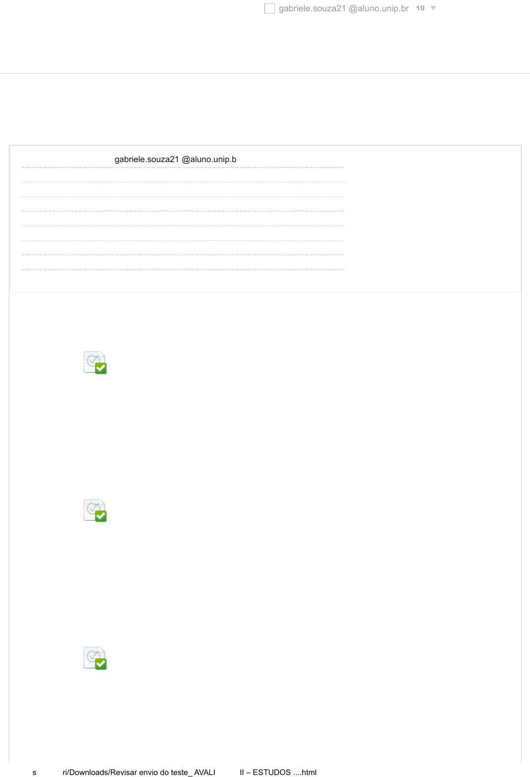 <p>Revisar envio do teste: AVALIAÇÃO II</p><p>ESTUDOS DISCIPLINARES II 6594-15_SEI_DS_0722_R_20241 CONTEÚDO</p><p>Usuário gabriele.souza21 @aluno.unip.br</p><p>Curso ESTUDOS DISCIPLINARES II</p><p>Teste AVALIAÇÃO II</p><p>Iniciado 06/06/24 19:10</p><p>Enviado 06/06/24 19:32</p><p>Status Completada</p><p>Resultado da tentativa 9 em 10 pontos</p><p>Tempo decorrido 22 minutos</p><p>Resultados exibidos Respostas enviadas, Perguntas respondidas incorretamente</p><p>Pergunta 1</p><p>Resposta Selecionada: a.</p><p>No diagrama de sequência, qual a notação representa o tempo em que um objeto existe</p><p>durante um processo?</p><p>Linha de vida.</p><p>Pergunta 2</p><p>Resposta Selecionada: b.</p><p>“Ele apresenta um conjunto de instruções que são executadas quando é chamado”. Qual o</p><p>nome dessa notação dentro do diagrama de classes?</p><p>Métodos.</p><p>Pergunta 3</p><p>Resposta Selecionada: a.</p><p>São primícias e restrições aplicadas a uma operação comercial de uma empresa que precisam</p><p>ser atendidas para que o negócio funcione da maneira esperada:</p><p>Regra de negócio.</p><p>UNIP EAD BIBLIOTECAS MURAL DO ALUNO TUTORIAISCONTEÚDOS ACADÊMICOS</p><p>1 em 1 pontos</p><p>1 em 1 pontos</p><p>1 em 1 pontos</p><p>gabriele.souza21 @aluno.unip.br 10</p><p>06/06/2024, 19:33 Revisar envio do teste: AVALIAÇÃO II – ESTUDOS ...</p><p>file:///C:/Users/gabri/Downloads/Revisar envio do teste_ AVALIAÇÃO II – ESTUDOS ....html 1/3</p><p>http://company.blackboard.com/</p><p>https://ava.ead.unip.br/webapps/blackboard/execute/courseMain?course_id=_349048_1</p><p>https://ava.ead.unip.br/webapps/assessment/review/review.jsp?attempt_id=_105584636_1&course_id=_349048_1&content_id=_4002129_1&return_content=1&step=#contextMenu</p><p>https://ava.ead.unip.br/webapps/blackboard/content/listContent.jsp?course_id=_349048_1&content_id=_3999703_1&mode=reset</p><p>https://ava.ead.unip.br/webapps/portal/execute/tabs/tabAction?tab_tab_group_id=_10_1</p><p>https://ava.ead.unip.br/webapps/portal/execute/tabs/tabAction?tab_tab_group_id=_27_1</p><p>https://ava.ead.unip.br/webapps/portal/execute/tabs/tabAction?tab_tab_group_id=_47_1</p><p>https://ava.ead.unip.br/webapps/portal/execute/tabs/tabAction?tab_tab_group_id=_29_1</p><p>https://ava.ead.unip.br/webapps/portal/execute/tabs/tabAction?tab_tab_group_id=_25_1</p><p>https://ava.ead.unip.br/webapps/login/?action=logout</p><p>Highlight</p><p>Pergunta 4</p><p>Resposta Selecionada: c.</p><p>São as características que devem ser atendidas pelo software:</p><p>Requisito funcional.</p><p>Pergunta 5</p><p>Resposta Selecionada: b.</p><p>Qual o diagrama apresenta uma linguagem simples e de fácil compreensão para que os</p><p>usuários possam ter uma ideia geral de como o sistema irá se comportar?</p><p>Diagrama de caso de uso.</p><p>Pergunta 6</p><p>Resposta Selecionada: a.</p><p>Em qual diagrama deve-se descrever sempre o passo a passo focando no nível mais baixo</p><p>com maior riqueza de detalhes?</p><p>Diagrama de atividades.</p><p>Pergunta 7</p><p>Resposta Selecionada: a.</p><p>Qual dos itens a seguir é considerado a propriedade de um sistema que tem de poder ser</p><p>decomposto em um conjunto de módulos coesos e fortemente ligados?</p><p>Modularidade.</p><p>Pergunta 8</p><p>Resposta</p><p>Selecionada:</p><p>d.</p><p>Objetos que são abstrações podem ser considerados:</p><p>Entidades do mundo real e de algum sistema que autogerenciam.</p><p>Pergunta 9</p><p>1 em 1 pontos</p><p>1 em 1 pontos</p><p>1 em 1 pontos</p><p>1 em 1 pontos</p><p>1 em 1 pontos</p><p>0 em 1 pontos</p><p>06/06/2024, 19:33 Revisar envio do teste: AVALIAÇÃO II – ESTUDOS ...</p><p>file:///C:/Users/gabri/Downloads/Revisar envio do teste_ AVALIAÇÃO II – ESTUDOS ....html 2/3</p><p>Quinta-feira, 6 de Junho de 2024 19h32min20s GMT-03:00</p><p>Resposta Selecionada: e.</p><p>Qual o estereótipo é utilizado para interpretar um evento ocorrido sobre o objeto também</p><p>considerado a ligação entre a interface e o objeto?</p><p>Boundary.</p><p>Pergunta 10</p><p>Resposta Selecionada: b.</p><p>Características como portabilidade, segurança e confiabilidade se referem a:</p><p>Requisito não funcional.</p><p>← OK</p><p>1 em 1 pontos</p><p>06/06/2024, 19:33 Revisar envio do teste: AVALIAÇÃO II – ESTUDOS ...</p><p>file:///C:/Users/gabri/Downloads/Revisar envio do teste_ AVALIAÇÃO II – ESTUDOS ....html 3/3</p><p>https://ava.ead.unip.br/webapps/assessment/review/review.jsp?attempt_id=_105584636_1&course_id=_349048_1&content_id=_4002129_1&return_content=1&step=#</p>