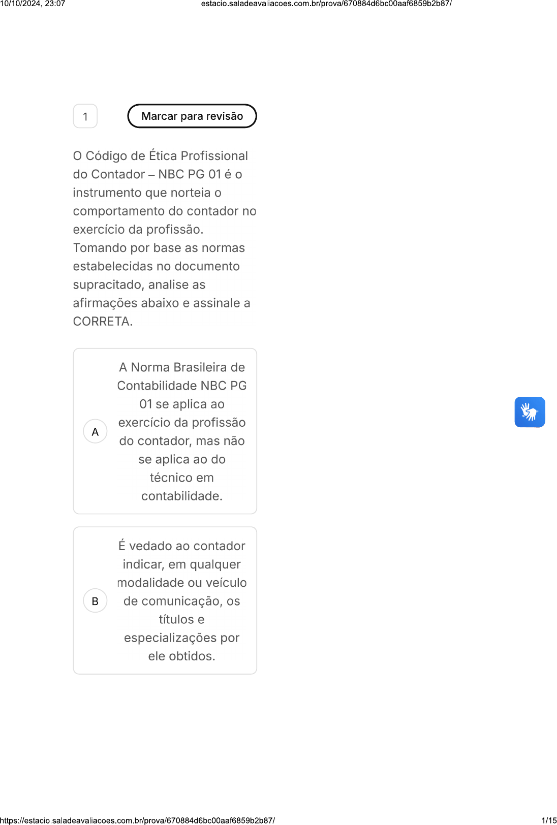<p>10/10/2024, 23:07 1 Marcar para revisão Código de Ética Profissional do Contador - NBC PG 01 é o instrumento que norteia o comportamento do contador no exercício da profissão. Tomando por base as normas estabelecidas no documento supracitado, analise as afirmações abaixo e assinale a CORRETA. A Norma Brasileira de Contabilidade NBC PG 01 se aplica ao exercício da profissão A do contador, mas não se aplica ao do técnico em contabilidade. É vedado ao contador indicar, em qualquer modalidade ou veículo B de comunicação, os títulos e especializações por ele obtidos. 1/15</p><p>10/10/2024, 23:07 É dever do contador renunciar às funções que exerce, logo que se positive falta de confiança por parte do cliente ou C empregador, e vice- versa, a quem deve notificar por escrito, respeitando os prazos estabelecidos em contrato. É dever do contador expressar argumentos ou dar conhecimento de sua convicção pessoal sobre os D direitos de quaisquer das partes interessadas ou da justiça da causa em que estiver servindo. contador poderá divulgar informação confidencial obtida ou recebida em decorrência da relação profissional E ou comercial após o término dessa relação, desde que para resguardar direito ou benefício de terceiro. 2/15</p><p>10/10/2024, 23:07 estacio.saladeavaliacoes.com.br/prova/670884d6bc00aaf6859b2b87/ 2 Marcar para revisão De acordo com o Código de Ética Profissional do Contador - CEPC e as Normas Brasileiras de Contabilidade, julgue os procedimentos hipotéticos a seguir e, em seguida, assinale a opção CORRETA. I. As demonstrações contábeis da Sociedade Empresária foram elaboradas de acordo com o que foi definido entre o profissional de contabilidade e os gestores da sociedade. Assim, em decorrência dessas definições, as receitas foram reconhecidas quando recebidas e as despesas, quando pagas. Para efeito da elaboração do Balanço Patrimonial de 31.12.2014, o custo das mercadorias vendidas e entregues, provenientes das receitas não recebidas, foram transferidas da conta de estoque para contas a receber. II. Um Contador identificou e apresentou em seu relatório de auditoria, dirigido aos gestores de uma Sociedade Empresária objeto desta auditoria, diversos equívocos cometidos por um colega Contador na aplicação das Normas Brasileiras de Contabilidade editadas pelo Conselho Federal de Contabilidade, na elaboração das demonstrações contábeis. III. Um profissional de contabilidade foi contratado 3/15</p><p>10/10/2024, 23:07 para dar parecer sobre o procedimento contábil a ser adotado no reconhecimento de um determinado ativo. Reconhecendo que o parecer poderia ser útil para outros profissionais, o Contador resolveu publicá-lo em revista técnica, em seu nome, omitindo no relatório qualquer dado que remetesse à consulente. Está(ão) CORRETO(S) o(s) procedimento(s): A lell, apenas. B I, e III. C apenas. D II, apenas. E III, apenas. 3 Marcar para revisão Em relação à classe, o Contabilista NÃO deve: 4/15</p><p>10/10/2024, 23:07 Prestar seu concurso moral, intelectual e material, salvo A circunstâncias especiais que justifiquem a sua recusa. Zelar pelo prestígio da classe, pela dignidade B profissional e pelo aperfeiçoamento de suas instituições. Aceitar o desempenho de cargo de dirigente C nas entidades de classe, admitindo-se a justa recusa. Utilizar-se de posição ocupada na direção Legislação Ética Profissional Do SM2 T Contador proveito pessoal. Evitar 00 : 34 : 59 Ocultar desentendimentos hora min seg E com o colega a quem vier a substituir no exercício profissional. Questão 10 de 10 1 2 3 4 5 6 7 8 9 10 4 Marcar para revisão Respondidas (10) Em branco (0) 5/15</p><p>10/10/2024, 23:07 Contabilista poderá requerer Finalizar prova desagravo público ao Conselho Regional de Contabilidade quando: For atingido, pública e injustamente, no A exercício de sua profissão. Houver falta cometida em defesa de B prerrogativa profissional. Não for comunicado da instauração do C processo até 30 dias após esgotado o prazo de defesa. Tiver existido, anteriormente, de sua D parte, prestação de relevantes serviços à classe contábil. For comunicado da instauração do processo antes de E trinta dias após esgotado o prazo de defesa. 5 Marcar para revisão 6/15</p><p>10/10/2024, 23:07 A legislação profissional contábil tem o importante papel de regulamentação, a fim de prevenir que pessoas não habilitadas exerçam as prerrogativas profissionais. Os profissionais contábeis dos órgãos da administração A pública fundacional são dispensados de registro no CRC. A escrituração contábil é atividade exclusiva de pessoa B física ou jurídica legalizada perante o CRC. contabilista não pode exercer as suas C atividades na condição de autônomo. 7/15</p><p>10/10/2024, 23:07 estacio.saladeavaliacoes.com.br/prova/670884d6bc00aaf6859b2b87/ Técnico em contabilidade é o profissional graduado D em curso superior de Ciências Contábeis e com registro nessa categoria em Entende-se por exercício da profissão contábil somente as atividades que exigem E a assinatura do profissional da Contabilidade para quaisquer fins legais. 6 Marcar para revisão Os Conselhos de Contabilidade, criados pelo Decreto-Lei 9.295/1946, dotados de personalidade jurídica de direito público e forma federativa, prestam serviço de natureza pública e têm a estrutura, a organização e o funcionamento estabelecidos pela Resolução CFC 1.612, de 11 de fevereiro de 2021. Sobre o sistema CFC/CRCs, podemos afirmar: 8/15</p><p>10/10/2024, 23:07 Conselho Federal de Contabilidade A (CFC) tem sede em São Paulo - SP. Os Conselhos de Contabilidade fiscalizarão o exercício da profissão B apenas de cargos com denominação de contador ou técnico em contabilidade. Cabe ao CRC regular sobre o Exame de C Suficiência Profissional. Cabe ao CFC apreciar e julgar os recursos D de decisões dos CRCs. Não é permitida a contratação de