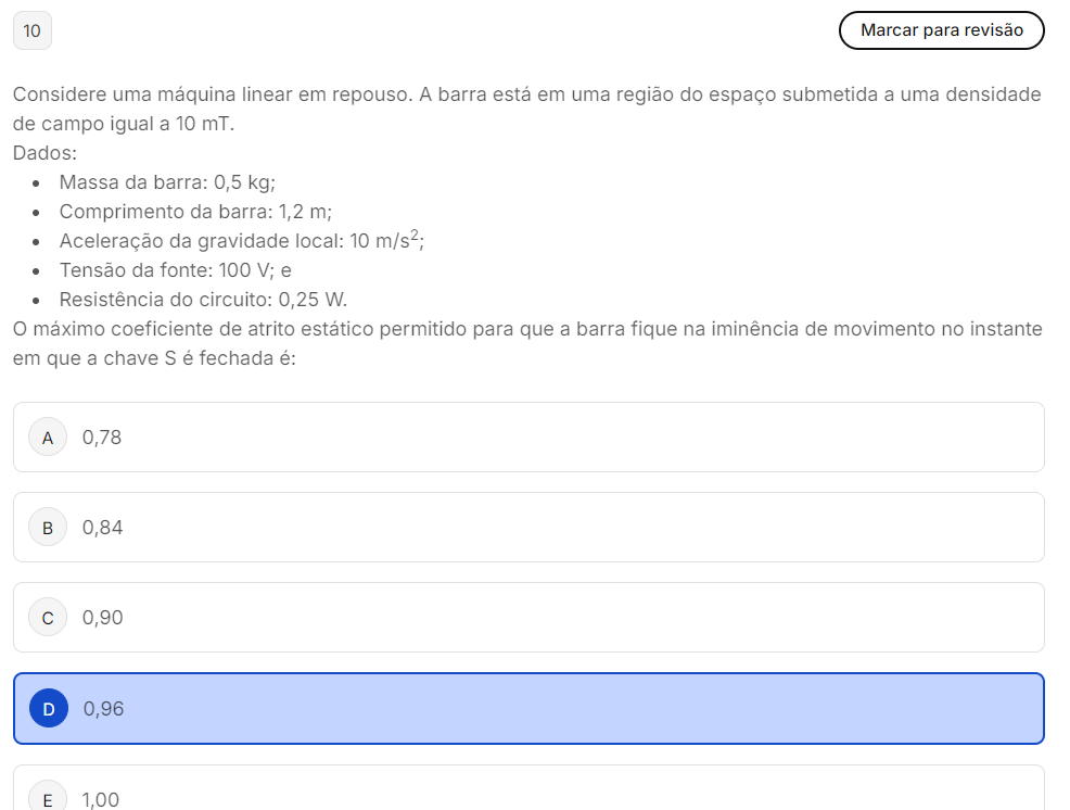 <p>10 Marcar para revisão Considere uma máquina linear em repouso. A barra está em uma região do espaço submetida a uma densidade de campo igual a 10 mT. Dados: Massa da barra: 0,5 kg; Comprimento da barra: 1,2 m; Aceleração da gravidade local: 10 Tensão da fonte: 100 V; e Resistência do circuito: 0,25 W. máximo coeficiente de atrito estático permitido para que a barra fique na iminência de movimento no instante em que a chave S é fechada é: A 0,78 B 0,84 C 0,90 D 0,96 E 1,00</p>