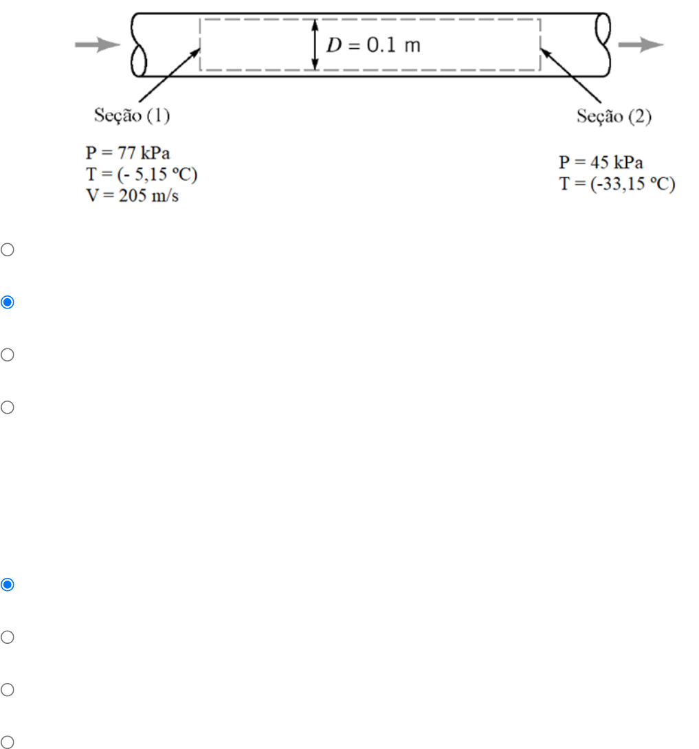 <p>ATIVIDADE OBJETIVA 8_2_2024</p><p>Iniciado: 6 out em 18:22</p><p>Instruções do teste</p><p></p><p>Pergunta 1 0,5 pts</p><p></p><p>Pergunta 2 0,5 pts</p><p>Ar escoa em regime permanente no tubo longo mostrado na figura. Levando em consideração as</p><p>pressões estáticas e temperaturas indicadas na figura, determinar a velocidade média na seção (2),</p><p>em (m/s), sabendo que a velocidade média do escoamento na seção (1) é igual a 205 m/s.</p><p>2,076 m/s</p><p>315,4 m/s</p><p>2258,00 m/s</p><p>222,4 m/s</p><p>Um escoamento de água passa através de uma tubulação de 3 cm de diâmetro com uma velocidade</p><p>de 40 ft/min. Determinar a vazão volumétrica do escoamento em (L/s). Considerar a massa</p><p>específica da água igual 1000 Kg/m .3</p><p>1,436 L/s</p><p>7,07 x 10 L/s-1</p><p>0,20332 L/s</p><p>1,436 x 10 L/s-1</p><p>06/10/2024, 21:15 Teste: ATIVIDADE OBJETIVA 8_2_2024</p><p>https://pucminas.instructure.com/courses/213550/quizzes/510325/take 1/5</p><p></p><p>Pergunta 3 0,5 pts</p><p></p><p>Pergunta 4 0,5 pts</p><p>Três tubos fornecem água em regime permanente a 20ºC para um tubo maior de saída mostrado na</p><p>figura. A velocidade V = 5m/s e a vazão de saída Q = 120 m /h. Determinar: a velocidade V em</p><p>(m/s) e a velocidade V em (m/s), se sabemos que aumentando Q em 20% Q aumentará em</p><p>10%.</p><p>2 4</p><p>3</p><p>1,</p><p>4, 3 4</p><p>5,89 m/s; 5,45 m/s</p><p>5,89 m/s; 5,24 m/s</p><p>5,45 m/s; 5,24 m/s</p><p>5,24 m/s; 5,89 m/s</p><p>Determinar a vazão mássica em (kg/s) e a vazão volumétrica em (m /s) do escoamento do óleo,</p><p>com densidade de 0,891, através de um duto de secção triangular de 5 cm de base e 3 cm de altura,</p><p>cuja velocidade vale 1,0 m/s.</p><p>3</p><p>1,3365 x 10 kg/s; 1,5 x 10 m /s-3 -3 3</p><p>0,668 kg/s; 7,5 x 10 m /s-4 3</p><p>6,68 x 10 kg/s; 7,5 x 10 m /s-4 -4 3</p><p>06/10/2024, 21:15 Teste: ATIVIDADE OBJETIVA 8_2_2024</p><p>https://pucminas.instructure.com/courses/213550/quizzes/510325/take 2/5</p><p></p><p>Pergunta 5 0,5 pts</p><p></p><p>Pergunta 6 0,5 pts</p><p></p><p>Pergunta 7 0,5 pts</p><p>1,3365 kg/s; 1,5 x 10 m /s-3 3</p><p>Um tanque contendo, inicialmente, 20 L de água foi completamente abastecido com uma vazão</p><p>volumétrica de 3 galões por minuto. Como o período de abastecimento foi de 4 minutos, determinar</p><p>o volume de água que entrou no tanque em (L), o volume total do tanque em (L), a massa de água</p><p>que entrou no tanque (kg) e a massa que já estava no tanque (kg) . Considerar a massa específica</p><p>da água igual 1000 Kg/m .3</p><p>4,54 L; 6,542 L; 4,54 kg; 2 kg</p><p>45,4 L; 65,42 L; 45,4 kg; 20 kg</p><p>454 L; 654,2 L; 454 kg; 200 kg</p><p>0,454 L; 0,6542 L; 4,54 kg; 2 kg</p><p>Em um tubo de Venturi horizontal, instala-se um manômetro diferencial de água. Desprezando as</p><p>perdas de energia e supondo constante o peso específico do ar ( = 1,3kgf/m ) e os diâmetros do</p><p>tubo (D = 500 mm, D = 300 mm), obter a vazão volumétrica de ar, em (m /s):</p><p>3</p><p>1 2</p><p>3</p><p>27,9 m /s.3</p><p>0,279 m /s;3</p><p>2,79 m /s;3</p><p>0,0279 m /s;3</p><p>Um sistema distribuidor de óleo é mostrado na figura. Na entrada “A”, a massa específica do óleo</p><p>vale 900 kg/m , a velocidade (suposto uniforme) vale 5 m/s e o diâmetro da tubulação é de 15 cm.3</p><p>06/10/2024, 21:15 Teste: ATIVIDADE OBJETIVA 8_2_2024</p><p>https://pucminas.instructure.com/courses/213550/quizzes/510325/take 3/5</p><p></p><p>Pergunta 8 0,5 pts</p><p>Na saída “B”, o fluido se resfria e a massa específica aumenta para 950 kg/m . A velocidade deixa</p><p>de ser uniforme e passa a ser indicada por v = 5 (1 – (r/R) ), onde R = 0,25 m. Na porta “C”, a massa</p><p>específica vale 1000 kg/m e a área vale 0,02 m .</p><p>Determinar:</p><p>1. A vazão mássica passando pelas estações “A”, “B” e “C”, em kg/s.</p><p>3</p><p>2</p><p>3 2</p><p>38,68 kg/s</p><p>900 kg/s</p><p>386,8 kg/s</p><p>90,0 kg/s</p><p>O escoamento permanente incompressível entre placas paralelas, conforme figura abaixo, tem</p><p>velocidade uniforme na entrada u = U 8cm/s. desenvolvendo-se a jusante em um perfil laminar</p><p>parabólico, , no qual a é uma constante. Se z 4 cm e o fluido é óleo SAE 30W,</p><p>a 20°C, determinar o valor de u em (cm/s).</p><p>o =</p><p>o =</p><p>max</p><p>12 cm/s</p><p>06/10/2024, 21:15 Teste: ATIVIDADE OBJETIVA 8_2_2024</p><p>https://pucminas.instructure.com/courses/213550/quizzes/510325/take 4/5</p><p>Salvo em 21:14</p><p>1,2 cm/s</p><p>0,12 cm/s</p><p>120 cm/s</p><p>Enviar teste</p><p>06/10/2024, 21:15 Teste: ATIVIDADE OBJETIVA 8_2_2024</p><p>https://pucminas.instructure.com/courses/213550/quizzes/510325/take 5/5</p>