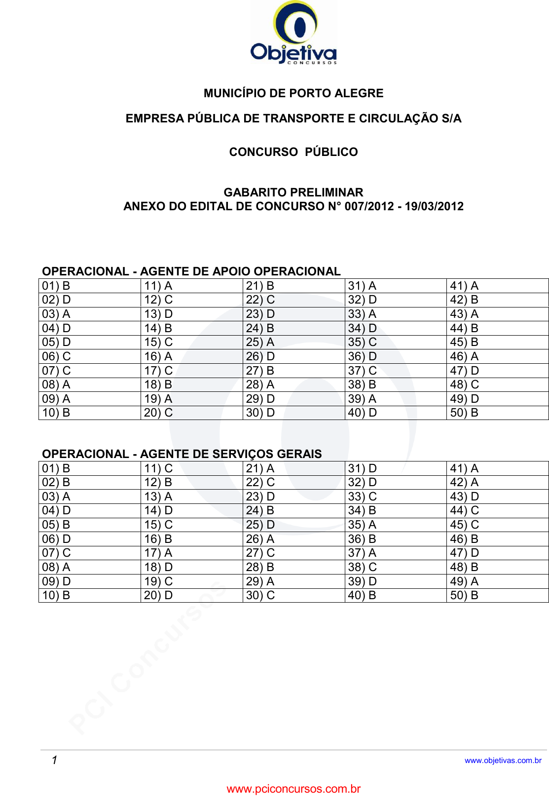 <p>pcimarkpci MDAwMDowMDAwOjAwMDA6MDAwMDowMDAwOmZmZmY6YzkwNzo4ZjQz:V2VkLCAyOCBBdWcgMjAyNCAxMTo0NToyMCAtMDMwMA==</p><p>www.pciconcursos.com.br</p><p>www.objetivas.com.br</p><p>1</p><p>MUNICÍPIO DE PORTO ALEGRE</p><p>EMPRESA PÚBLICA DE TRANSPORTE E CIRCULAÇÃO S/A</p><p>CONCURSO PÚBLICO</p><p>GABARITO PRELIMINAR</p><p>ANEXO DO EDITAL DE CONCURSO N° 007/2012 - 19/03/2012</p><p>OPERACIONAL - AGENTE DE APOIO OPERACIONAL</p><p>01) B 11) A 21) B 31) A 41) A</p><p>02) D 12) C 22) C 32) D 42) B</p><p>03) A 13) D 23) D 33) A 43) A</p><p>04) D 14) B 24) B 34) D 44) B</p><p>05) D 15) C 25) A 35) C 45) B</p><p>06) C 16) A 26) D 36) D 46) A</p><p>07) C 17) C 27) B 37) C 47) D</p><p>08) A 18) B 28) A 38) B 48) C</p><p>09) A 19) A 29) D 39) A 49) D</p><p>10) B 20) C 30) D 40) D 50) B</p><p>OPERACIONAL - AGENTE DE SERVIÇOS GERAIS</p><p>01) B 11) C 21) A 31) D 41) A</p><p>02) B 12) B 22) C 32) D 42) A</p><p>03) A 13) A 23) D 33) C 43) D</p><p>04) D 14) D 24) B 34) B 44) C</p><p>05) B 15) C 25) D 35) A 45) C</p><p>06) D 16) B 26) A 36) B 46) B</p><p>07) C 17) A 27) C 37) A 47) D</p><p>08) A 18) D 28) B 38) C 48) B</p><p>09) D 19) C 29) A 39) D 49) A</p><p>10) B 20) D 30) C 40) B 50) B</p><p>www.pciconcursos.com.br</p><p>pcimarkpci MDAwMDowMDAwOjAwMDA6MDAwMDowMDAwOmZmZmY6YzkwNzo4ZjQz:V2VkLCAyOCBBdWcgMjAyNCAxMTo0NToyMCAtMDMwMA==</p><p>www.pciconcursos.com.br</p><p>www.objetivas.com.br</p><p>2</p><p>OPERACIONAL - PINTOR</p><p>01) B 11) A 21) B 31) A 41) B</p><p>02) D 12) C 22) C 32) D 42) A</p><p>03) A 13) D 23) D 33) A 43) D</p><p>04) D 14) B 24) B 34) C 44) D</p><p>05) D 15) C 25) A 35) D 45) A</p><p>06) C 16) A 26) D 36) C 46) B</p><p>07) C 17) C 27) B 37) B 47) D</p><p>08) A 18) B 28) A 38) D 48) C</p><p>09) A 19) A 29) D 39) B 49) D</p><p>10) B 20) C 30) D 40) C 50) B</p><p>OPERACIONAL - SERRALHEIRO</p><p>01) B 11) A 21) B 31) A 41) A</p><p>02) D 12) C 22) C 32) B 42) B</p><p>03) A 13) D 23) D 33) C 43) D</p><p>04) D 14) B 24) B 34) D 44) C</p><p>05) D 15) C 25) A 35) A 45) C</p><p>06) C 16) A 26) D 36) B 46) B</p><p>07) C 17) C 27) B 37) C 47) D</p><p>08) A 18) B 28) A 38) D 48) C</p><p>09) A 19) A 29) D 39) C 49) D</p><p>10) B 20) C 30) D 40) D 50) B</p><p>TÉCNICO ADMINISTRATIVO I - AGENTE ADMINISTRATIVO</p><p>01) D 11) A 21) D 31) B 41) B</p><p>02) D 12) A 22) C 32) C 42) D</p><p>03) A 13) B 23) A 33) A 43) C</p><p>04) C 14) B 24) B 34) B 44) A</p><p>05) A 15) D 25) B 35) A 45) D</p><p>06) B 16) B 26) D 36) D 46) A</p><p>07) D 17) A 27) D 37) B 47) C</p><p>08) A 18) D 28) B 38) A 48) B</p><p>09) D 19) A 29) C 39) C 49) C</p><p>10) C 20) C 30) D 40) D 50) B</p><p>www.pciconcursos.com.br</p><p>pcimarkpci MDAwMDowMDAwOjAwMDA6MDAwMDowMDAwOmZmZmY6YzkwNzo4ZjQz:V2VkLCAyOCBBdWcgMjAyNCAxMTo0NToyMCAtMDMwMA==</p><p>www.pciconcursos.com.br</p><p>www.objetivas.com.br</p><p>3</p><p>TÉCNICO ADMINISTRATIVO I - AGENTE DE APOIO TÉCNICO</p><p>01) D 11) A 21) D 31) B 41) B</p><p>02) D 12) A 22) C 32) C 42) D</p><p>03) A 13) B 23) A 33) A 43) C</p><p>04) C 14) B 24) B 34) B 44) B</p><p>05) A 15) D 25) B 35) A 45) A</p><p>06) B 16) B 26) D 36) D 46) C</p><p>07) D 17) A 27) D 37) B 47) A</p><p>08) A 18) D 28) B 38) A 48) D</p><p>09) D 19) A 29) C 39) C 49) B</p><p>10) C 20) C 30) D 40) D 50) B</p><p>TÉCNICO ADMINISTRATIVO I - AGENTE DE ATENDIMENTO AO PÚBLICO</p><p>01) D 11) A 21) D 31) B 41) B</p><p>02) D 12) A 22) C 32) C 42) D</p><p>03) A 13) B 23) A 33) A 43) D</p><p>04) C 14) B 24) B 34) B 44) B</p><p>05) A 15) D 25) B 35) A 45) A</p><p>06) B 16) B 26) D 36) D 46) C</p><p>07) D 17) A 27) D 37) B 47) A</p><p>08) A 18) D 28) B 38) A 48) D</p><p>09) D 19) A 29) C 39) C 49) B</p><p>10) C 20) C 30) D 40) D 50) B</p><p>TÉCNICO ADMINISTRATIVO I - AGENTE DE FISCALIZAÇÃO DE TRÂNSITO E</p><p>TRANSPORTE</p><p>01) D 11) C 21) D 31) A 41) D</p><p>02) C 12) A 22) D 32) C 42) B</p><p>03) C 13) A 23) A 33) B 43) D</p><p>04) A 14) B 24) B 34) A 44) A</p><p>05) B 15) D 25) C 35) C 45) A</p><p>06) D 16) C 26) C 36) D 46) C</p><p>07) A 17) C 27) C 37) A 47) B</p><p>08) B 18) D 28) D 38) D 48) C</p><p>09) D 19) C 29) A 39) C 49) D</p><p>10) D 20) C 30) D 40) B 50) D</p><p>www.pciconcursos.com.br</p><p>pcimarkpci MDAwMDowMDAwOjAwMDA6MDAwMDowMDAwOmZmZmY6YzkwNzo4ZjQz:V2VkLCAyOCBBdWcgMjAyNCAxMTo0NToyMCAtMDMwMA==</p><p>www.pciconcursos.com.br</p><p>www.objetivas.com.br</p><p>4</p><p>TÉCNICO ADMINISTRATIVO I - ELETRICISTA</p><p>01) B 11) B 21) A 31) C 41) B</p><p>02) B 12) C 22) B 32) A 42) A</p><p>03) C 13) D 23) C 33) C 43) D</p><p>04) B 14) C 24) A 34) A 44) B</p><p>05) C 15) B 25) B 35) B 45) A</p><p>06) A 16) B 26) A 36) B 46) D</p><p>07) D 17) A 27) B 37) D 47) A</p><p>08) A 18) B 28) D 38) A 48) D</p><p>09) D 19) C 29) A 39) C 49) B</p><p>10) D 20) C 30) C 40) D 50) B</p><p>TÉCNICO ADMINISTRATIVO II - ELETROTÉCNICO</p><p>01) B 11) B 21) D 31) A 41) A</p><p>02) B 12) C 22) A 32) C 42) D</p><p>03) C 13) D 23) B 33) A 43) B</p><p>04) B 14) C 24) C 34) B 44) B</p><p>05) C 15) B 25) D 35) D 45) C</p><p>06) A 16) B 26) B 36) C 46) D</p><p>07) D 17) A 27) C 37) B 47) A</p><p>08) A 18) B 28) A 38) D 48) C</p><p>09) D 19) C 29) D 39) A 49) B</p><p>10) D 20) A 30) B 40) D 50) A</p><p>TÉCNICO ADMINISTRATIVO II - INSPETOR DE SEGURANÇA VEICULAR</p><p>01) B 11) B 21) B 31) C 41) B</p><p>02) B 12) C 22) C 32) D 42) A</p><p>03) C 13) D 23) B 33) B 43) C</p><p>04) B 14) C 24) D 34) D 44) B</p><p>05) C 15) B 25) D 35) A 45) A</p><p>06) A 16) B 26) B 36) B 46) B</p><p>07) D 17) A 27) C 37) D 47) B</p><p>08) A 18) B 28) A 38) B 48) D</p><p>09) D 19) B 29) A 39) A 49) C</p><p>10) D 20) D 30) B 40) C 50) A</p><p>www.pciconcursos.com.br</p><p>pcimarkpci MDAwMDowMDAwOjAwMDA6MDAwMDowMDAwOmZmZmY6YzkwNzo4ZjQz:V2VkLCAyOCBBdWcgMjAyNCAxMTo0NToyMCAtMDMwMA==</p><p>www.pciconcursos.com.br</p><p>www.objetivas.com.br</p><p>5</p><p>TÉCNICO ADMINISTRATIVO II - TÉCNICO DE ENFERMAGEM DO TRABALHO</p><p>01) D 11) A 21) A 31) D 41) D</p><p>02) C 12) B 22) D 32) C 42) C</p><p>03) D 13) B 23) B 33) C 43) D</p><p>04) D 14) D 24) C 34) B 44) A</p><p>05) A 15) D 2