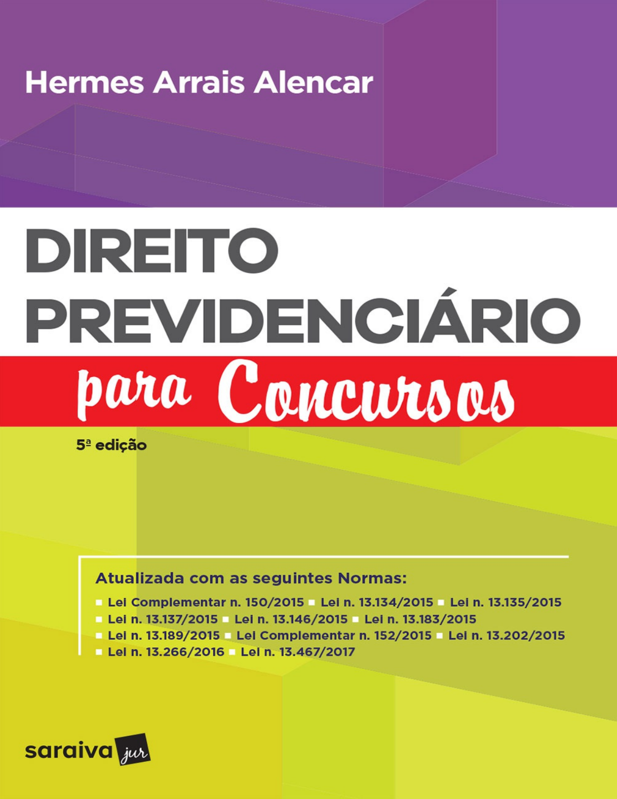 <p>ISBN 9788547233631</p><p>Alencar, Hermes Arrais</p><p>Direito previdenciário para concursos / Hermes Arrais Alencar. – 5. ed. – São Paulo : Saraiva Educação, 2018.</p><p>1. Direito previdenciário 2. Direito previdenciário – Brasil I. Título.</p><p>18-0216 CDU 34:368.4(81)</p><p>Índices para catálogo sistemático:</p><p>1. Brasil : Direito previdenciário 34:368.4(81)</p><p>Vice-presidente Claudio Lensing</p><p>Diretora editorial Flávia Alves Bravin</p><p>Conselho editorial</p><p>Presidente Carlos Ragazzo</p><p>Consultor acadêmico Murilo Angeli</p><p>Gerência</p><p>Planejamento e novos projetos Renata Pascoal Müller</p><p>Concursos Roberto Navarro</p><p>Legislação e doutrina Thaís de Camargo Rodrigues</p><p>Edição Liana Ganiko Brito Catenacci | Patricia Quero</p><p>Produção editorial Ana Cristina Garcia (coord.) | Luciana Cordeiro Shirakawa | Rosana Peroni Fazolari</p><p>Arte e digital Mônica Landi (coord.) | Claudirene de Moura Santos Silva | Guilherme H. M. Salvador | Tiago Dela Rosa</p><p>| Verônica Pivisan Reis</p><p>Planejamento e processos Clarissa Boraschi Maria (coord.) | Juliana Bojczuk Fermino | Kelli Priscila Pinto | Marília</p><p>Cordeiro | Fernando Penteado | Tatiana dos Santos Romão</p><p>Novos projetos Laura Paraíso Buldrini Filogônio</p><p>Diagramação (Livro Físico) NSM Soluções Gráficas Ltda.</p><p>Revisão Lílian Moreira</p><p>Comunicação e MKT Elaine Cristina da Silva</p><p>Capa Tiago Dela Rosa</p><p>Livro digital (E-pub)</p><p>Produção do e-pub Guilherme Henrique Martins Salvador</p><p>Data de fechamento da edição: 6-3-2018</p><p>Dúvidas?</p><p>Acesse www.editorasaraiva.com.br/direito</p><p>Nenhuma parte desta publicação poderá ser reproduzida por qualquer meio ou forma sem a prévia autorização da Editora</p><p>Saraiva.</p><p>A violação dos direitos autorais é crime estabelecido na Lei n. 9.610/98 e punido pelo artigo 184 do Código Penal.</p><p>SUMÁRIO</p><p>Introdução - Dicas de Estudo</p><p>1. Seguridade Social</p><p>1.1. Histórico DA Seguridade Social</p><p>1.1.1. Saúde</p><p>1.1.2. Assistência social</p><p>1.1.2.1. Benefício de Prestação Continuada (BPC) da Assistência Social (art. 203, V, da CF)</p><p>1.1.2.2. BPC é devido a estrangeiros residentes no Brasil?</p><p>1.1.3. Previdência Social</p><p>1.1.3.a. Histórico da Previdência. Aspecto mundial</p><p>1.1.3.b. Histórico da Previdência no Brasil</p><p>1.1.3.1. Legislação previdenciária. Conteúdo, fontes, autonomia</p><p>1.1.3.1.a. Validade. Vigência e eficácia</p><p>1.1.3.1.b. Aplicação das normas previdenciárias</p><p>1.1.3.1.b.1. Eficácia da lei previdenciária no tempo: direito adquirido</p><p>1.1.3.1.b.2. Eficácia da lei previdenciária no tempo: expectativa de direito</p><p>1.1.3.1.b.3. Eficácia da lei previdenciária no tempo: regra de transição</p><p>1.1.3.1.b.4. Eficácia da lei previdenciária no espaço</p><p>1.1.3.1.c. Interpretação das normas previdenciárias</p><p>1.1.3.1.d. Integração</p><p>1.1.3.2. Instituto Nacional do Seguro Social</p><p>1.1.3.2.a. Via recursal administrativa</p><p>1.1.3.2.b. Prévio requerimento administrativo: Condição necessária para ajuizamento de ação</p><p>1.1.3.3. Regime Geral e Próprio de Previdência Social</p><p>1.1.3.4. Agentes públicos e a filiação previdenciária</p><p>1.1.3.4.a. Agentes políticos</p><p>1.1.3.4.b. Servidores estatais</p><p>1.1.3.4.b.1. Servidores públicos</p><p>1.1.3.4.b.2. Cargos exclusivamente em comissão</p><p>1.1.3.4.b.3. Empregados públicos</p><p>1.1.3.4.b.4. Servidores temporários</p><p>1.1.3.4.c. Particulares em colaboração com a Administração Pública</p><p>1.1.3.5. Previdência complementar</p><p>1.1.4. Princípios constitucionais da Seguridade Social</p><p>1.1.4.1. Universalidade da cobertura e do atendimento</p><p>1.1.4.2. Uniformidade e equivalência dos benefícios e serviços às populações urbanas e rurais</p><p>1.1.4.3. Seletividade e distributividade na prestação dos benefícios e serviços</p><p>1.1.4.4. Irredutibilidade do valor dos benefícios</p><p>1.1.4.4.1. Manutenção do valor real dos benefícios</p><p>1.1.4.5. Equidade na forma de participação no custeio</p><p>1.1.4.6. Diversidade na base de financiamento</p><p>1.1.4.7. Caráter democrático e descentralizado da administração</p><p>1.2. Hora de gabaritar</p><p>2. Do Financiamento da Seguridade Social</p><p>2.1. Da contribuição da União</p><p>2.2. Das outras receitas de Seguridade Social</p><p>2.3. Contribuições sociais para a Seguridade Social</p><p>2.3.1. Contribuições de Seguridade Social – referibilidade</p><p>2.3.2. Contribuição Social – espécie tributo – teoria pentapartida</p><p>2.3.3. Receita Federal do Brasil</p><p>2.3.4. Princípios tributários aplicáveis às Contribuições Sociais de Seguridade Social</p><p>2.3.4.1. Princípio da anterioridade</p><p>2.3.4.2. Princípio da legalidade</p><p>2.3.4.2.a. Princípio da legalidade. Principais embates judiciais</p><p>2.3.5. Imunidade, isenção, anistia e remissão – contribuições previdenciárias</p><p>2.3.6. Prescrição e decadência</p><p>2.3.7. Contribuições previdenciárias</p><p>2.3.7.1. Da contribuição da empresa incidente sobre a folha de salários</p><p>2.3.7.2. Aspecto subjetivo</p><p>2.3.7.2.a. Sujeito ativo da relação tributária</p><p>2.3.7.2.b. Sujeito passivo da exação</p><p>2.3.7.2.b.1. Contribuinte e responsável tributário</p><p>2.3.7.3. Aspecto temporal</p><p>2.3.7.4. Fato gerador in abstracto</p><p>2.3.7.5. Aspecto espacial</p><p>2.3.7.6. Aspecto quantitativo</p><p>2.3.7.6.a. Base de cálculo</p><p>2.3.7.6.a.1. Base de cálculo diferenciada (Lei n. 13.202/2015: condutor autônomo de</p><p>veículo rodoviário)</p><p>2.3.7.6.b. Alíquota</p><p>2.3.7.6.b.1. Instituições financeiras</p><p>2.3.7.6.b.2. Serviços prestados por cooperativa de trabalho</p><p>2.3.8. Retenção – Lei n. 9.711/98 – art. 31 da Lei n. 8.212/91</p><p>2.3.9. Contribuição do SA