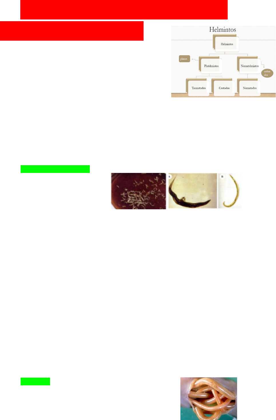 <p>NEMATODOS INTESTINALES DE PENETRACIÓN BUCAL</p><p>· Forma de gusanos = Larvas</p><p>· Mas comunes</p><p>· Fácil reconhecimento</p><p>· Cuerpo cilíndrico y grande não segmentado</p><p>· Presente em todo tubo digestivo</p><p>· DX: Ovos nas fezes</p><p>· Sist. Diges. Completo y Aparato reprodutor muy desarrollado y sexo separados</p><p>· Ampla distribución ampla, mais frequente tropical</p><p>· ADULTOS: Sint. Diges., anemia, perda de apetite, enfraquecimento, debilidade…</p><p>· CRIANÇAS: Sint. Diges. Deficit cognitiva, Baixo crescim. Peso</p><p>OXIURIASIS o ENTROBIASIS</p><p>· AGENTE ETIOLÓGICO: Enterobius vermicularis</p><p>· Pequeno e branco</p><p>· La femea vive 3 meses, es mayor que machos, región perianal o ropa interior, tamaño 1 cm, Extremo puntiagudo.</p><p>· Mais frequente en niños que en adultos</p><p>· Diseminação entre humanos sem passar por terra.</p><p>· Inicia por ingestão de ovos embrionados, via oral ou inalado.</p><p>· Larvas sai do ovo no Intestino Delgado y desarrolla em adultos de 2-6 semanas</p><p>· Sobrevivem no pó acumulado e cortinas...</p><p>MANIFESTAÇÕES CLINICAS:</p><p>· Alguns son assintomáticos, Prurito (Coceira) intensa em la region perianal, Cansaço.</p><p>· A coceira pode causar infecção bacteriana</p><p>· Podem migrar pra vagina causando problemas Genitourinario</p><p>· Gusanos aderidos a parad intes. Puede provocar inflamacion y granulomas alredor de los ovos</p><p>DX:</p><p>· Detección de huevos en la mucosa anal.</p><p>· A veces en las heces suelen observarse los gusanos adultos.</p><p>· Algodón anal con superficie adhesiva, los huevos se peguen para examinarlos al microscopio.</p><p>· Se recomienda realizar cuando el niño despierta, antes del baño o defecación.</p><p>· Es raro encontrar huevos en las heces.</p><p>ASCARIASIS</p><p>· Agente etiológico: Ascaris lumbricoides.</p><p>· Grandes e rosa</p><p>· Se encontra no Intestino Delgado y no se fixa en la mucosa</p><p>· Viven en media 1 año</p><p>· Ovos resistentes a altas temperaturas, sobrevivem en las heces u aguas residuales</p><p>MANIFESTAÇÕES CLINICAS:</p><p>· Ingeston de poucos ovos não causa síntomas</p><p>· Los gusanos pueden migrar ao conducto biliar, fígado e causar dano tissular</p><p>· Puede perforar el intestino y provocar una peritonitis con infección bacteriana secundaria.</p><p>· La migración de las larvas a los pulmones puede producir una neumonitis.</p><p>· Puede haber una eosinofilia.</p><p>· Puede ocurrir obstrucción, perforación y oclusión del apéndice.</p><p>· Dolor abdominal, fiebre, distensión del abdomen y vómitos.</p><p>DX:</p><p>· Examen directo nas heces, con huevos fecundados y no fecundados.</p><p>· En ocasiones se eliminan gusanos adultos en las heces.</p><p>· La fase pulmonar puede DX por hallazgo de larvas y eosinófilos en el esputo.</p><p>TRICHURIASIS</p><p>· Amplia distribución geográfica.</p><p>· Predomina en las zonas cálidas y húmedas de los países tropicales.</p><p>· El agente etiológico se localiza en el colon.</p><p>MANIFESTAÇÕES CLINICAS:</p><p>· La mayoría es leve y personas asintomáticas.</p><p>· En infecciones medianas e intensas se produce dolor cólico, diarrea sanguinolenta, distensión abdominal, debilidad, pérdida de peso.</p><p>· En las formas más graves y especialmente en los niños desnutridos, hay disentería y ocasionalmente prolapso rectal.</p><p>· Las cabezas de estos helmintos pueden penetrar a las mucosas intestinales.</p><p>· Las infecciones graves pueden cursar también con eosinofilia y anemia.</p><p>DX:</p><p>· Se observan huevos en las muestras de heces.</p><p>NEMATODOS INTESTINALES DE PENETRACIÓN CUTÁNEA</p><p>ANQUILOSTOMIASIS</p><p>· Agentes etiológicos: 2 tipos (Ancylostoma duodenale) y (Necátor americanus)</p><p>· Son gusanos cilíndricos de color blanco, (hembras 2 mm a 4 mm más de longitud que los machos y son más gruesas.</p><p>· Las larvas rabditiformes salen de los huevos en la tierra, se mueven y se alimentan.</p><p>· Las larvas fllariformcs se adhieren a la piel.</p><p>CICLO BIOLOGICO</p><p>La larva filariforme penetra en la piel intacta del hombre</p><p>Pasa al torrente sanguíneo</p><p>Es transportado a los pulmones</p><p>Luego de dos semanas se transforman en filariformes</p><p>Sale del ap. Resp a través de la tos, se deglute y va al I.D. se transforma en gusano adulto.</p><p>La hembra pone huevos que son liberados en las heces.</p><p>En contacto con el suelo las larvas rabditiformes salen de los huevos.</p><p>· La patología se produce en cuatro niveles de acuerdo a las etapas ele invasión y actividad de los parásitos:</p><p>Piel – Eritema</p><p>Pulmones – Reacción Inflam.</p><p>Intestino – Fijación Mecanica</p><p>Anemia – Succión Hemorragia</p><p>MANIFESTACIONES CLÍNICAS</p><p>· La penetración cutánea puede producir una lesión eritematosa pruriginosa.</p><p>· Por lo general ocurre entre los dedos de los pies y puede persistir por varios días.</p><p>· La migración a los pulmones origina neumonitis y eosinofilia.</p><p>· Los gusanos adultos producen síntomas gastrointestinales, nauseas, vómitos y diarrea.</p><p>· Febrículas transitorias.</p><p>· Anemia microcítica.</p><p>DX</p><p>· Examen de las heces muestran huevos segmentados y no teñidos de bilis.</p><p>· No hay larvas en las muestras de heces.</p><p>ESTRONGILOIDOSIS</p><p>· Agente etiológico: Strongiloides stercoralis</p><p>· Las formas adultas de Strongyloides stercoralis miden 2 mm de longitud.</p><p>· Se ha comprobado que la hembra tiene capacidad de autofecundarse (partenogénesis), y puede vivir en el intestino hasta cinco años.</p><p>· Las larvas nacen en el intestino antes que los huevos salgan al exterior con las heces.</p><p>· Las larvas pueden madurar hasta la fase filariforme y causar autoinfección.</p><p>· Es posible un ciclo no parasitario de vida libre fuera del hospedador humano.</p><p>· Requiere 