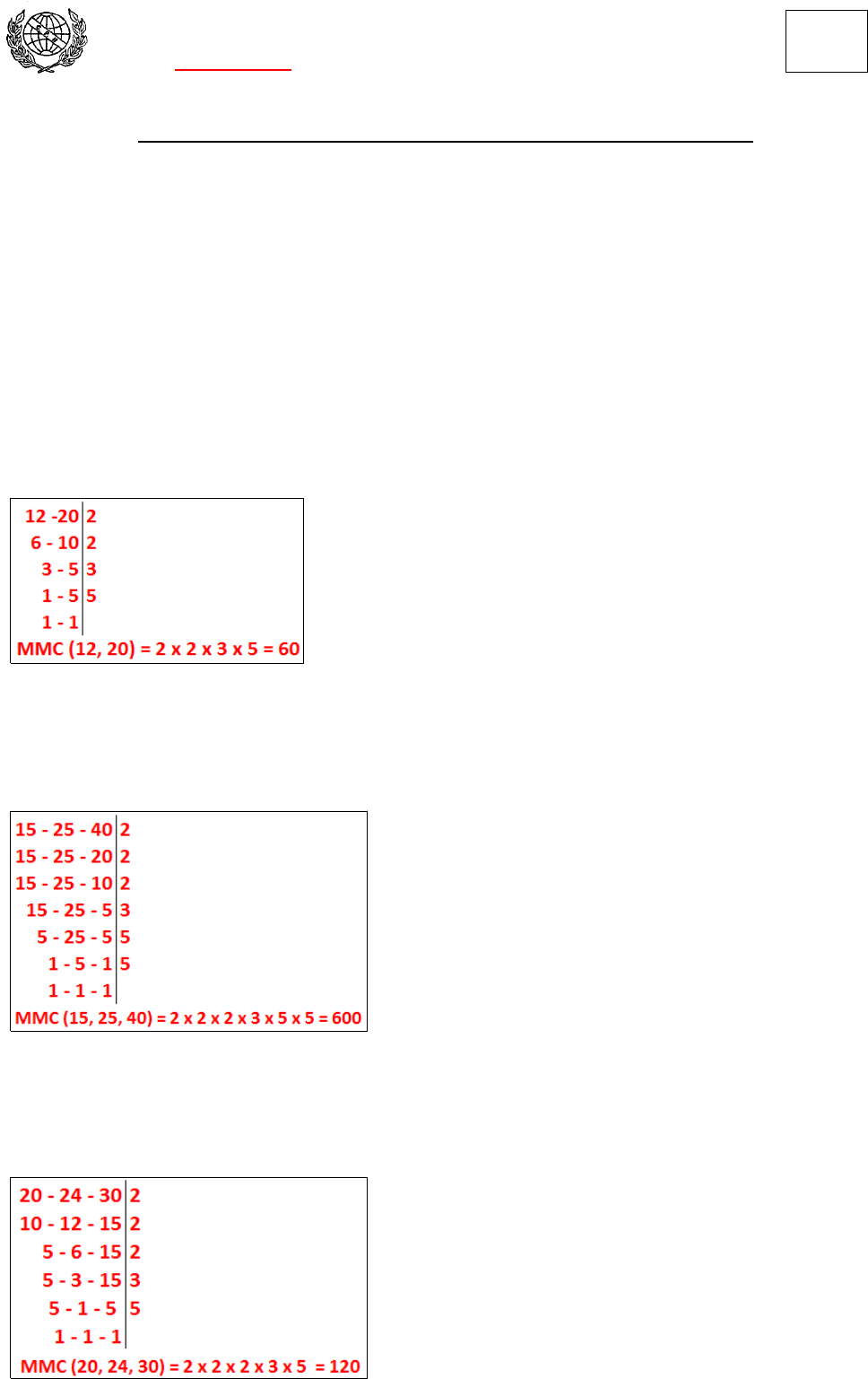 <p>Colégio Pedro II – Campus Humaitá I</p><p>Nome: GABARITO</p><p>5º ano - Turma: ________ Data: ___/____/____</p><p>Problemas envolvendo MMC e MDC (Faça os cálculos no caderno)</p><p>1. Vovó foi viajar com a Tuma da melhor idade do bairro. O número de pessoas está entre 60 e 100. Quantos havia na viagem, se podemos contar as pessoas de 8 em 8 ou de 10 em 10?</p><p>Solução. Se as pessoas podem ser contadas de 8 em 8 ou de 10 em 10, então o número de pessoas é múltiplo de 8 e 10 ao mesmo tempo. O múltiplo comum entre 60 e 100 é 80. Logo, há 80 pessoas na viagem.</p><p>2. Duas pessoas, fazendo exercícios diários, partem simultaneamente de um mesmo ponto e, andado, contornam uma pista oval que circunda um jardim. Uma dessas pessoas dá uma volta completa em 12 minutos. A outra, andando mais devagar, leva 20 minutos para completar a volta. Depois de quantos minutos essas duas pessoas voltarão a se encontrar no mesmo ponto de partida?</p><p>Solução. A pessoa que leva 12 minutos, passa pelo ponto de partida no tempo múltiplo de 12: 24 minutos, 36 minutos, etc. A outra pessoa, em múltiplos de 20: 40 minutos, 60 minutos, etc. Elas passarão pelo ponto de partida juntas sempre nos múltiplos comuns entre 12 e 20. A primeira vez em que essa situação ocorrerá será no MMC(12, 20). Isto é após 60 minutos ou 1 hora.</p><p>3. Um relógio A bate a cada 15 minutos, outro relógio B bate a cada 25 minutos, e um terceiro relógio C a cada 40 minutos. Qual é, em horas, o menor intervalo de tempo decorrido entre duas batidas simultâneas dos três relógios?</p><p>Solução. O menor intervalo será o menor múltiplo comum entre 15, 25 e 40. Logo, baterão juntos pela primeira vez após 600 minutos ou 10 horas.</p><p>4. Três luminosos acendem em intervalos regulares. O primeiro a cada 20 segundos, o segundo, a cada 24 segundos e o terceiro a cada 30 segundos. Se, em um dado instante, os três acenderem ao mesmo tempo, depois de quantos segundos os luminosos voltarão a acender simultaneamente?</p><p>Solução. Os três luminosos voltarão a acender juntos pela primeira vez no menor múltiplo comum entre 20, 24 e 30. Isto é, após 120 segundos ou 2 minutos.</p><p>5. A estação rodoviária de uma cidade é o ponto de partida das viagens intermunicipais. De uma plataforma da estação, a cada 15 minutos partem um ônibus da viação Sol, com destino a cidade paraíso. Os ônibus da viação Lua partem da plataforma vizinha cada 18 minutos, com destino a cidade Porta do Céu. Se, às 8 horas os dois ônibus partirem simultaneamente, a que horas os dois ônibus partirão juntos novamente?</p><p>Solução. O MMC (15, 18) = 90. Os dois ônibus partirão juntos após 90 minutos ou 1h 30min após as 8 horas. Logo, partirão juntos às 9h 30min.</p><p>6. De um aeroporto partem, todos os dias, três aviões que fazem rotas internacionais. O primeiro avião faz a rota em 4 dias, o segundo em 5 dias e o terceiro, em 10 dias. Se, certo dia, os três aviões partirem simultaneamente, depois de quantos dias esses aviões esses aviões partirão novamente no mesmo dia?</p><p>Solução. O MMC (4, 5, 10) = 20. Os três aviões partiram juntos novamente após 20 dias.</p><p>7. Ao separar o total de suas figurinhas, em grupos de 12, de 15 e 20, Caio observou que sobravam sempre 7 figurinhas fora dos grupos. Se o total de figurinhas for compreendido entre 200 e 300, qual será a soma dos algarismos do número de figurinhas de Caio?</p><p>Solução. O total de figurinhas de Caio será um múltiplo comum entre 12, 15 e 20 entre 200 e 300, mas adicionado de 7 unidades (o resto). O múltiplo de 60 maior que 200 e menor que 300 é 240. Logo, Caio possui (240 + 7) = 247 figurinhas. A soma dos algarismos é 2 + 4 + 7 = 13.</p><p>8. Numa classe há 28 meninos e 21 meninas. A professora quer formar grupos só de meninos ou só de meninas, com a mesma quantidade de alunos e usando ao maior quando possível.</p><p>a) quantos alunos terão cada um desses grupos? Cada grupo terá 7 alunos.</p><p>b) quantos grupos de meninas pedem ser formados? Serão formados 21 ÷ 7 = 3 grupos de meninas.</p><p>c) quantos grupos de meninos? Serão formados 28 ÷ 7 = 4 grupos de meninos.</p><p>Solução. A quantidade de meninos e meninas em cada grupo será o maior divisor comum entre 28 e 21. Isto é, o MDC(28, 21).</p><p>9. Em classe existem menos de 40 alunos. Se o professor de Educação Física resolve formar grupos de 6 alunos, ou de 10 alunos, ou de 15 alunos, sempre sobra um aluno. Quantos alunos têm a classe?</p><p>a) 41 alunos b) 30 alunos c) 31 alunos d) 21 alunos</p><p>Solução. O menor múltiplo comum entre 6, 10 e 15 vale 30. Já é menor que 40. Como sempre sobra um, o número de alunos é (30 + 1) = 31 alunos.</p><p>10. Para o casamento de sua filha Bernadete, dona Fátima encomendou 600 rosas, 300 margaridas e 225 cravos. Ela quer fazer arranjos de flores para enfeitar o salão de festas, sem deixar sobrar nenhuma flor. Todos os arranjos devem ser iguais e, para isso, devem ter o mesmo número de rosas, de margaridas e também de cravos. Desejando montar o maior número possível de arranjos, quantas flores dona Fátima deve colocar em cada um?</p><p>Solução. A quantidade de flores em cada arranjo será o maior divisor comum entre 600, 300 e 225. Isto é, o MDC(600, 300, 225). Em cada arranjo haverá 15 flores.</p><p>- Serão montados (600 ÷ 15) = 40 arranjos de rosas;</p><p>- Serão montados (300 ÷ 15) = 20 arranjos de margaridas;</p><p>- Serão montados (225 ÷ 15) = 15 arranjos de cravos;</p><p>11. Um cesto contém maçãs, em número menor que 150. Distribuindo-se as maçãs em sacos, formando grupos de 7, sobrarão 3 maçãs. Distribuindo-se de 5 em 5, também sobrarão 3 maçãs. Sabendo que se as maçãs forem distribuídas de 11 em 11 não sobrará nenhuma maçã, calcule o número de sacos necessários para essa distribuição.</p><p>Solução. O número procurado é múltiplo de 11 (resto zer