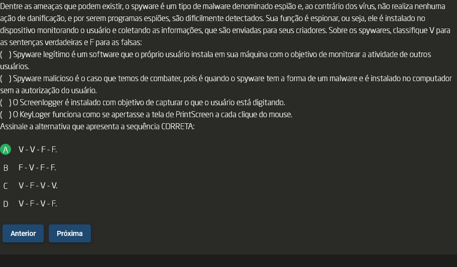 <p>Dentre as ameaças que podem existir, spyware é um tipo de malware denominado espião e, ao contrário dos vírus, não realiza nenhuma ação de danificação, e por serem programas espiões, são dificilmente detectados. Sua função é espionar, ou seja, ele é instalado no dispositivo monitorando usuário e coletando as informações, que são enviadas para seus criadores. Sobre os spywares, classifique V para as sentenças verdadeiras e F para as falsas: ( ) Spyware legítimo é um software que próprio usuário instala em sua máquina com objetivo de monitorar a atividade de outros usuários. ( ) Spyware malicioso é caso que temos de combater, pois é quando 0 spyware tem a forma de um malware e é instalado no computador sem a autorização do usuário. ( ) Screenlogger é instalado com objetivo de capturar 0 que usuário está digitando. ( ) KeyLoger funciona como se apertasse a tela de PrintScreen a cada clique do mouse. Assinale a alternativa que apresenta a CORRETA: A V-V-F-F B C V-F V V. D V-F-V-F Anterior Próxima</p>